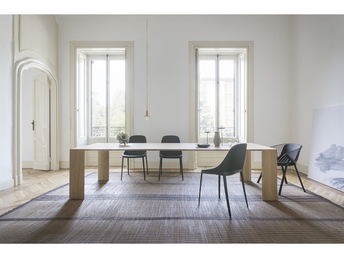 Hiwood to stół z litego dębu, gatunku cenionego za naturalność materiału. Stabilność Hiwood gwarantuje ukryta konstrukcja, stalowe ściągacze i podcięcia, które oprócz nadawania sztywności, pozwalają na wyrafinowane i precyzyjne połączenia. Rezultatem jest projekt o silnym duchu technicznym, który kojarzy się z eleganckim stołem: w swoim designie, w technice, w klasycyzmie.