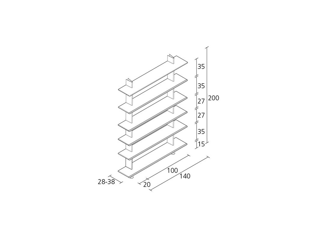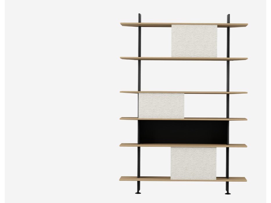 Regał ze słupkami z malowanego aluminium i półkami ze sklejki fornirowanej dębem. Dostępny w kolorach: naturalnego dębu, lakierowanego dębu (bielony, orzech Canaletto, ciemny, jesion szary) lub lakierowanego. Dostępna w dwóch głębokościach: 28 cm lub 38 cm. AKCESORIA: istnieje możliwość dodania paneli przednich i tylnych (półki są już przygotowane).