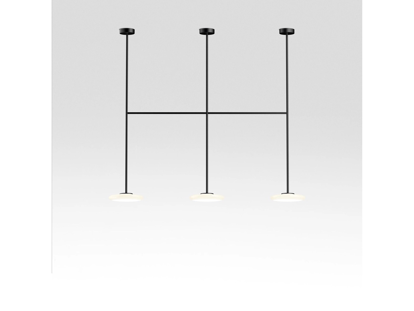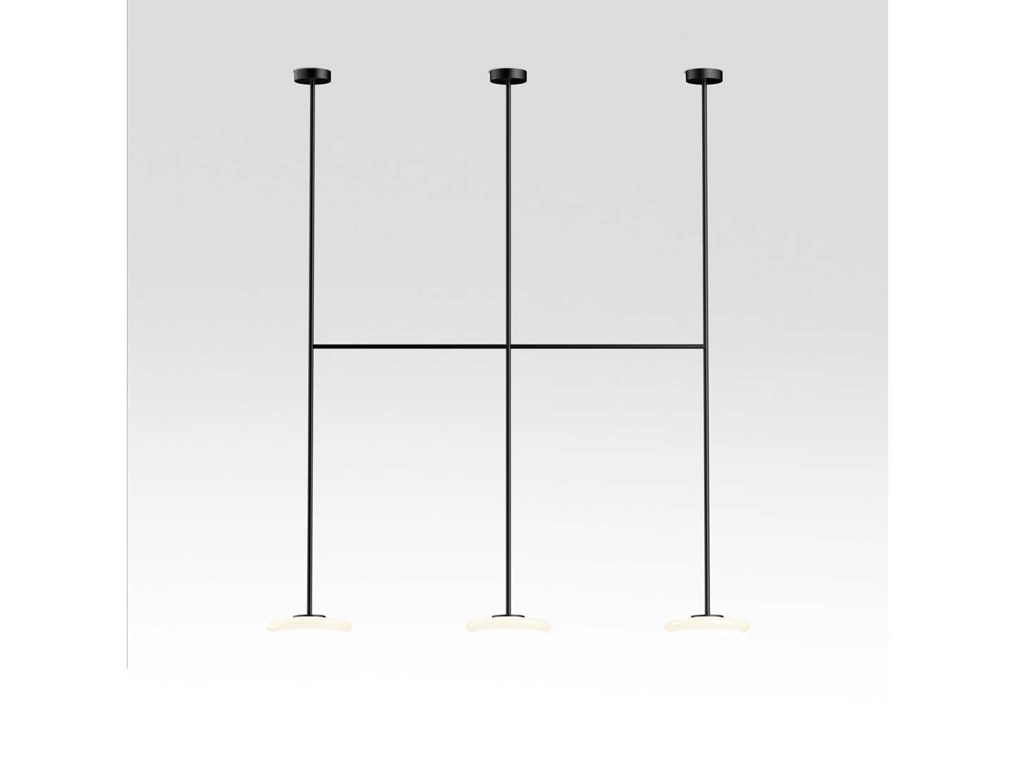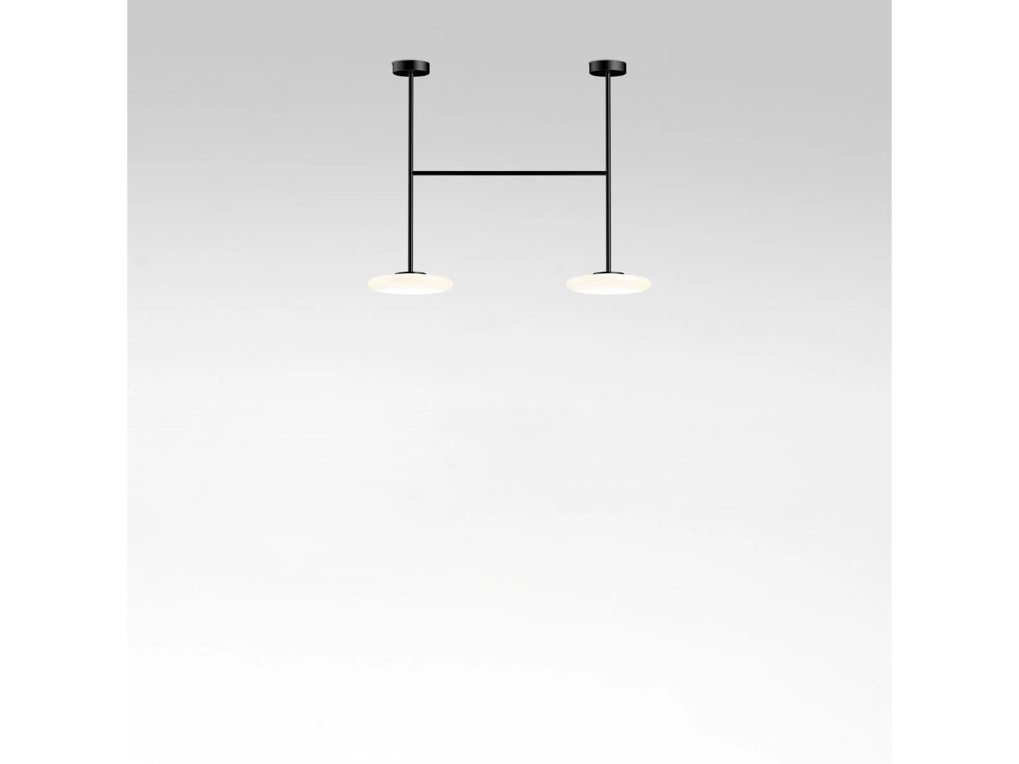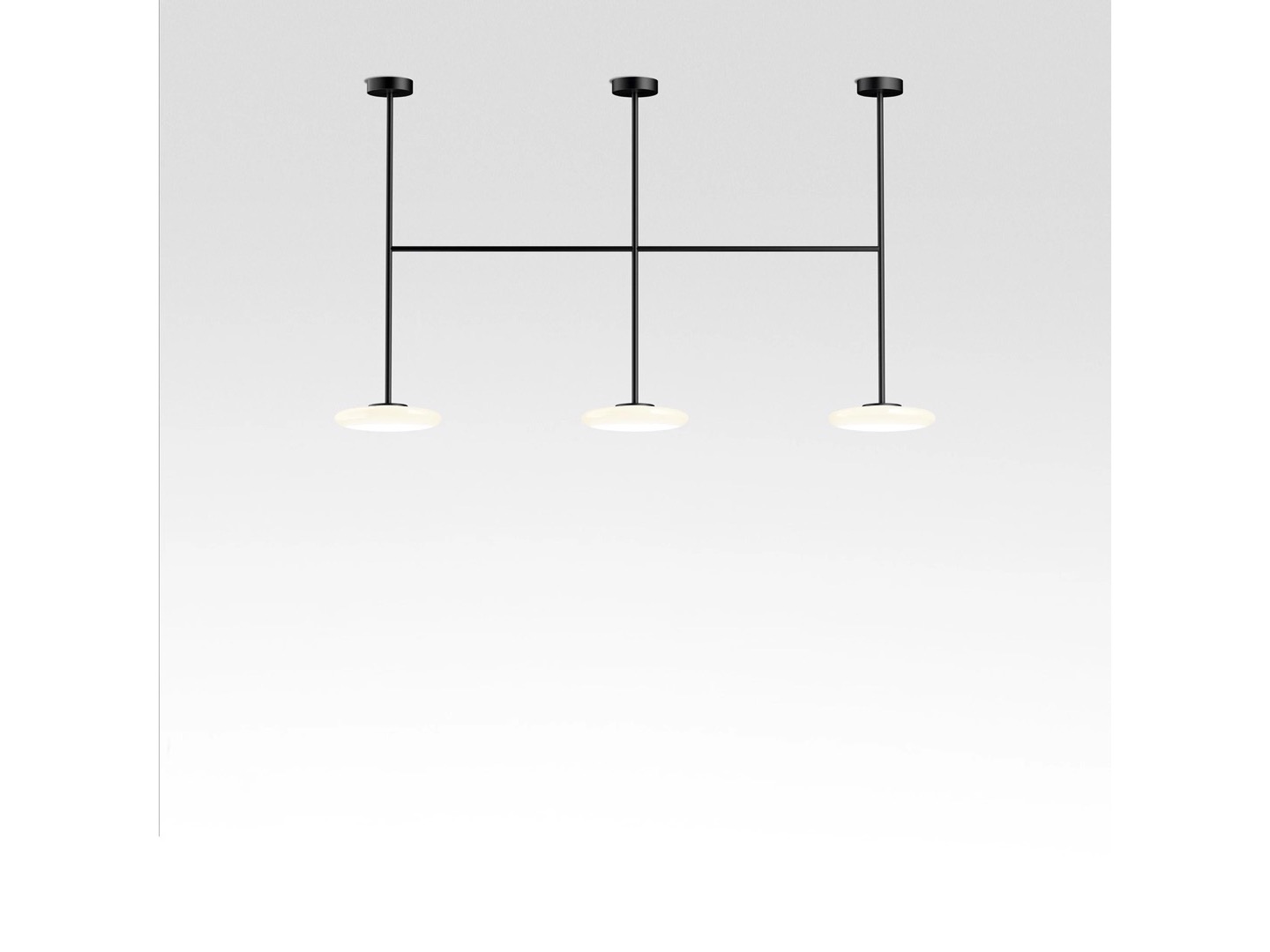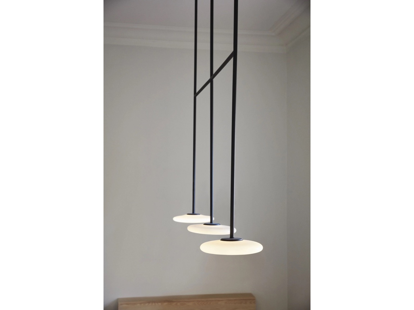Ihana to system oświetleniowy składający się z kilku dyfuzorów z opalowego dmuchanego szkła, które kontrastują z solidnością metalowej konstrukcji.