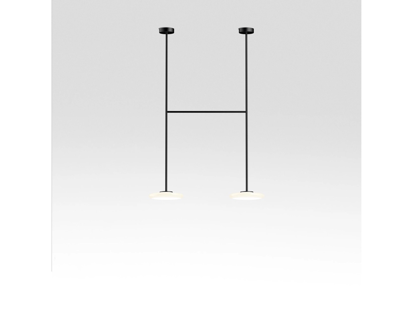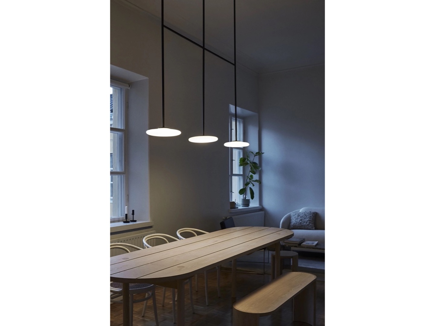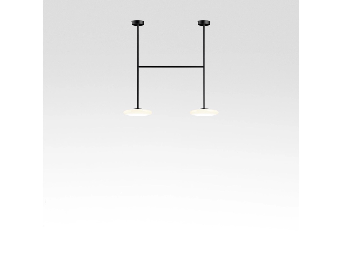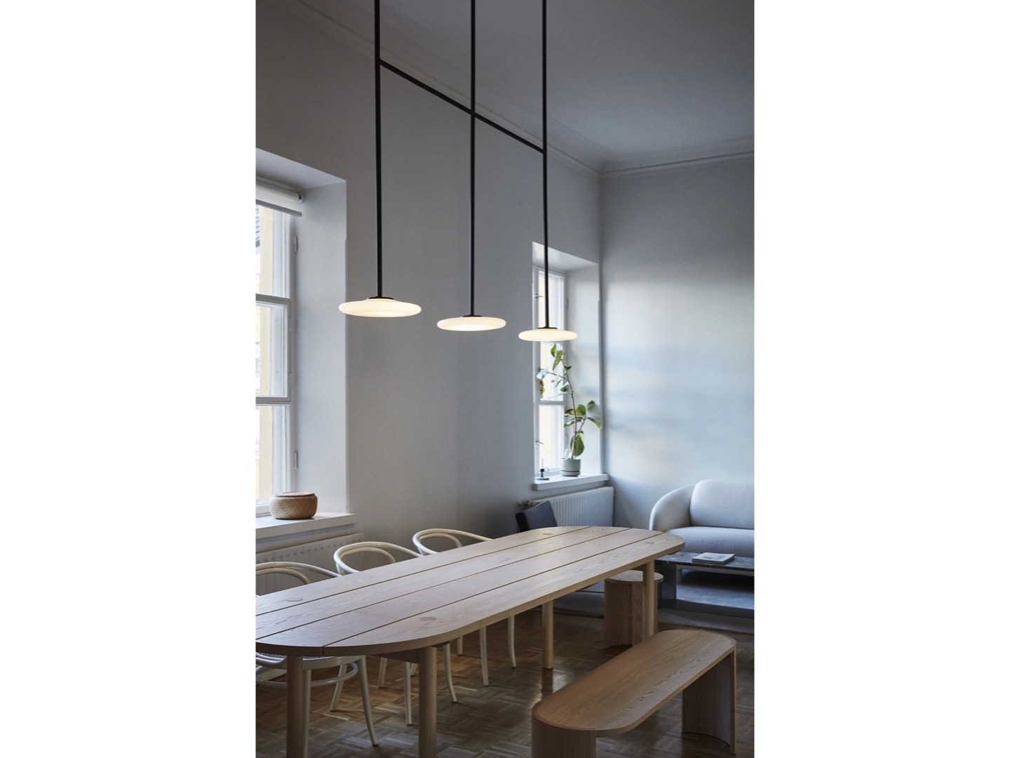 Ihana to system oświetleniowy składający się z kilku dyfuzorów z opalowego dmuchanego szkła, które kontrastują z solidnością metalowej konstrukcji.
