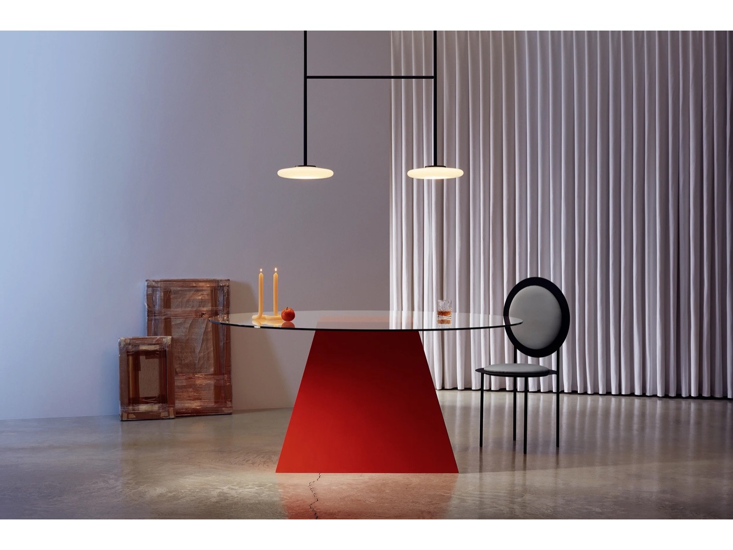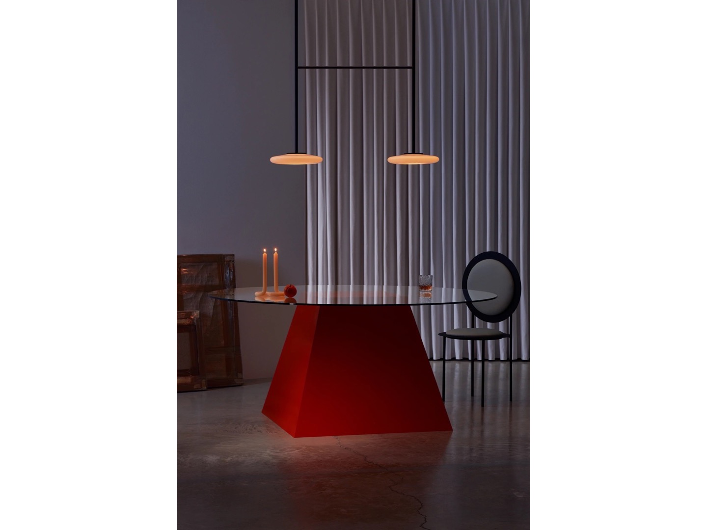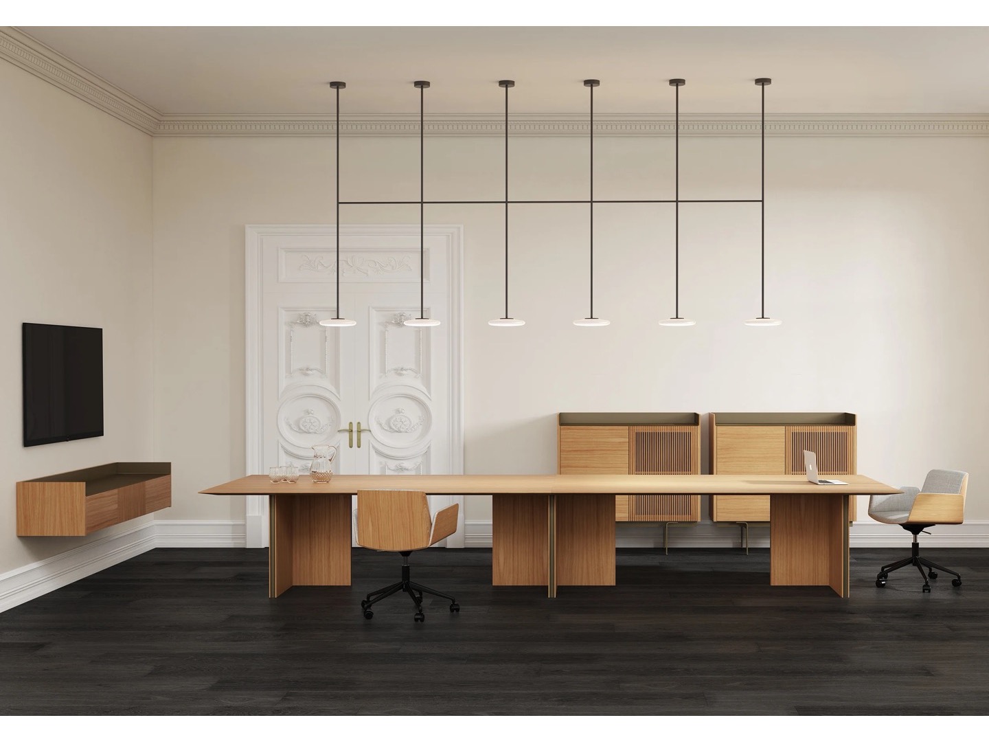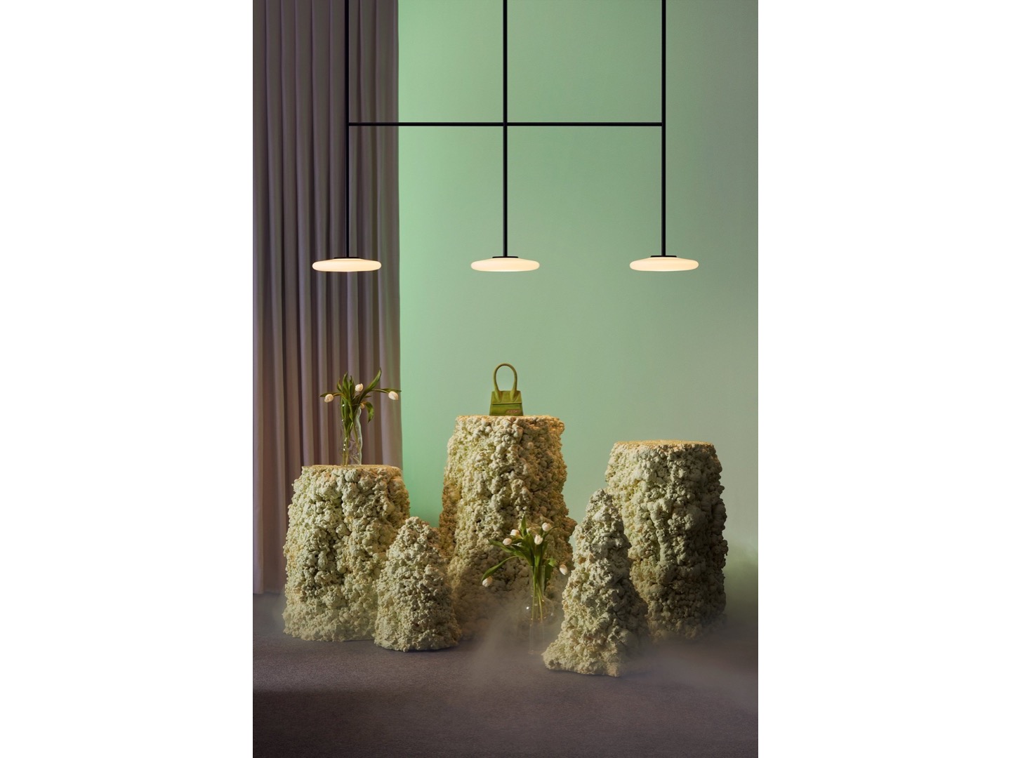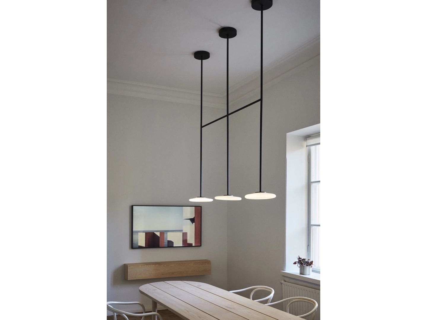 Ihana to system oświetleniowy składający się z kilku dyfuzorów z opalowego dmuchanego szkła, które kontrastują z solidnością metalowej konstrukcji.