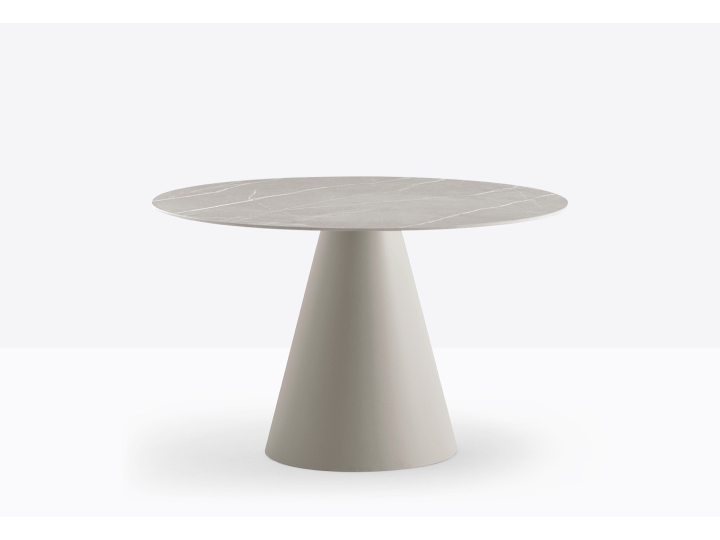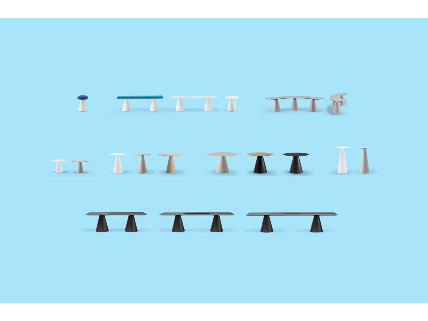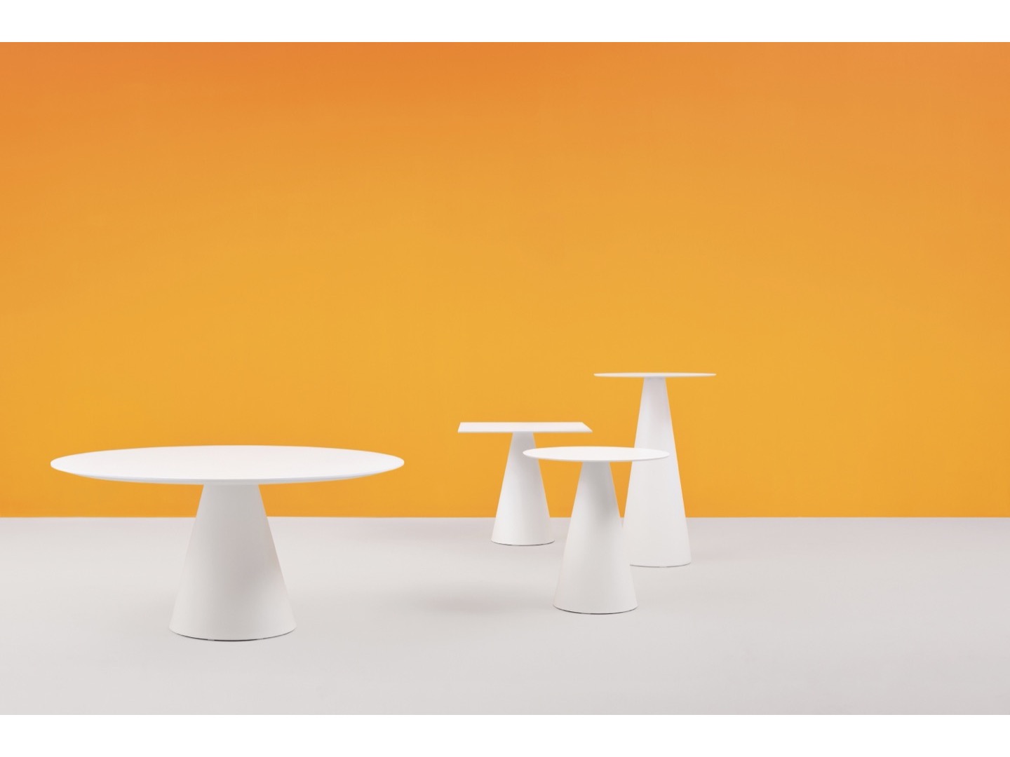 Ikon przemawia językiem architektury w jej maksymalnym wyrazie prostoty. Stolik kawowy ze stożkową podstawą z formowanego wtryskowo polipropylenu, który można łączyć z okrągłymi szklanymi blatami o różnych rozmiarach i wykończeniach.
