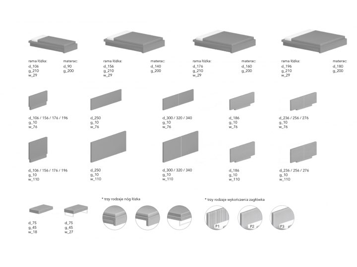 Dostępne są trzy rodzaje wezgłowi: pełne jednoelementowe mocowane do ramy łóżka oraz zagłówki w postaci paneli montowanych na ścianie niezależnie od łóżka – w wersji pionowej i poziomej.