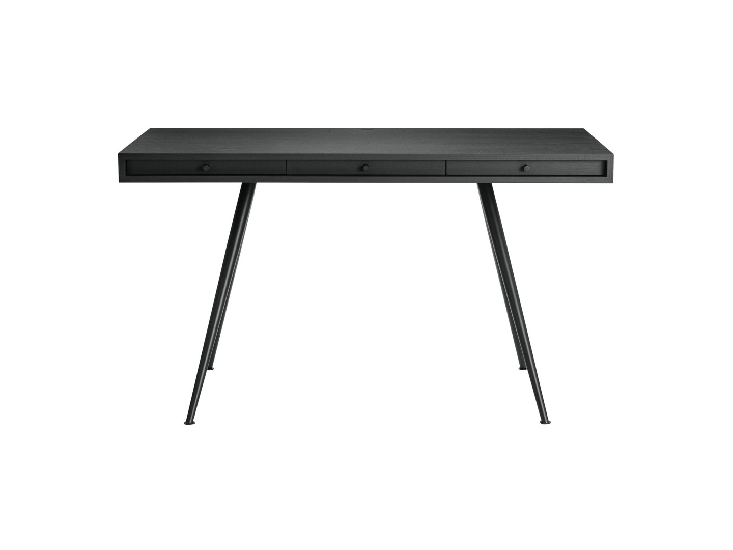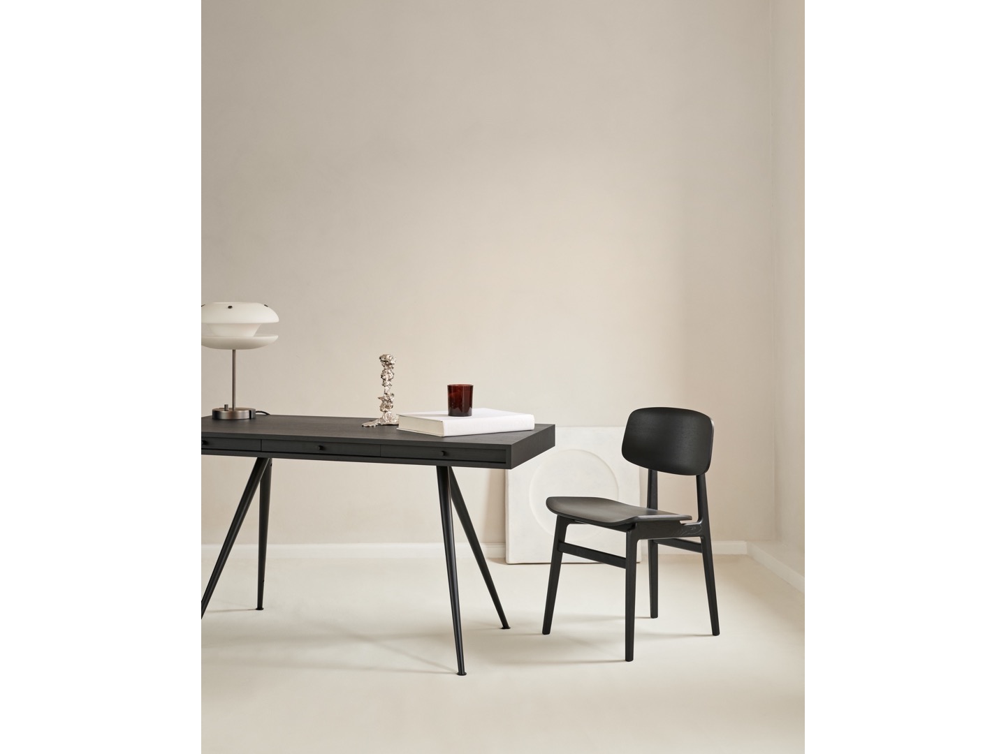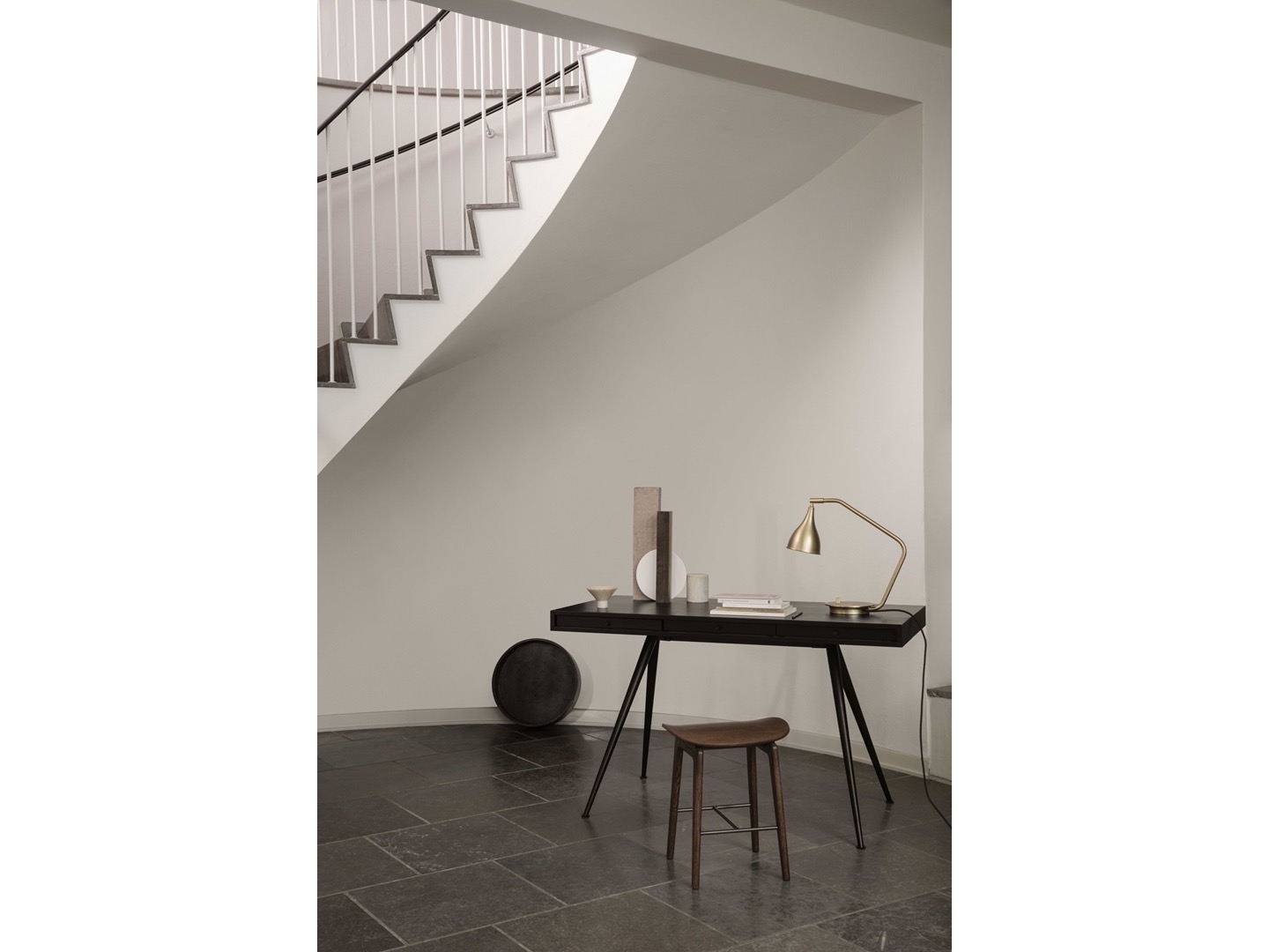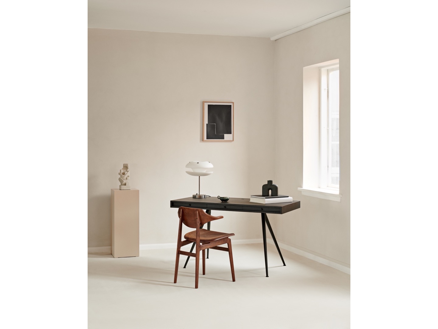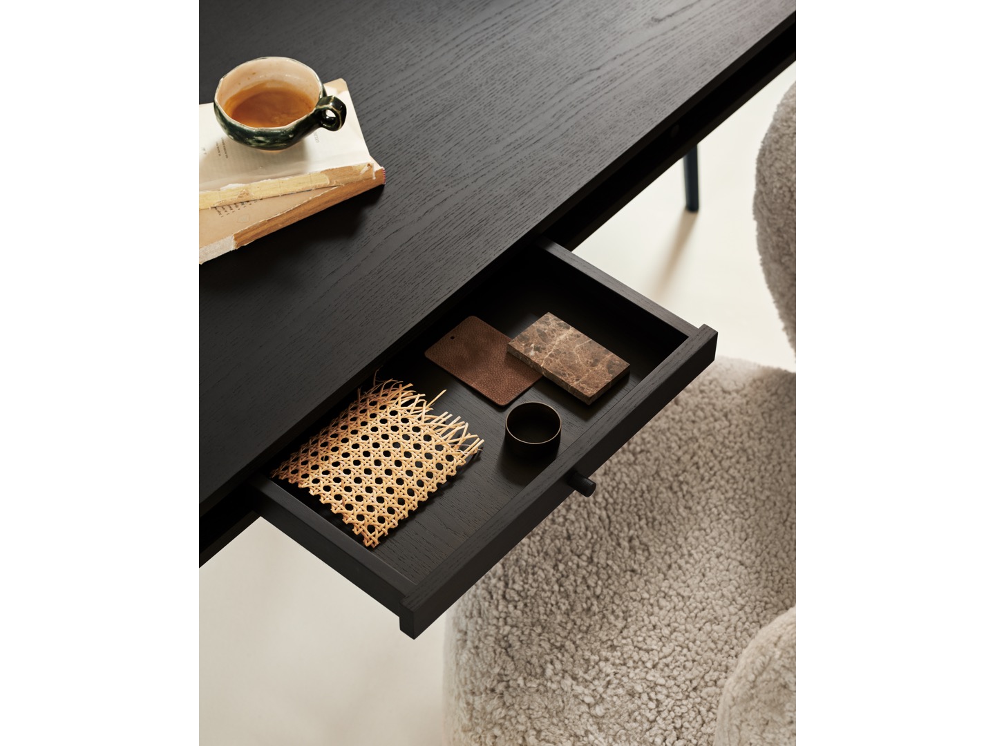 Dzięki czystemu i uproszczonemu wzornictwu inspirowane latami 60. biurko JFK jest przeznaczone do stylowego domowego biura. Nazwa jest hołdem dla klasycznego duńskiego projektu podarowanego prezydentowi Johnowi F. Kennedy'emu w latach 60. XX wieku. Biurko ma smukły blat z jesionowego forniru z trzema wbudowanymi szufladami i stoi elegancko ustawiony na czterech stożkowych, malowanych proszkowo na czarno aluminiowych nogach. Każda szuflada ma małe pokrętło z radełkowaną fakturą, nawiązujące do starych przycisków radiowych Jaguara. W blacie znajduje się ukryte miejsce na power bank, co ułatwia zasilenie laptopa, lampy stołowej czy smartfona. Kabel z listwy zasilającej można wyprowadzić przez mały otwór w nogach, tworząc eleganckie biurko bez plątaniny kabli na podłodze.