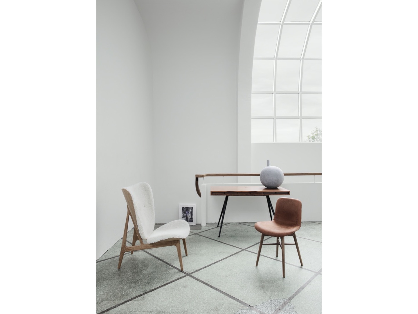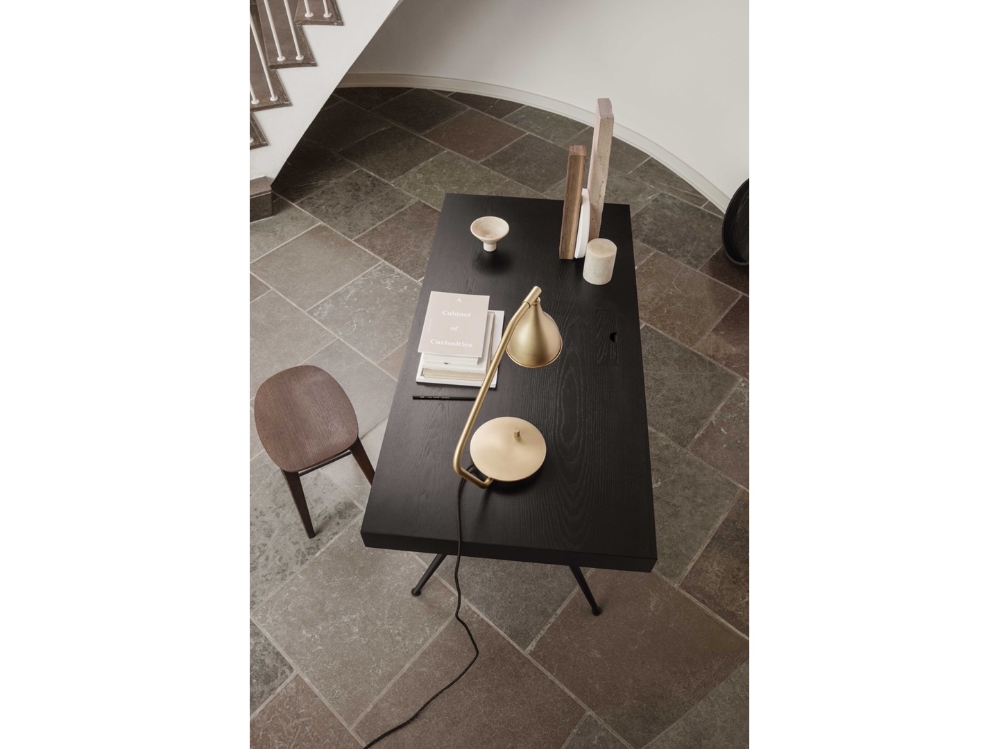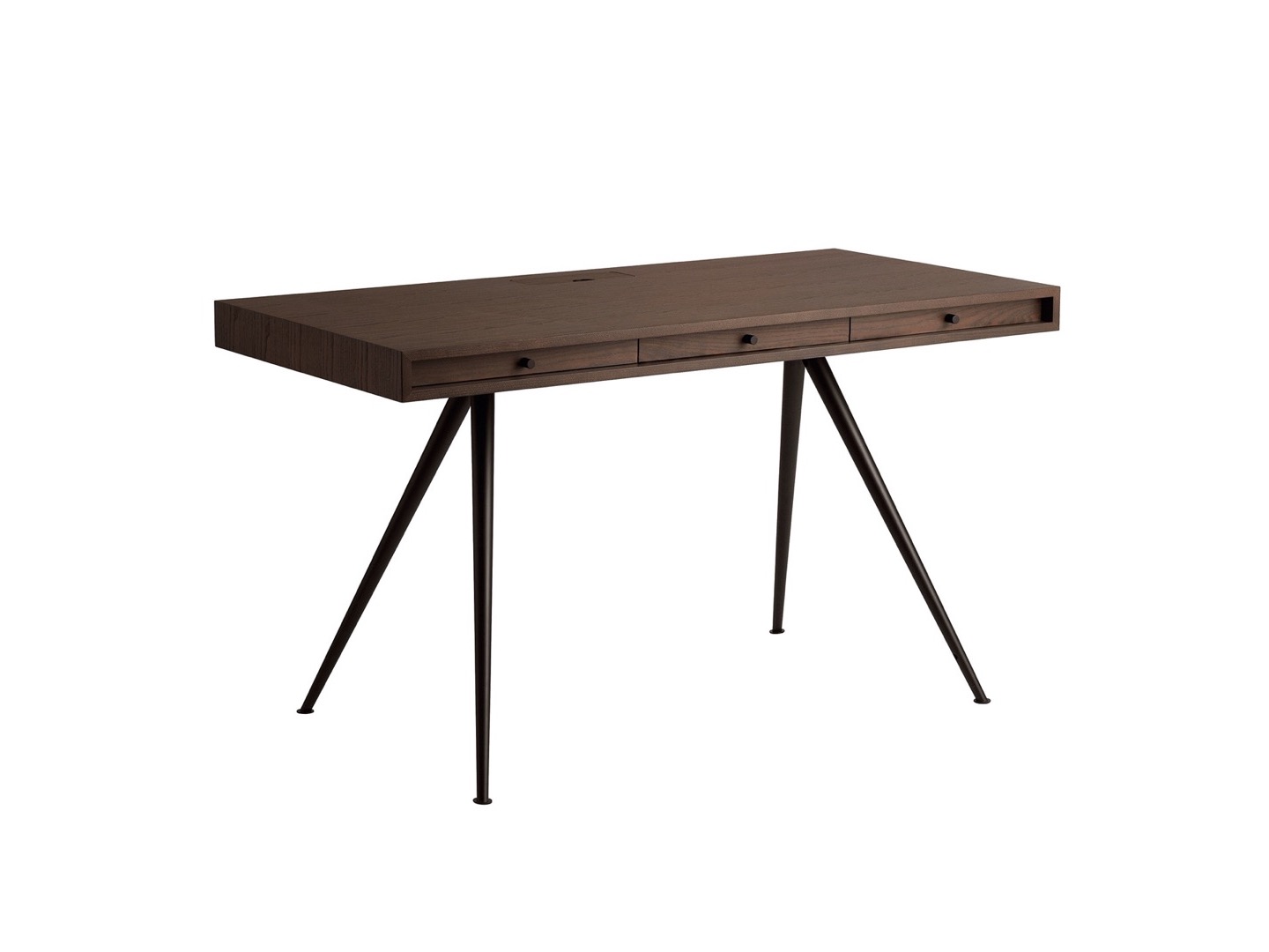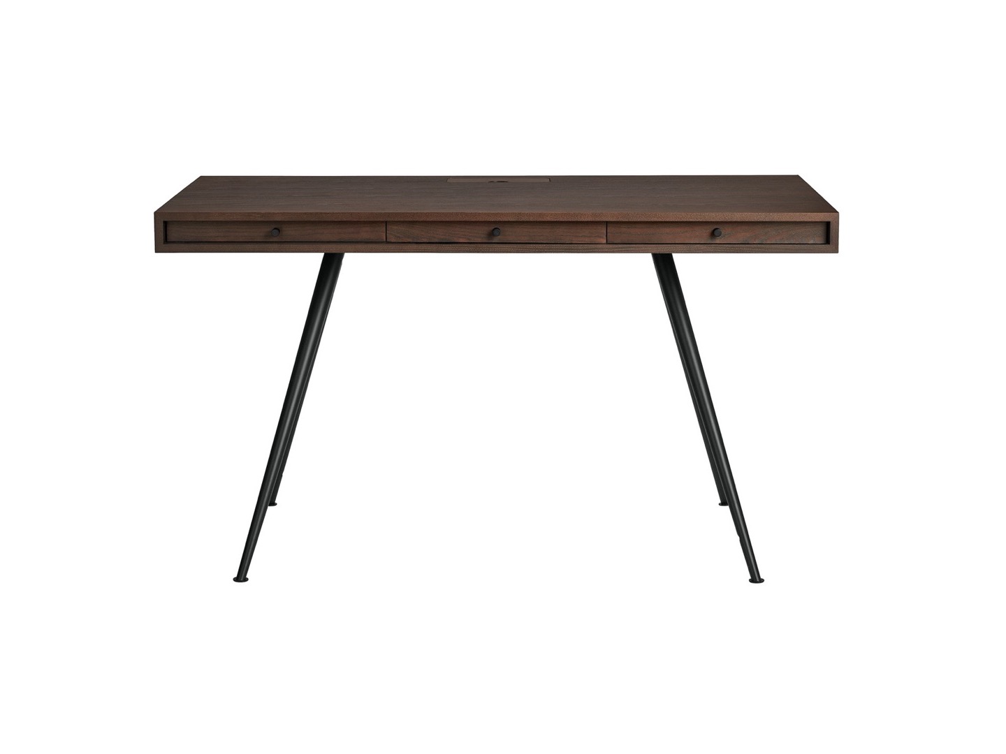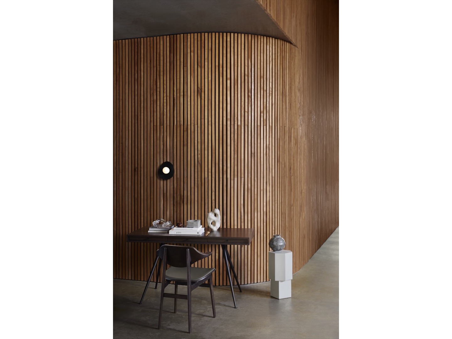 Dzięki czystemu i uproszczonemu wzornictwu inspirowane latami 60. biurko JFK jest przeznaczone do stylowego domowego biura. Nazwa jest hołdem dla klasycznego duńskiego projektu podarowanego prezydentowi Johnowi F. Kennedy'emu w latach 60. XX wieku. Biurko ma smukły blat z jesionowego forniru z trzema wbudowanymi szufladami i stoi elegancko ustawiony na czterech stożkowych, malowanych proszkowo na czarno aluminiowych nogach. Każda szuflada ma małe pokrętło z radełkowaną fakturą, nawiązujące do starych przycisków radiowych Jaguara. W blacie znajduje się ukryte miejsce na power bank, co ułatwia zasilenie laptopa, lampy stołowej czy smartfona. Kabel z listwy zasilającej można wyprowadzić przez mały otwór w nogach, tworząc eleganckie biurko bez plątaniny kabli na podłodze.
