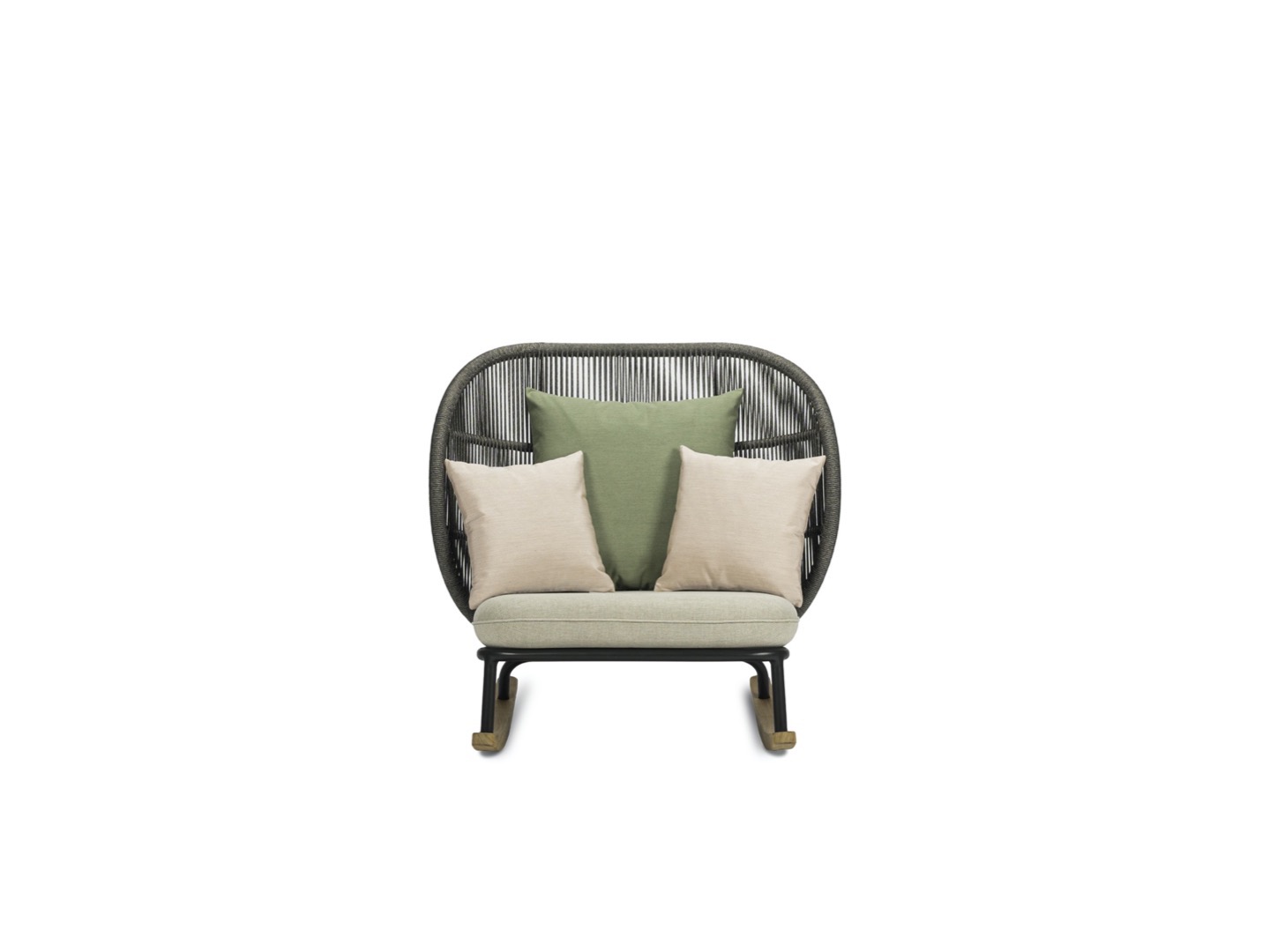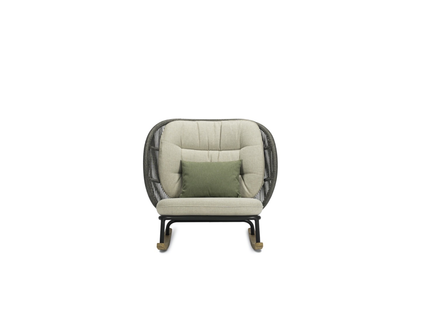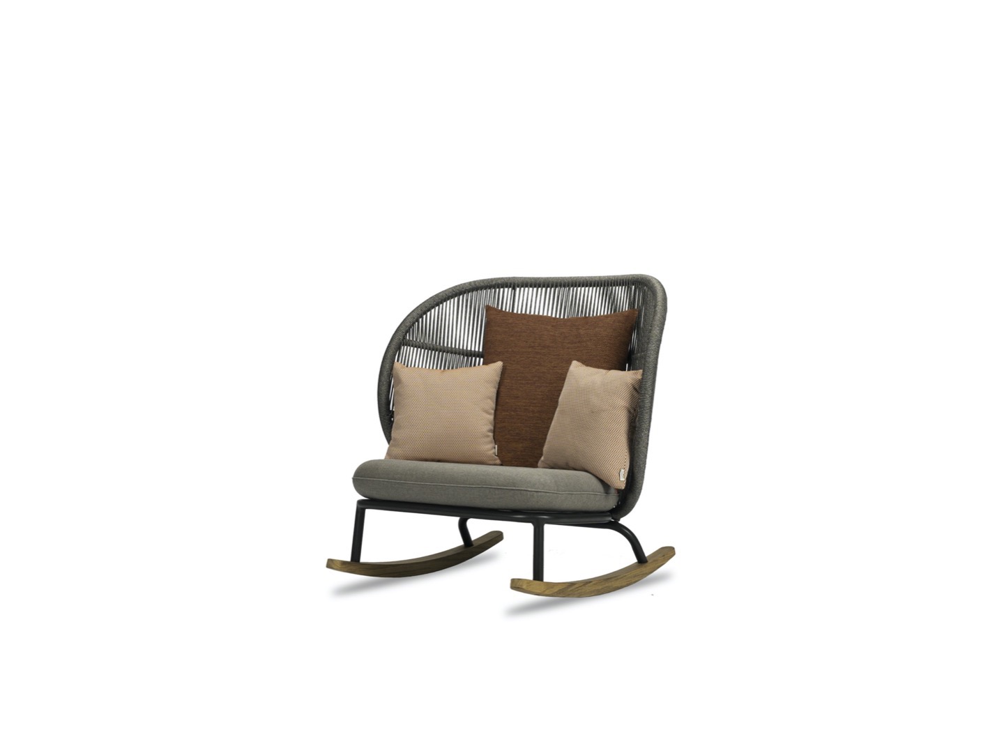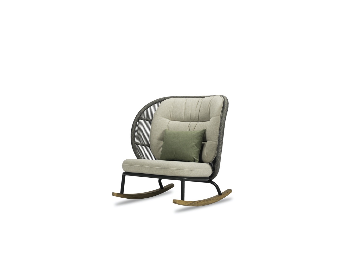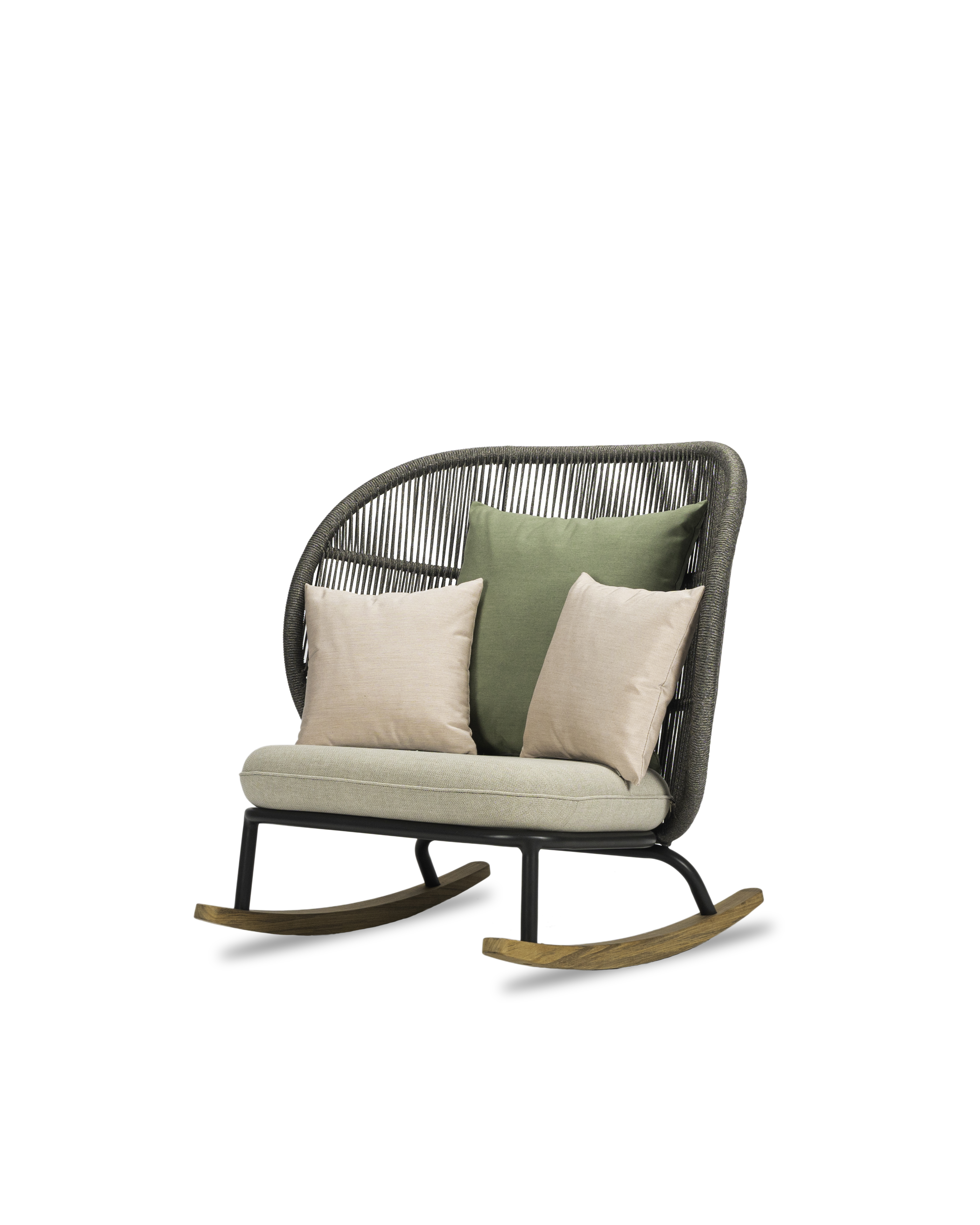 Usiądź w fotelu bujanym Kodo i zatop się w głębokich, wygodnych poduszkach. Wysokie oparcie z akrylowego sznurka i oszałamiająca podstawa z drewna tekowego łączą współczesny design z wygodą kojącego poruszania się w przód iw tył.