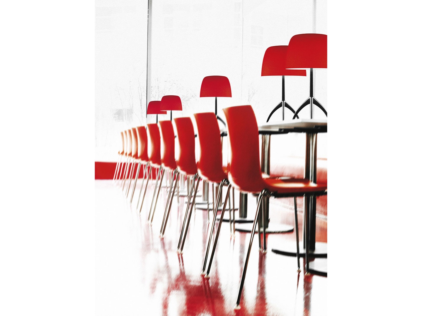 Dzisiaj klasyka wzbogacona jest nową gamą kolorystyczną, nowymi materiałami. Klosz w kolorze białym, ecru, czerwonym i mietowym; baza to polerowane aluminium, czarny chrom lub szampańskie wykończenie.