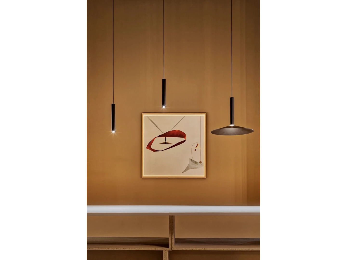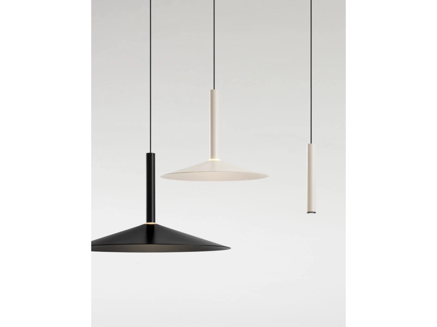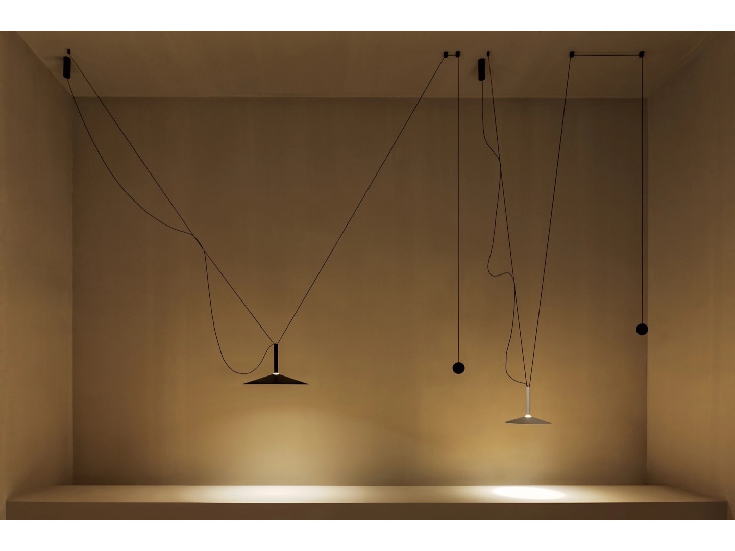Paradoksalnie, nowy projekt zaczyna się od dekonstrukcji archetypu lampy; syntetyzując go w miarę możliwości, pozostaje tylko cylindryczny korpus, zawieszony z wbudowaną diodą LED. Do tego cylindra możemy dodać różne stożki w kolorze ostrygowym białym i czarnym w kilku rozmiarach. Ale najbardziej pomysłowe ze wszystkiego jest to, że każda z tych lamp może mieć prostą przeciwwagę, dzięki czemu po zawieszeniu między dwoma punktami można ją przesuwać.
