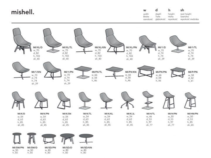 Mishell to szeroka gama siedzisk z przeznaczeniem zarówno domowym jak i kontraktowym. Charakterystyczny kształt kubełka jest powtarzalny w fotelach, krzesłach i hockerach dzięki zastosowaniu jednej formy sklejki przycinane do różnych rozmiarów. Bogaty wybór stelaży do siedziska jest odpowiedzią na różne potrzeby i gusta klientów. W rodzinie znajdują się: - fotele- na płozach, na nogach, na krzyżaku, obrotowy na metalowym talerzu lub tapicerowany skórą licową. - fotel wypczynkowy XL - z wysokim zagłówkiem na talerzu obrotowym - krzesła - na płozach, na nogach i na krzyżaku oraz na kółkach - hockery - na płozie i na talerzu metalowym Kolekcję charakteryzuje mocno wyprofilowany kształt kubełka zapewniający wysoki komfort siedzenia, jego elegancka forma i dopracowane szczegóły. Chcesz wiedzieć więcej? Skontaktuj się z nami!