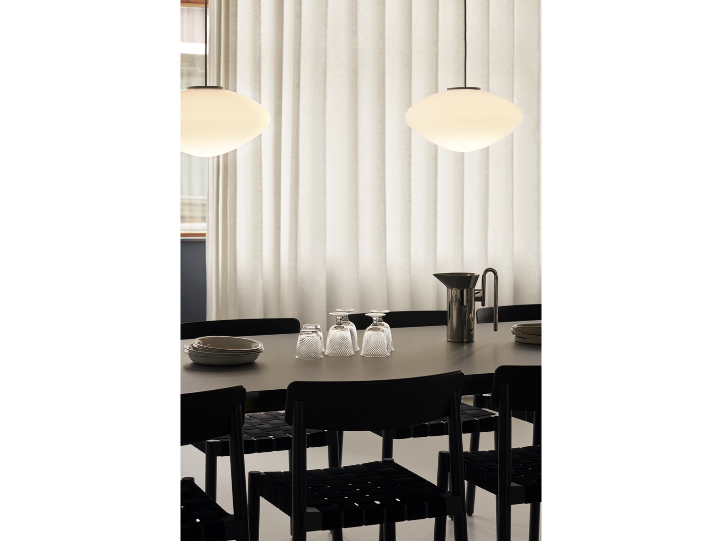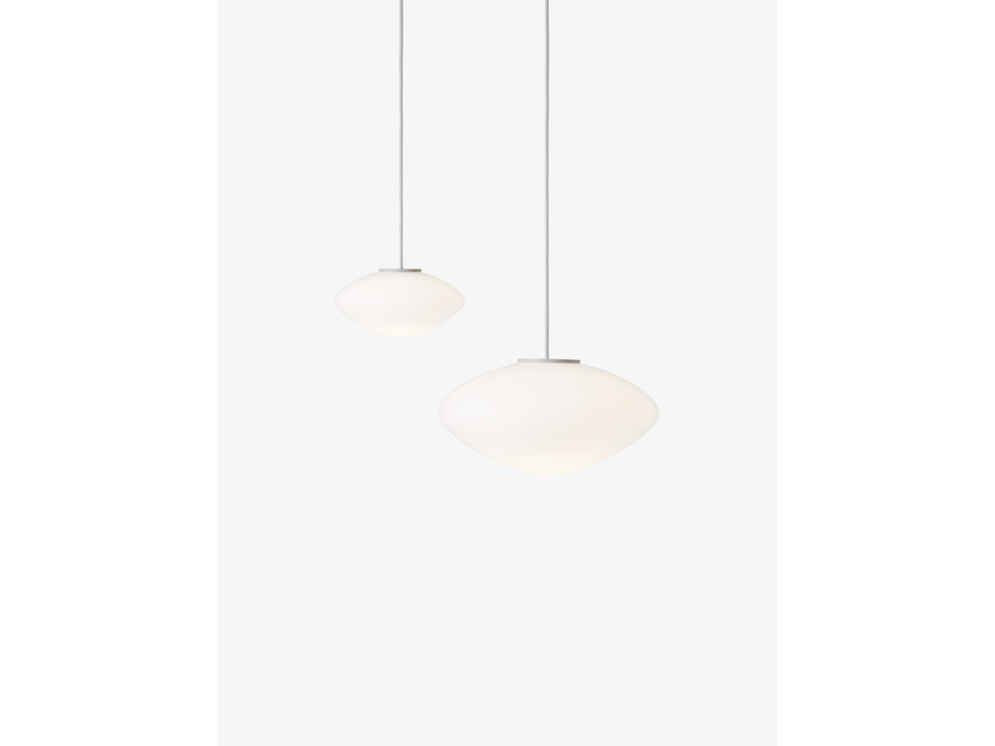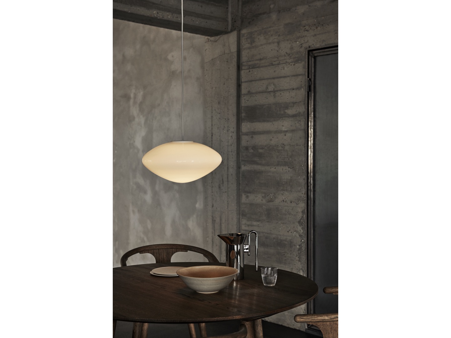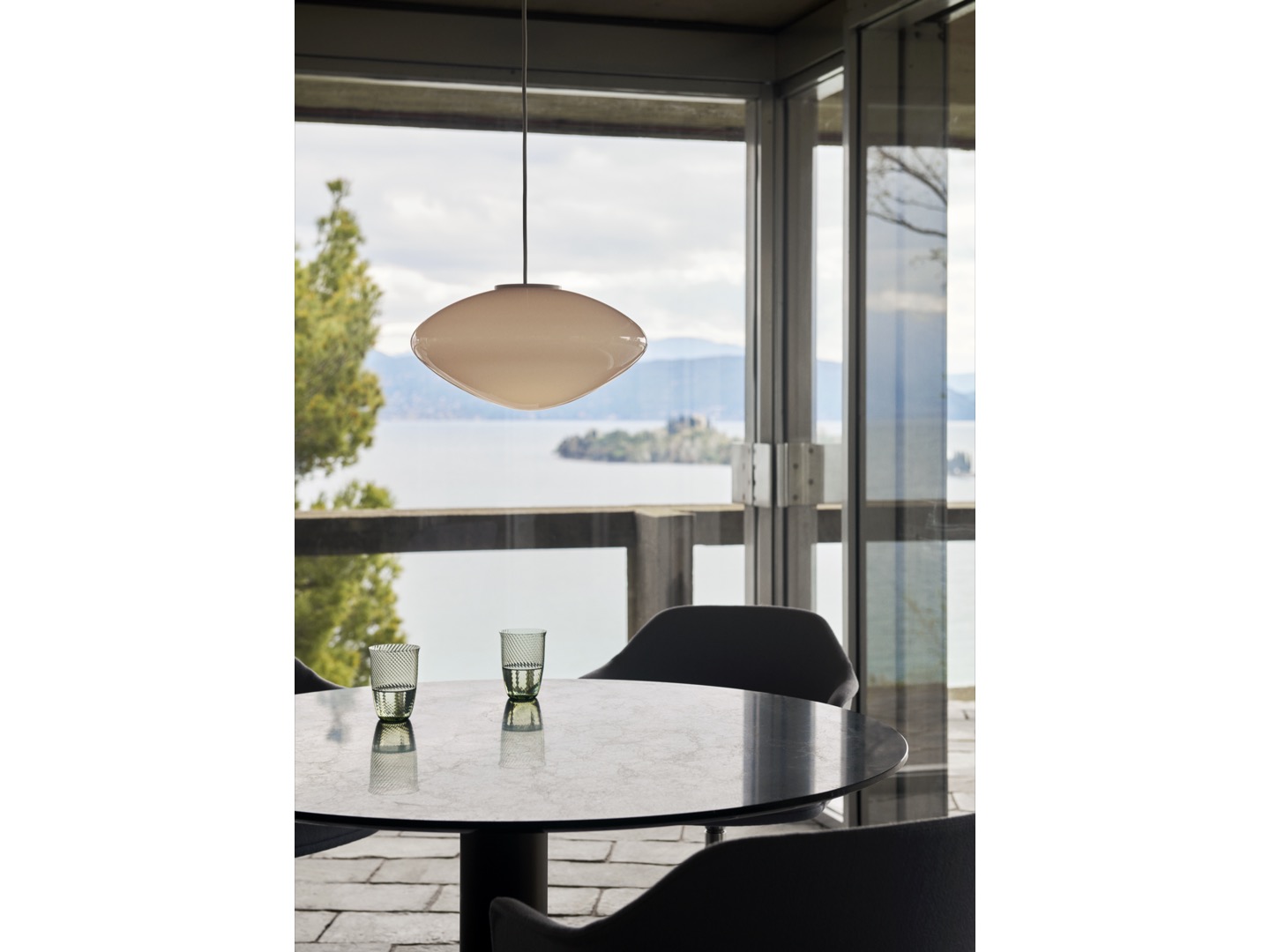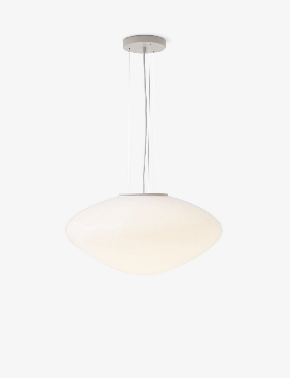 Wykonana z dmuchanego szkła opalowego z detalami z aluminium powlekanego na biało i sznurka tekstylnego, lampa wisząca Mist jest dostępna w dwóch rozmiarach i można ją wieszać pojedynczo lub w wielokrotnościach, aby stworzyć większy układ oświetleniowy. Brak dodatkowych elementów na zewnętrznej stronie lampy pozwala, aby światło samo było w centrum całości, tworząc poczucie wizualnej harmonii.