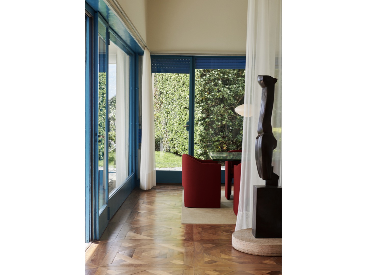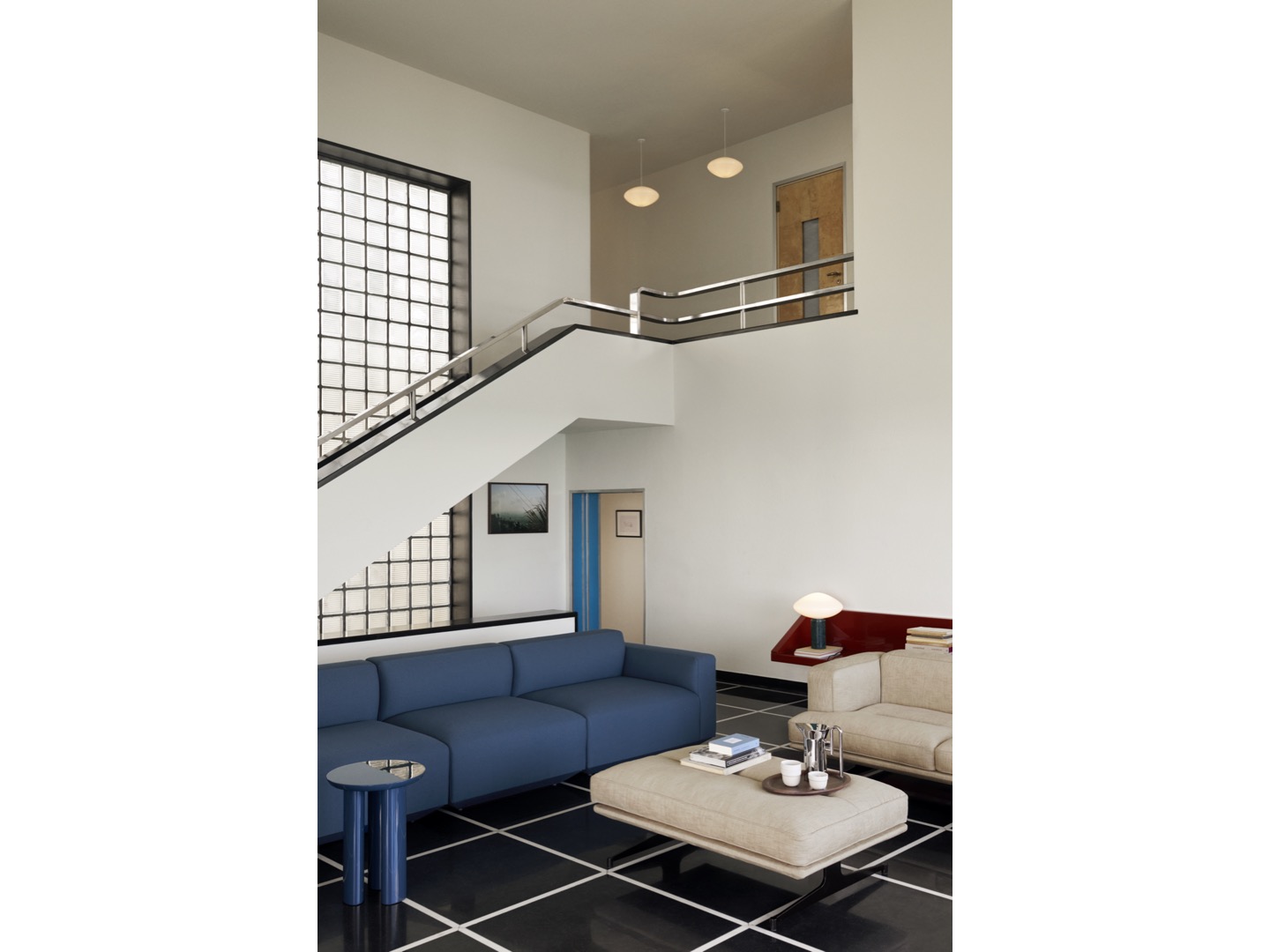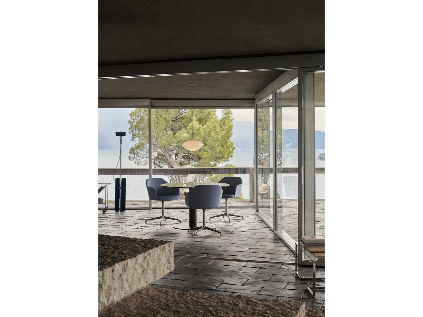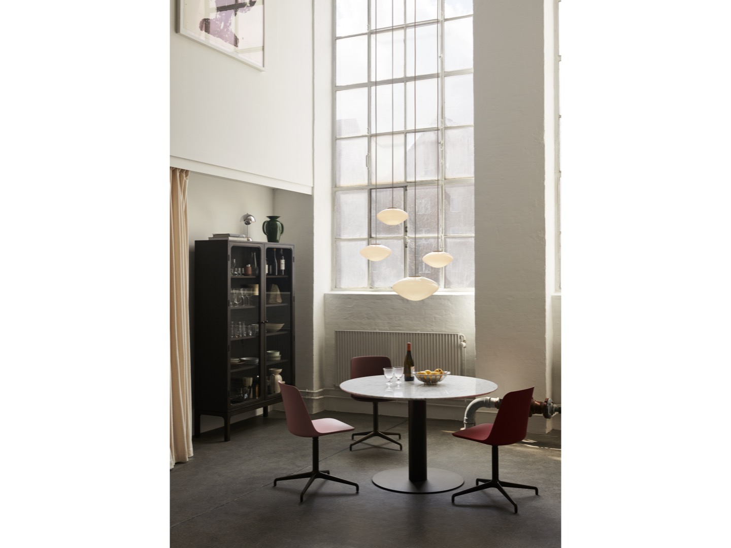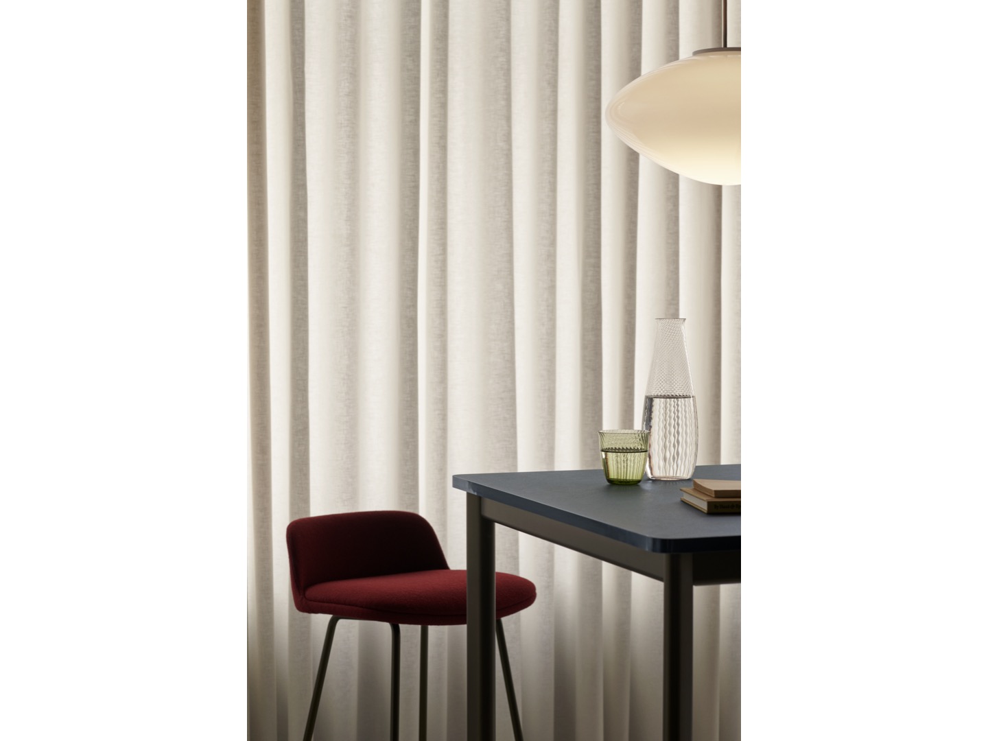 Wykonana z dmuchanego szkła opalowego z detalami z aluminium powlekanego na biało i sznurka tekstylnego, lampa wisząca Mist jest dostępna w dwóch rozmiarach i można ją wieszać pojedynczo lub w wielokrotnościach, aby stworzyć większy układ oświetleniowy. Brak dodatkowych elementów na zewnętrznej stronie lampy pozwala, aby światło samo było w centrum całości, tworząc poczucie wizualnej harmonii.