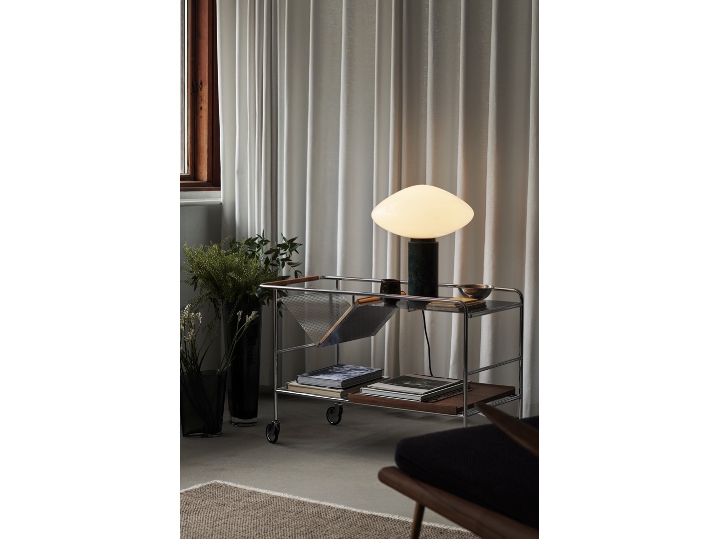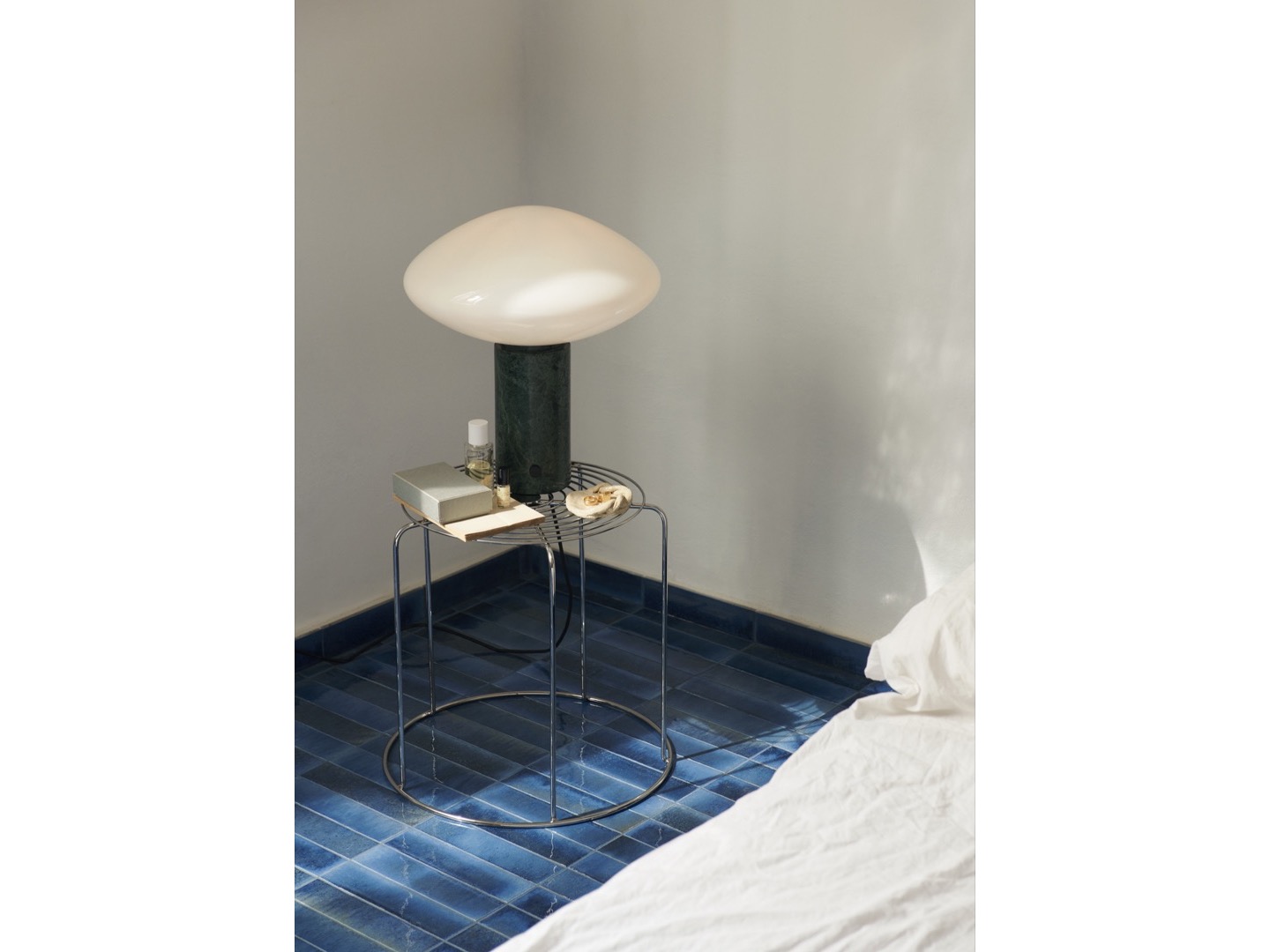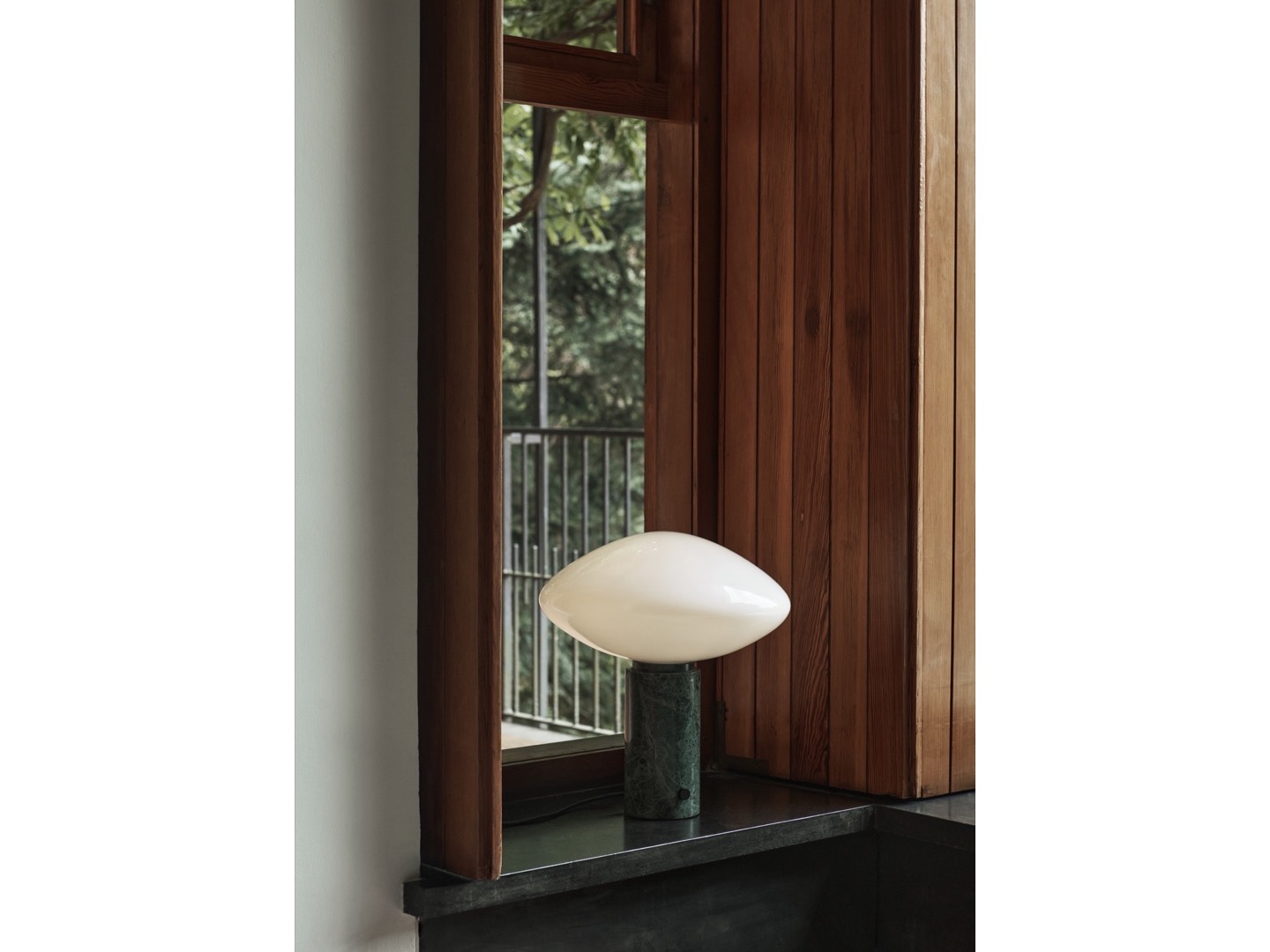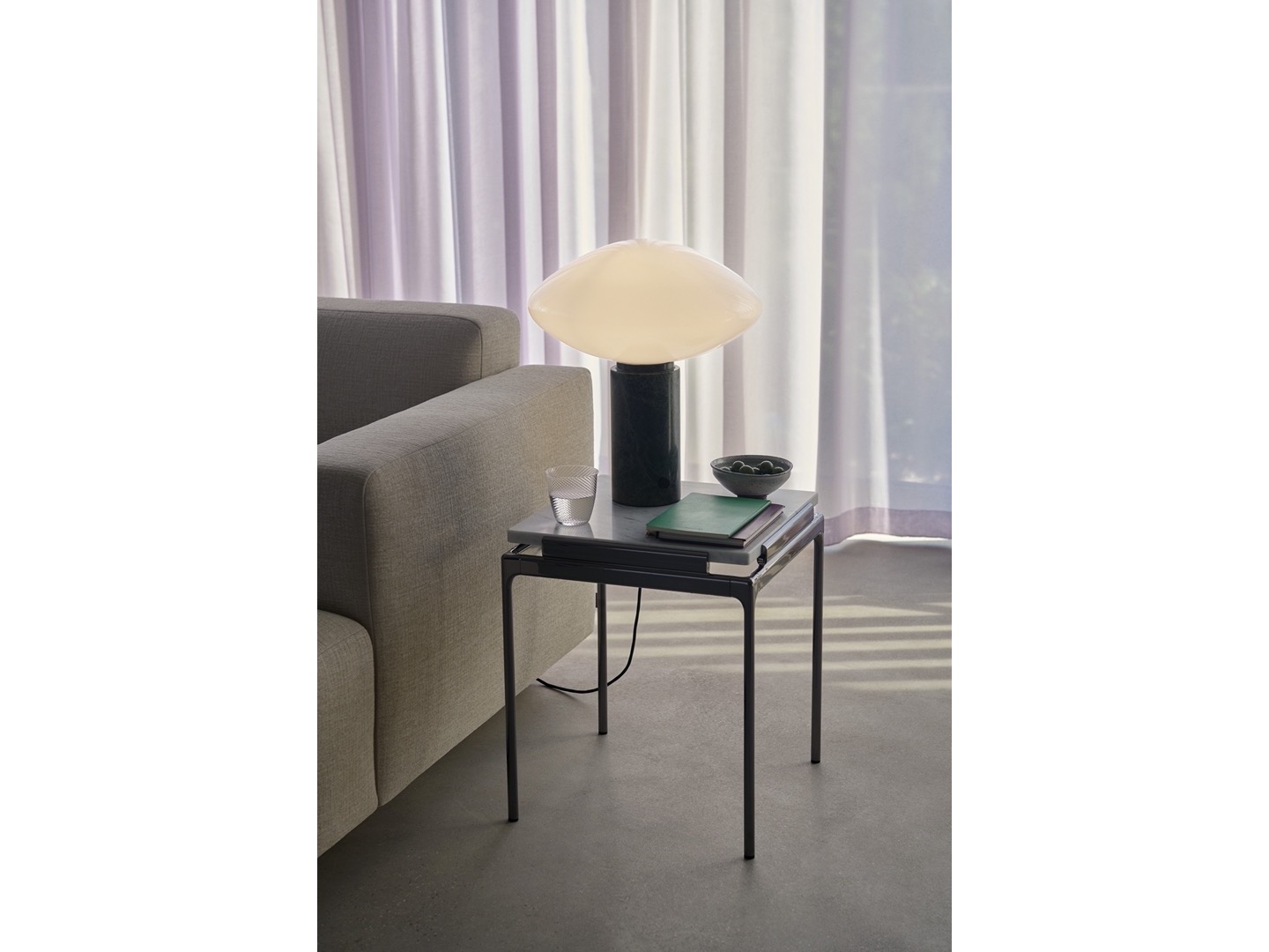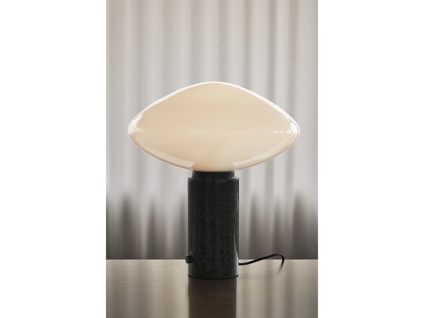 Lampa stołowa Mist wykonana jest z dmuchanego szkła opalowego na grubym marmurowy słupku z małym ściemniaczem.