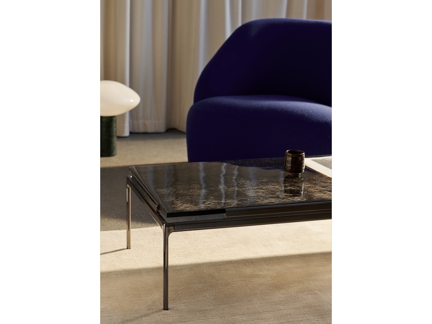 Tworzy się kontrast pomiędzy rozproszonym światłem wpadającym przez szklany klosz a solidnością marmuru.
