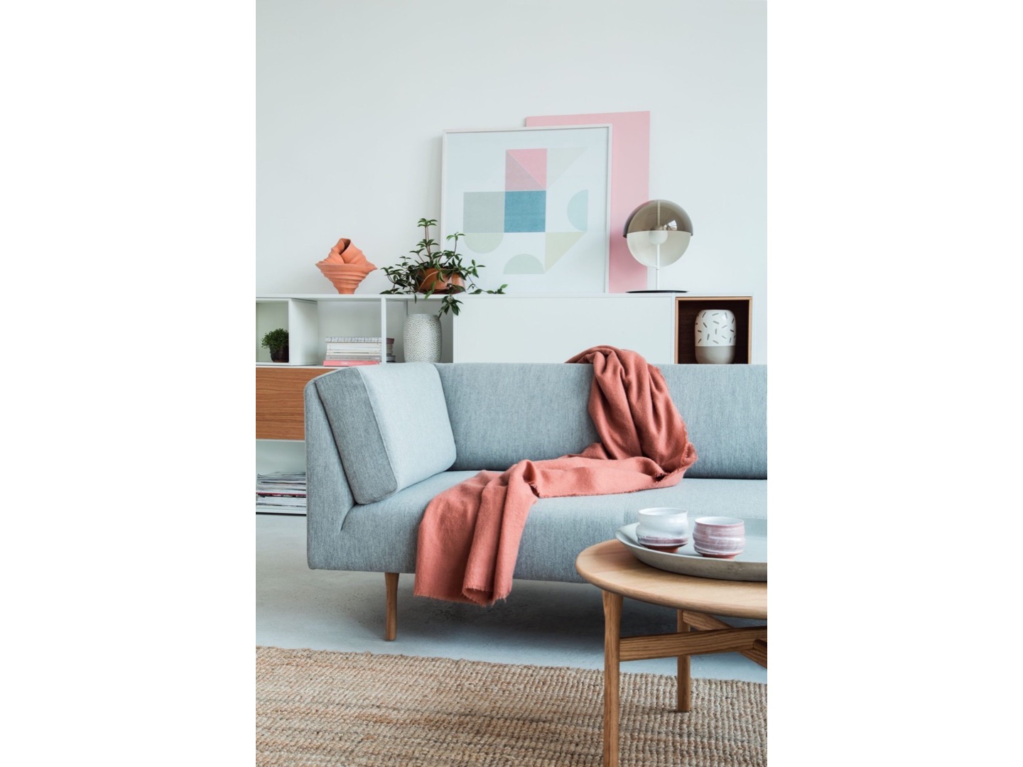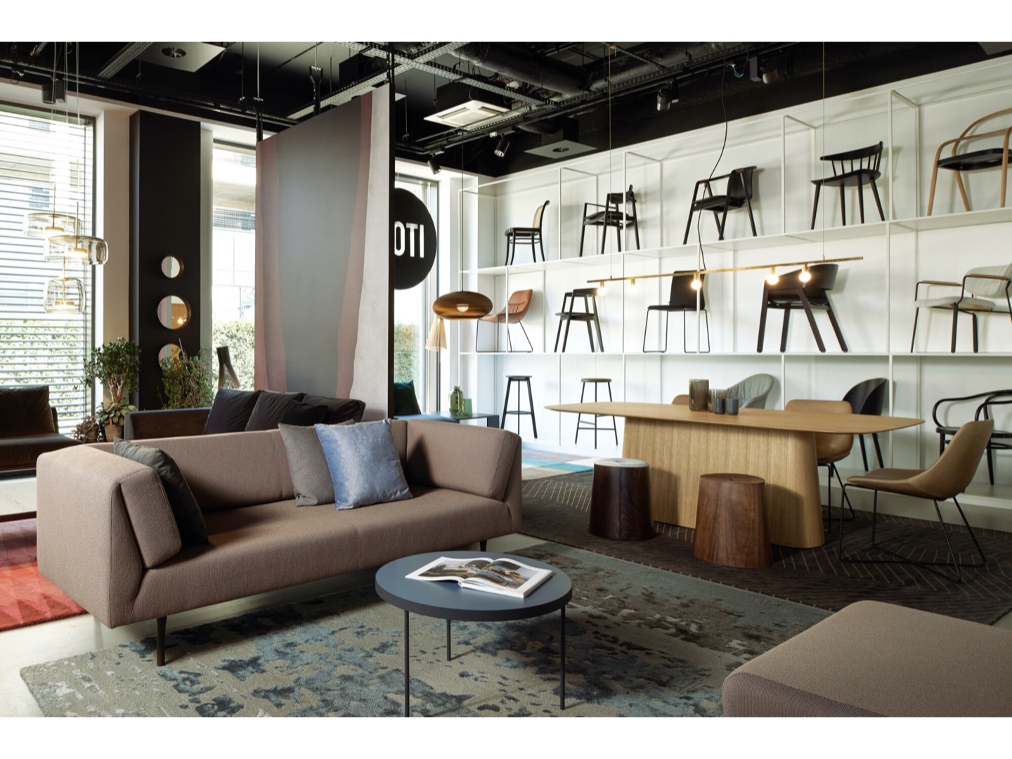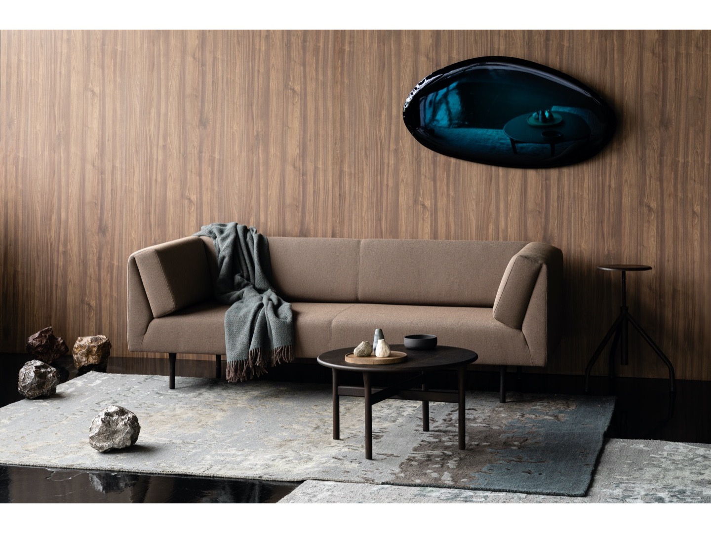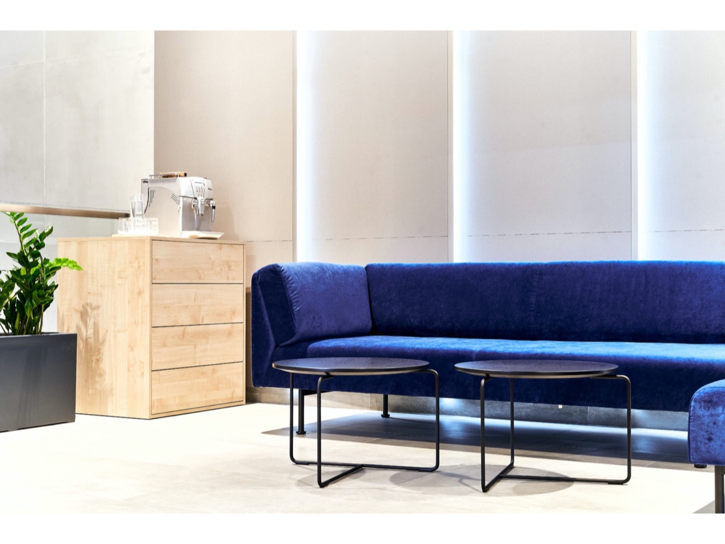 Siedziska, które mogą być zamawiane na podstawie drewnianej dębowej lub czarnych nogach lakierowanych, uzupełniają stoliki o różnych kształtach i wysokościach, w tym ława o owalnym blacie. Oprócz okleiny naturalnej dębowej, materiałem użytym do produkcji blatów stolików okrągłych jest nowość w NOTI - białe i czarne lastryko.