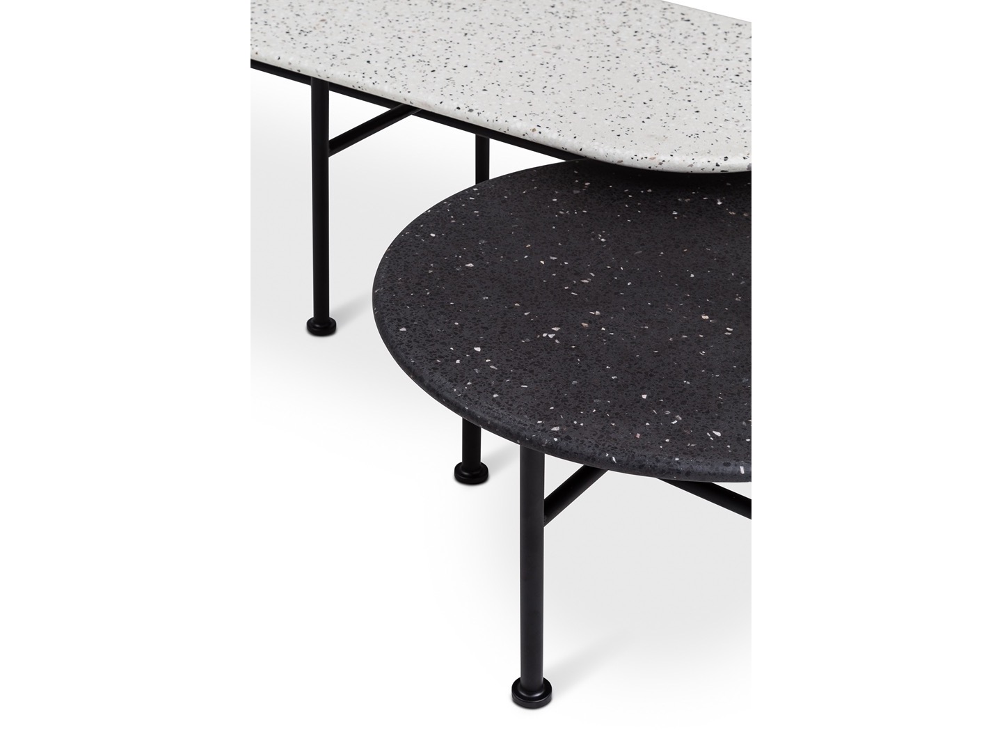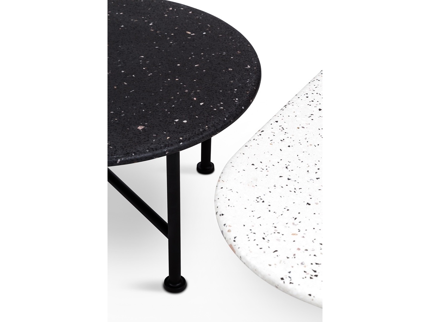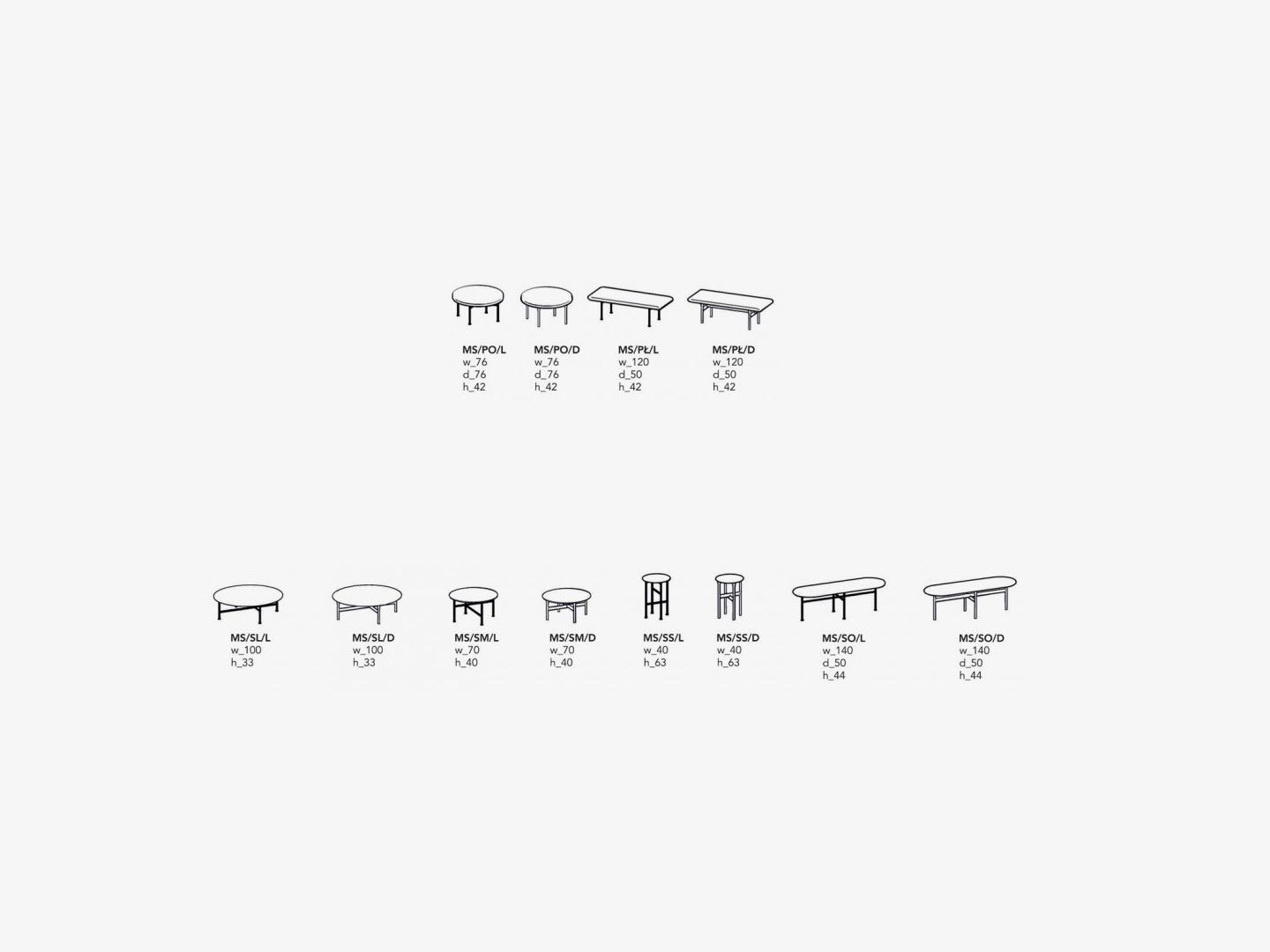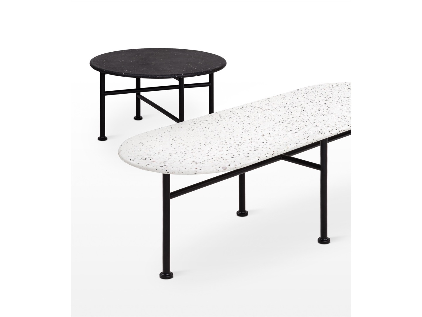 Siedziska, które mogą być zamawiane na podstawie drewnianej dębowej lub czarnych nogach lakierowanych, uzupełniają stoliki o różnych kształtach i wysokościach, w tym ława o owalnym blacie. Oprócz okleiny naturalnej dębowej, materiałem użytym do produkcji blatów stolików okrągłych jest nowość w NOTI - białe i czarne lastryko.