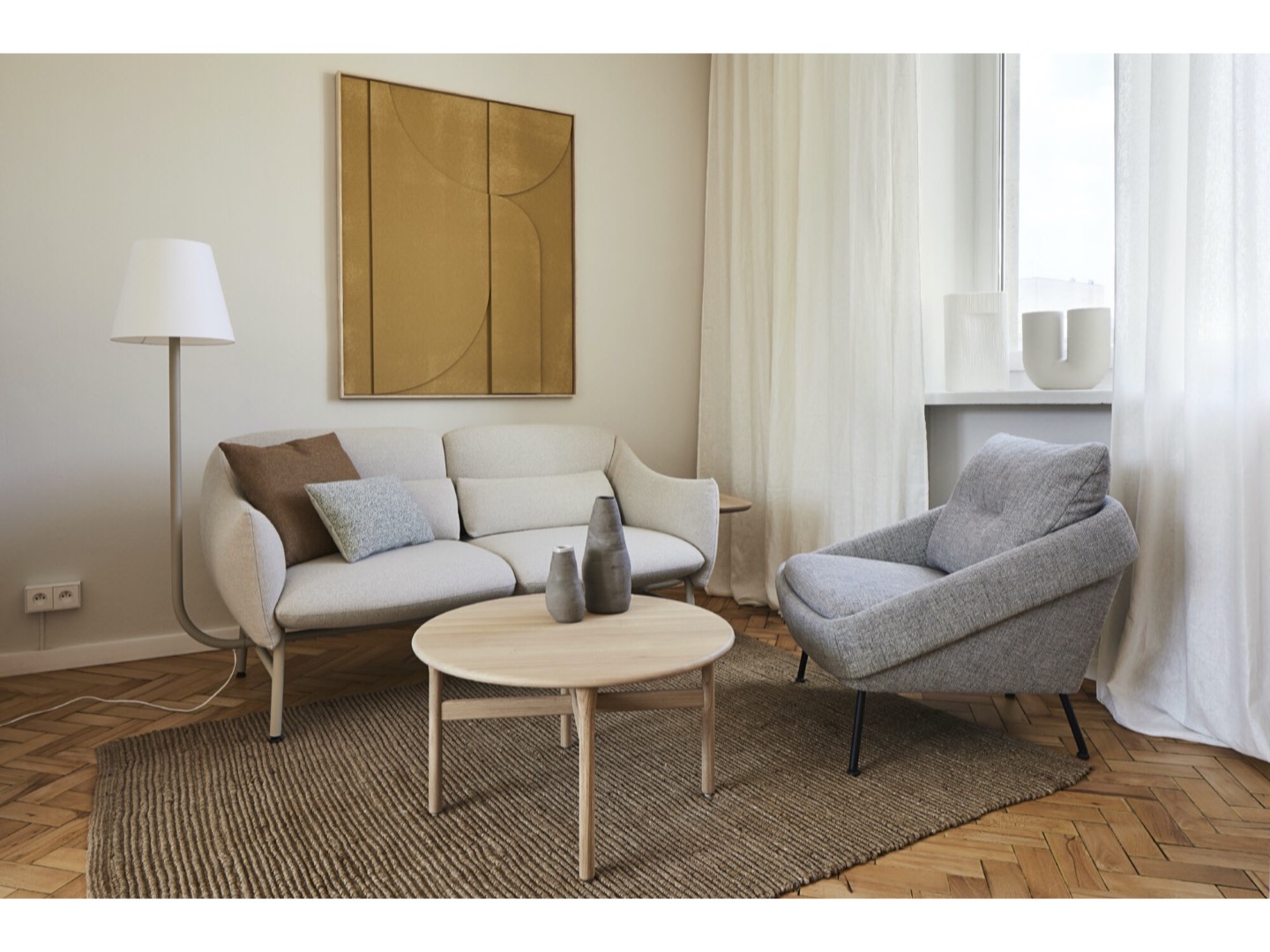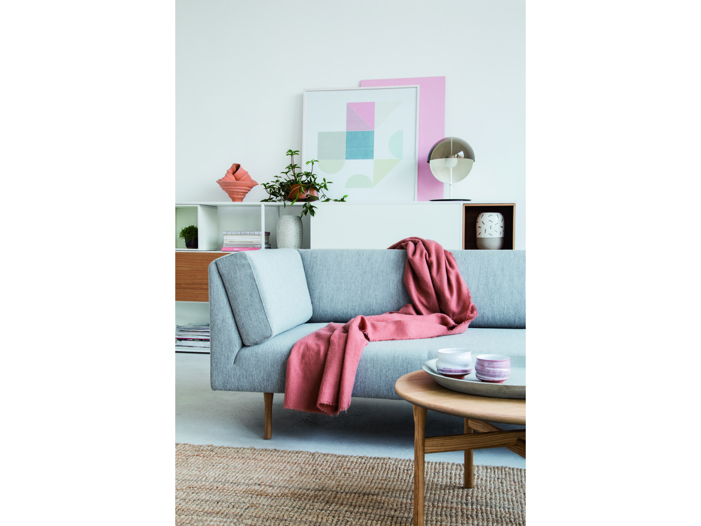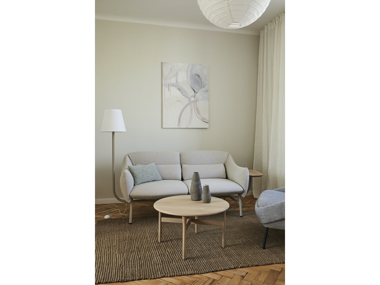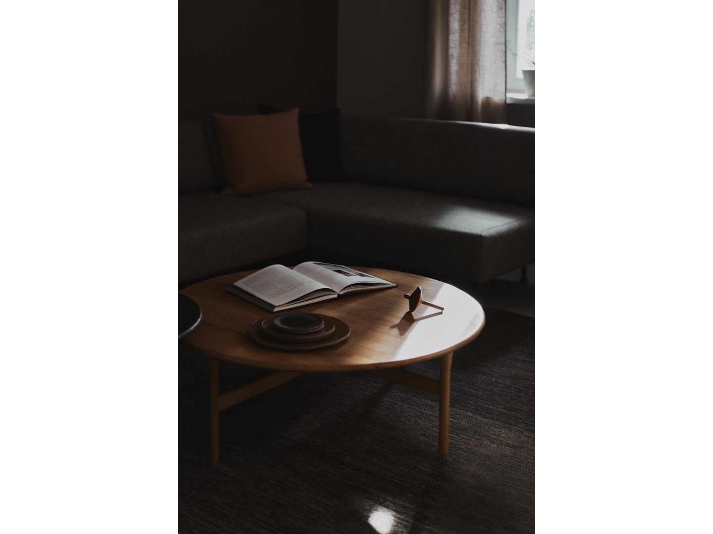 Siedziska, które mogą być zamawiane na podstawie drewnianej dębowej lub czarnych nogach lakierowanych, uzupełniają stoliki o różnych kształtach i wysokościach, w tym ława o owalnym blacie. Oprócz okleiny naturalnej dębowej, materiałem użytym do produkcji blatów stolików okrągłych jest nowość w NOTI - białe i czarne lastryko.