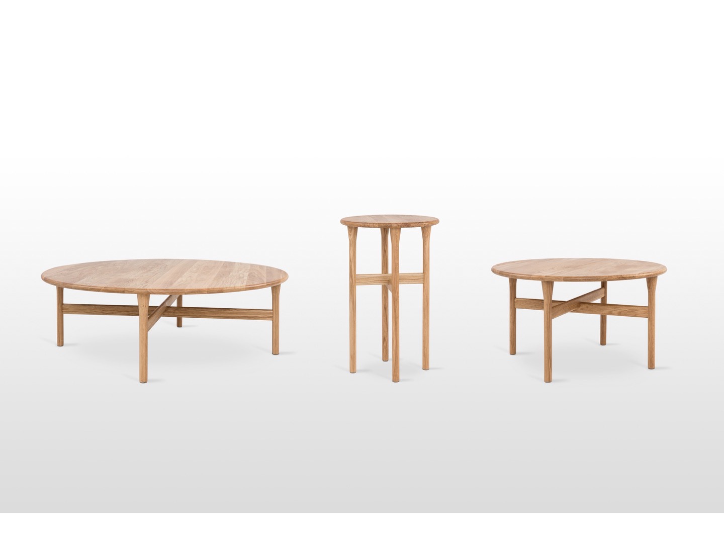 Siedziska, które mogą być zamawiane na podstawie drewnianej dębowej lub czarnych nogach lakierowanych, uzupełniają stoliki o różnych kształtach i wysokościach, w tym ława o owalnym blacie. Oprócz okleiny naturalnej dębowej, materiałem użytym do produkcji blatów stolików okrągłych jest nowość w NOTI - białe i czarne lastryko.