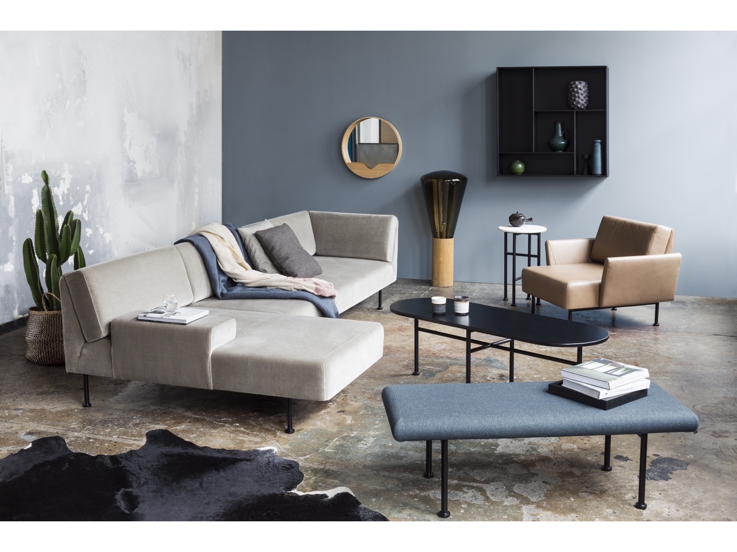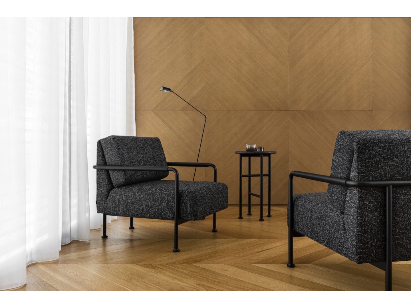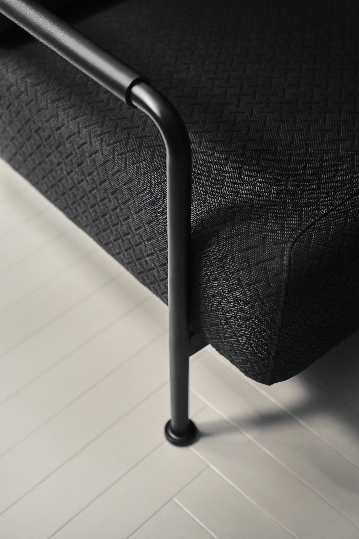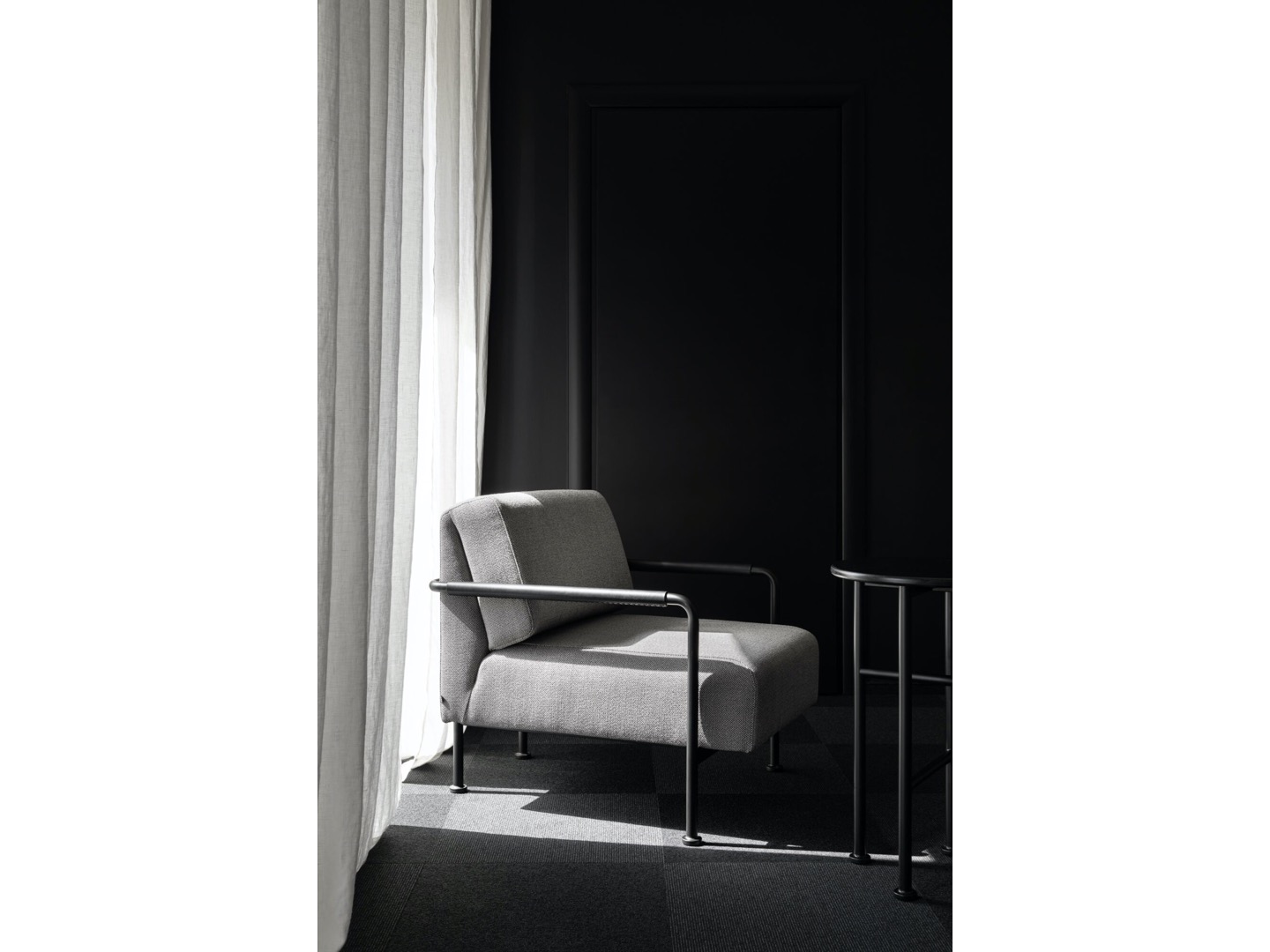 Charakterystyczną cechą kolekcji jest prostopadłościenna poduszka podłokietnika skierowana, pod kątem, do wewnątrz siedziska. Geometryczne oparcia składają się z twardszego korpusu i miękkiego podparcia, a połączone są w jedną formę wspólnym materiałem tapicerskim.