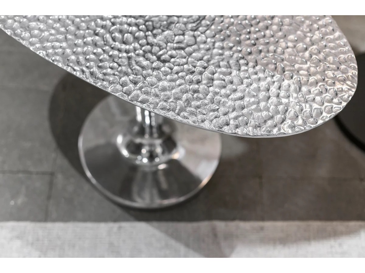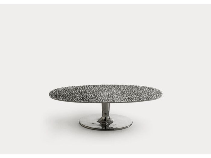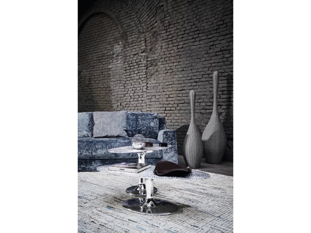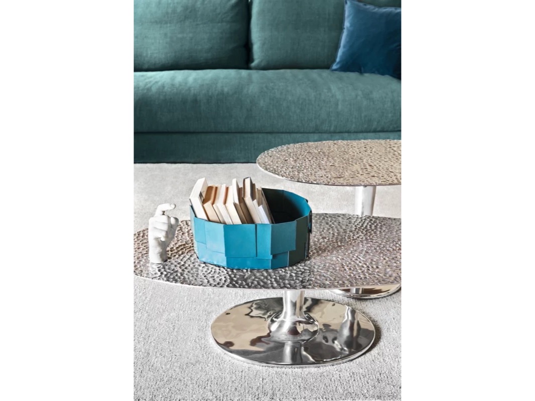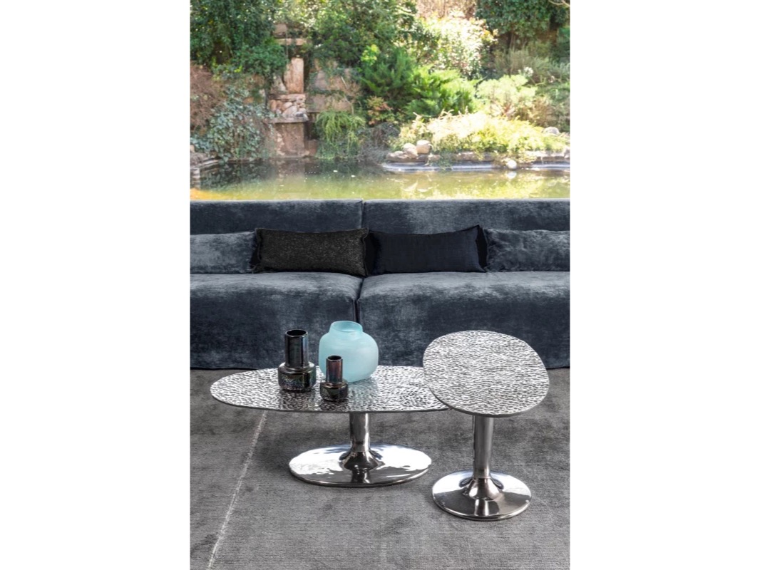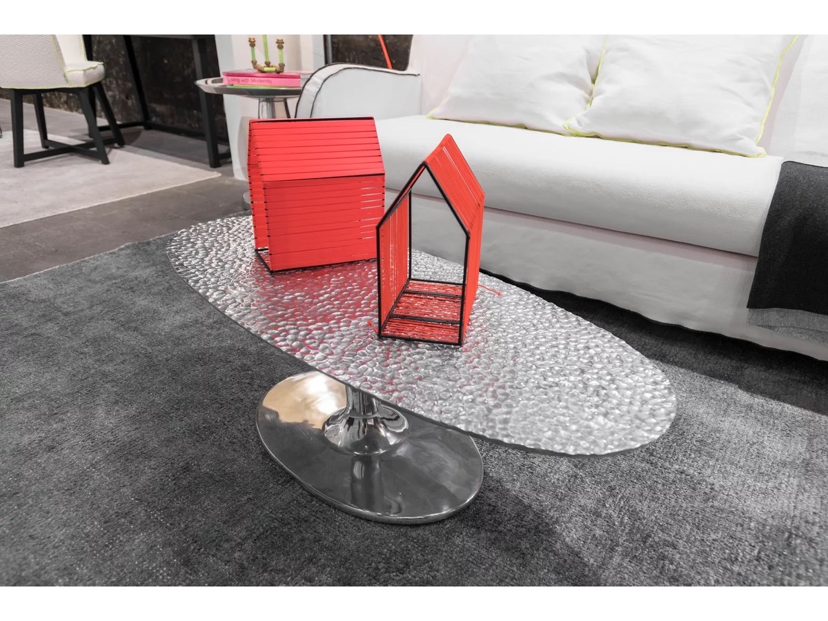 Wykonane w całości z polerowanego odlewu aluminium, są dostępne w różnych rozmiarach i wysokościach i charakteryzują się pojedynczą centralną podstawą, która wydaje się podtrzymywać tacę z lekko uniesionymi krawędziami. Połysk powierzchni sprawia, że światło za każdym razem tworzy inny efekt.