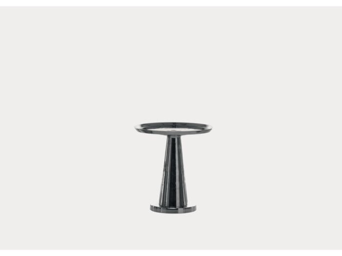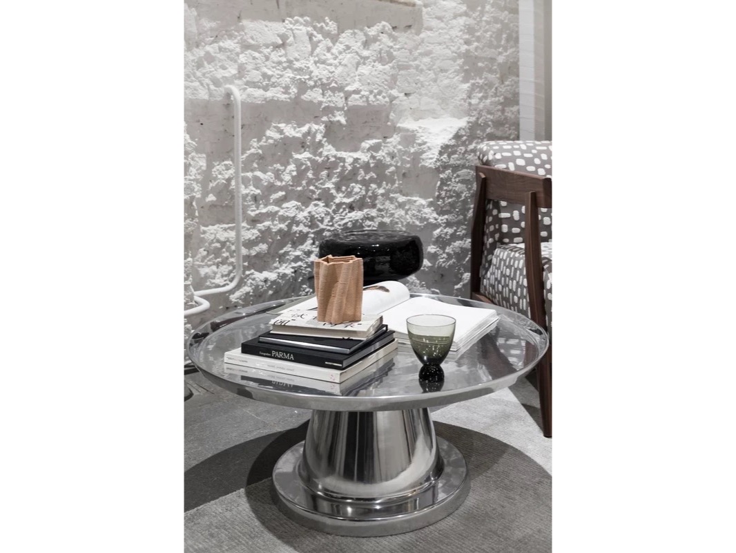 Wykonane w całości z polerowanego odlewu aluminium, są dostępne w różnych rozmiarach i wysokościach i charakteryzują się pojedynczą centralną podstawą, która wydaje się podtrzymywać tacę z lekko uniesionymi krawędziami. Połysk powierzchni sprawia, że światło za każdym razem tworzy inny efekt.