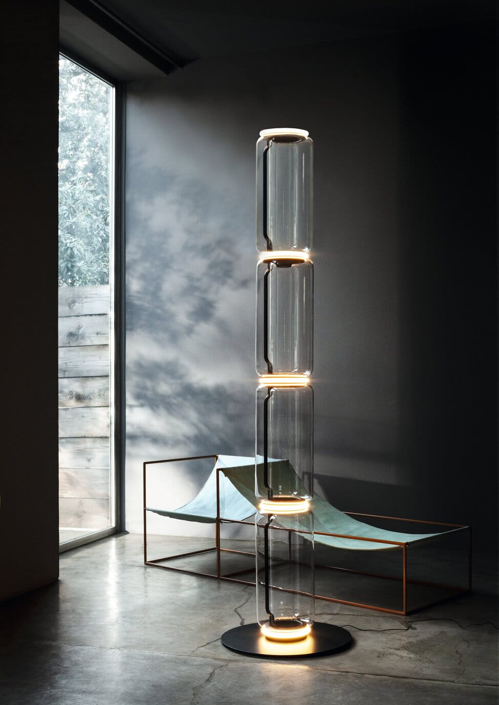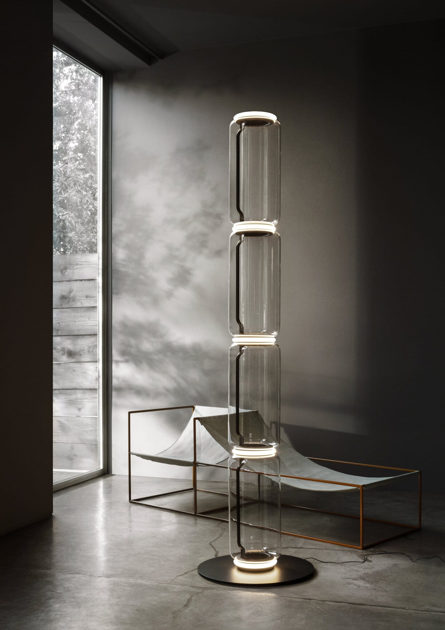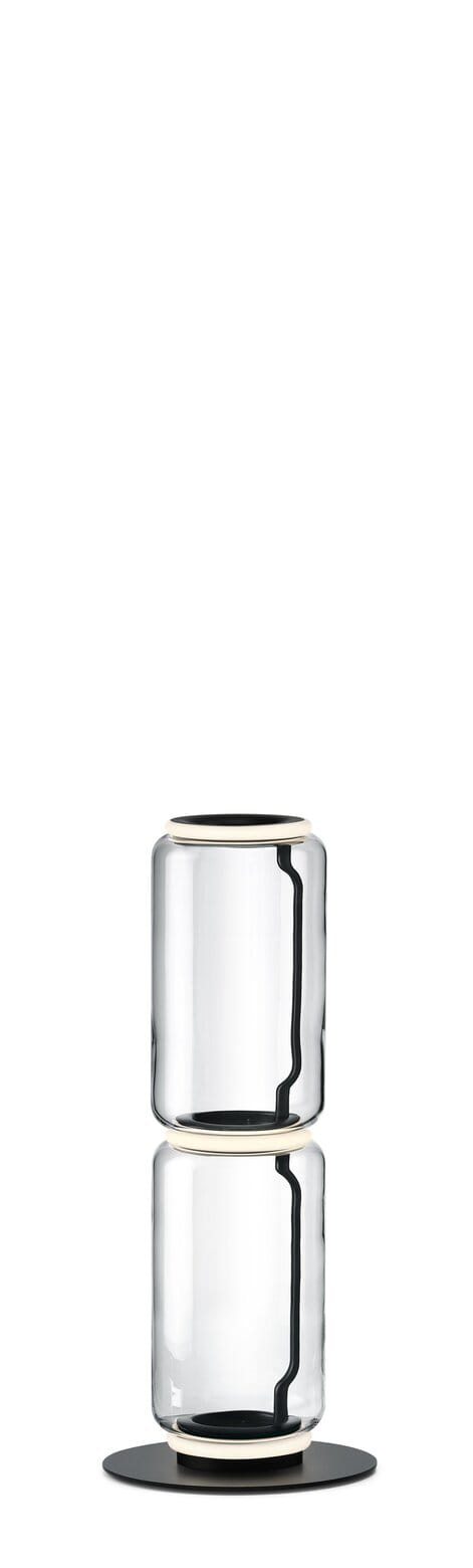 Lampy stojące składające się z połączonych ze sobą szklanych modułów osiągających wysokość 2,17 metra. Cylindryczna i półsferyczna konstrukcja z przezroczystego dmuchanego szkła, podstawa i pierścienie z odlewanego ciśnieniowo aluminium, wewnętrzne ramiona boczne z hydroformowanej stali i formowane wtryskowo opalowe dyfuzory z silikonowym pierścieniem zewnętrznym. Panel sterowany pedałem służy jako ściemniacz do regulacji natężenia światła w zakresie od 10% do 100% w dowolnym kierunku. Montowany na ścianie zasilacz z wymiennym panelem.