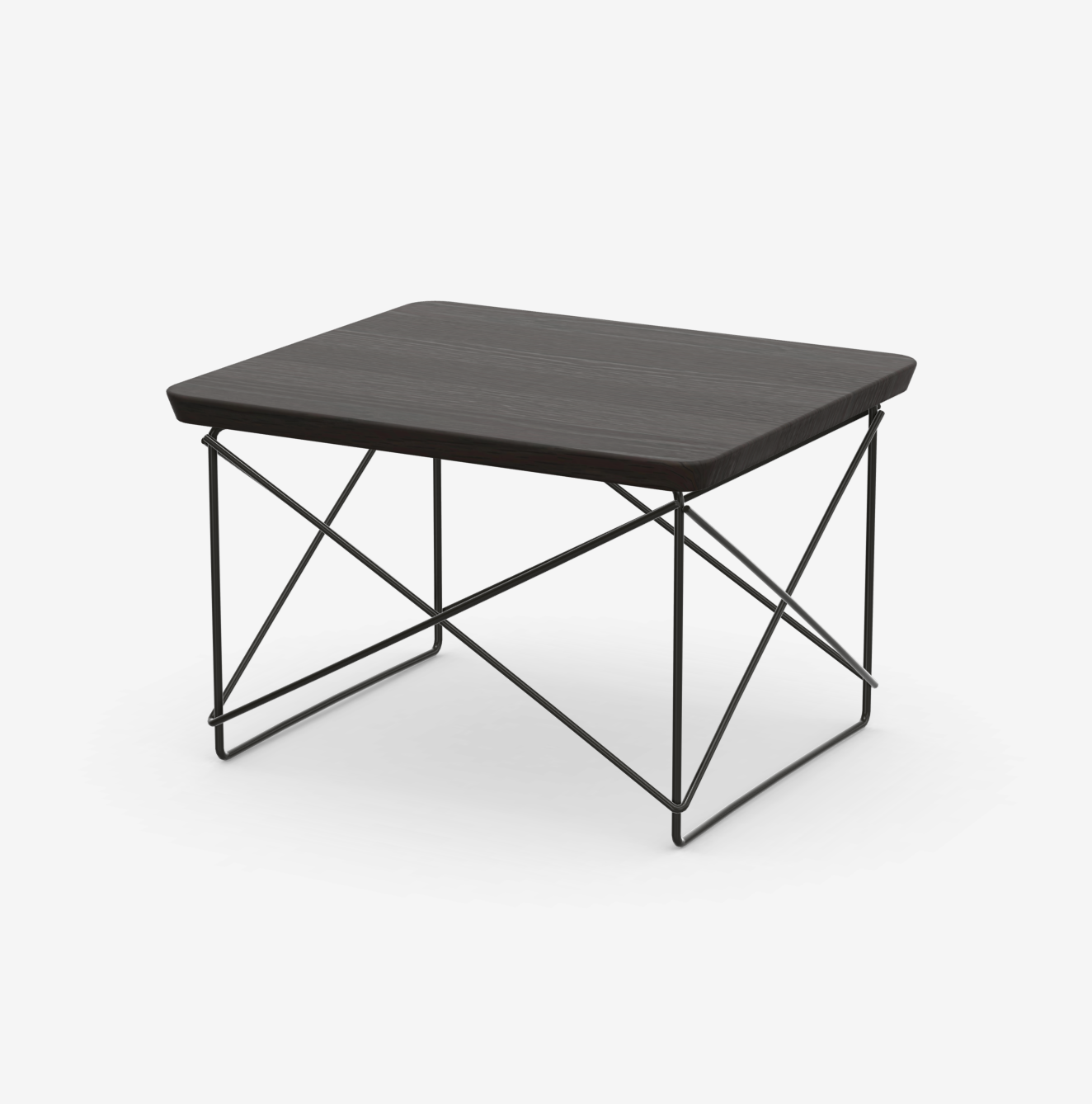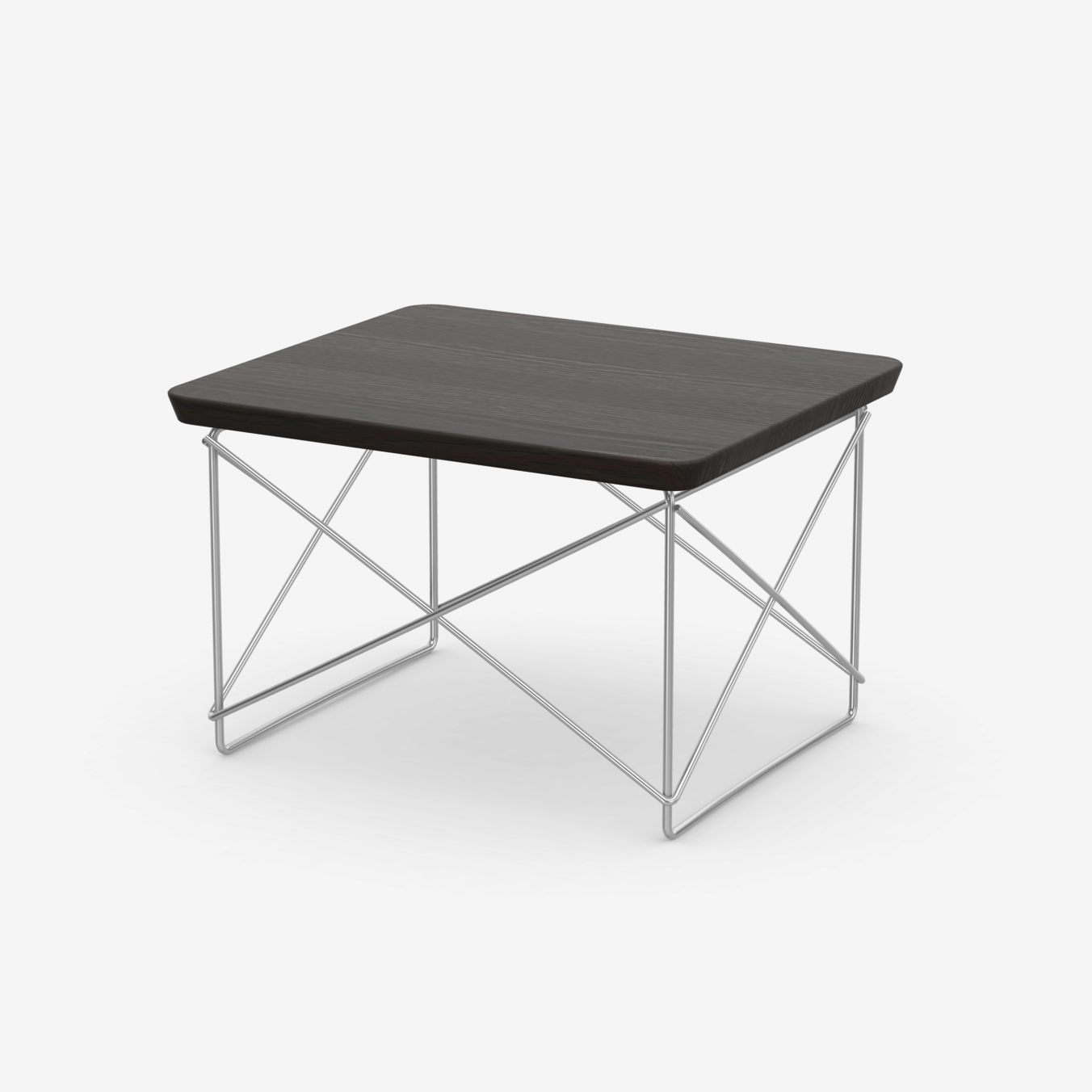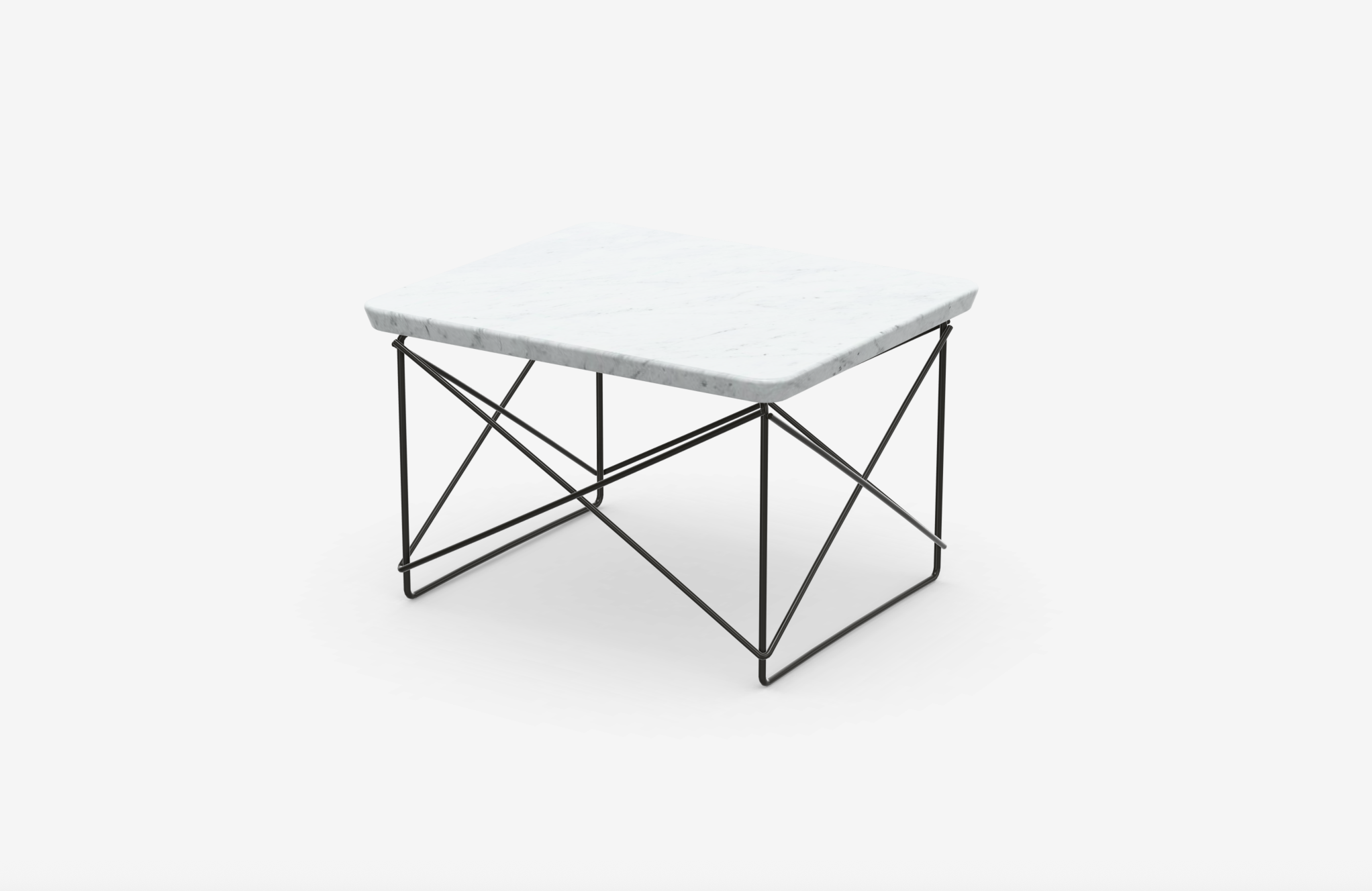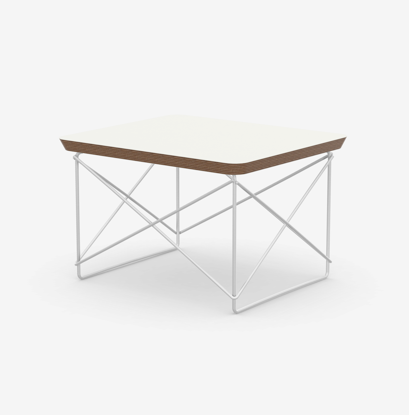 Charles & Ray Eames, 1950r. Stolik zaprojektowany z myślą o użytku domowym jako boczny stolik do postawienia przy sofie czy fotelu. Baza stolików wykonana jest z chromowanej stali, a blaty pokryte laminatem lub płatkami złota.