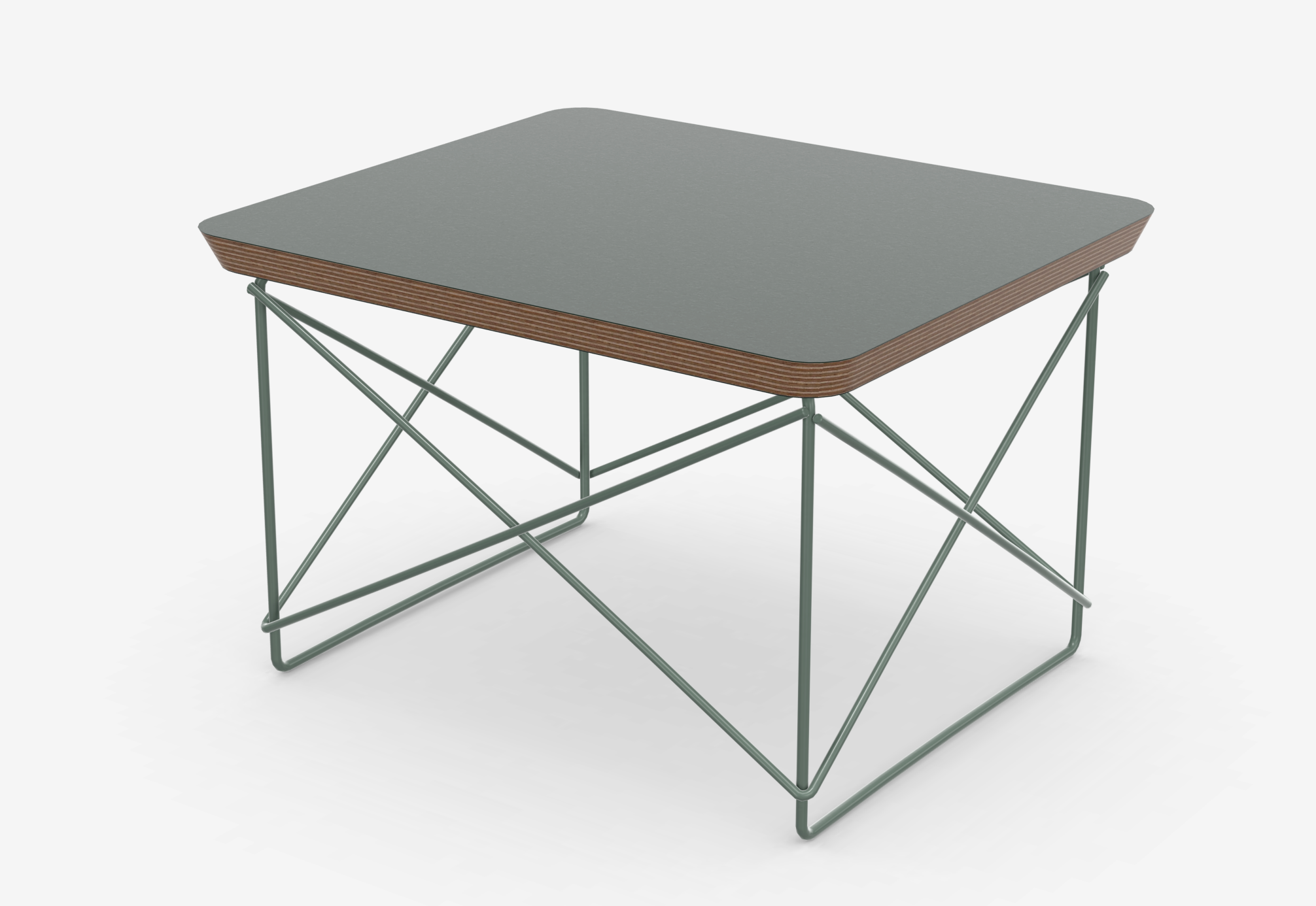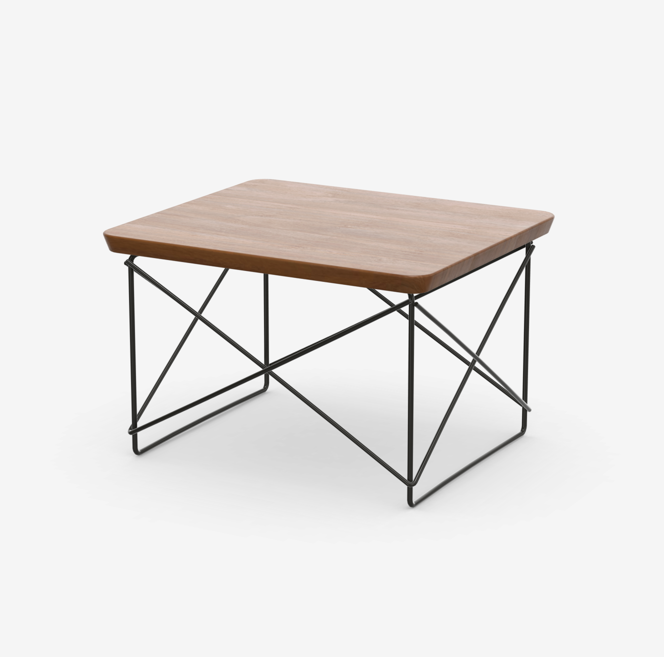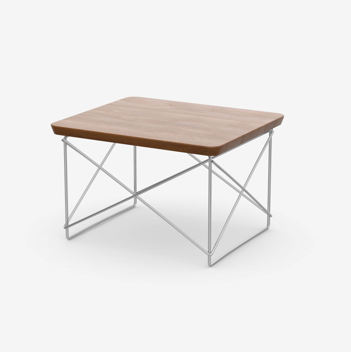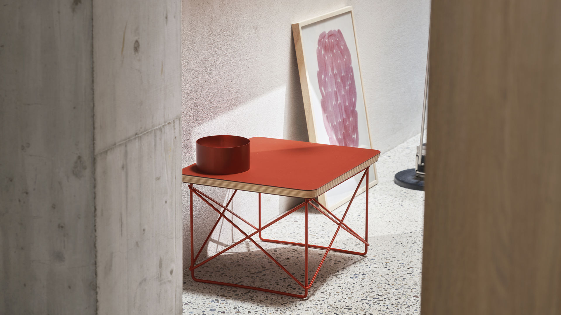 Charles & Ray Eames, 1950r. Stolik zaprojektowany z myślą o użytku domowym jako boczny stolik do postawienia przy sofie czy fotelu. Baza stolików wykonana jest z chromowanej stali, a blaty pokryte laminatem lub płatkami złota.