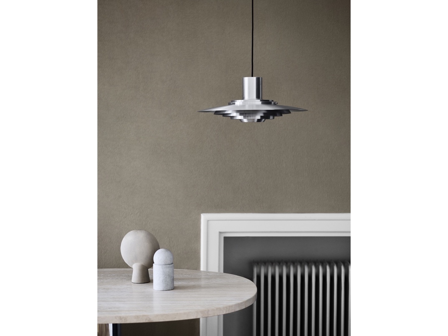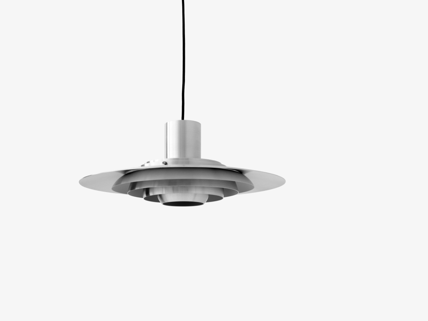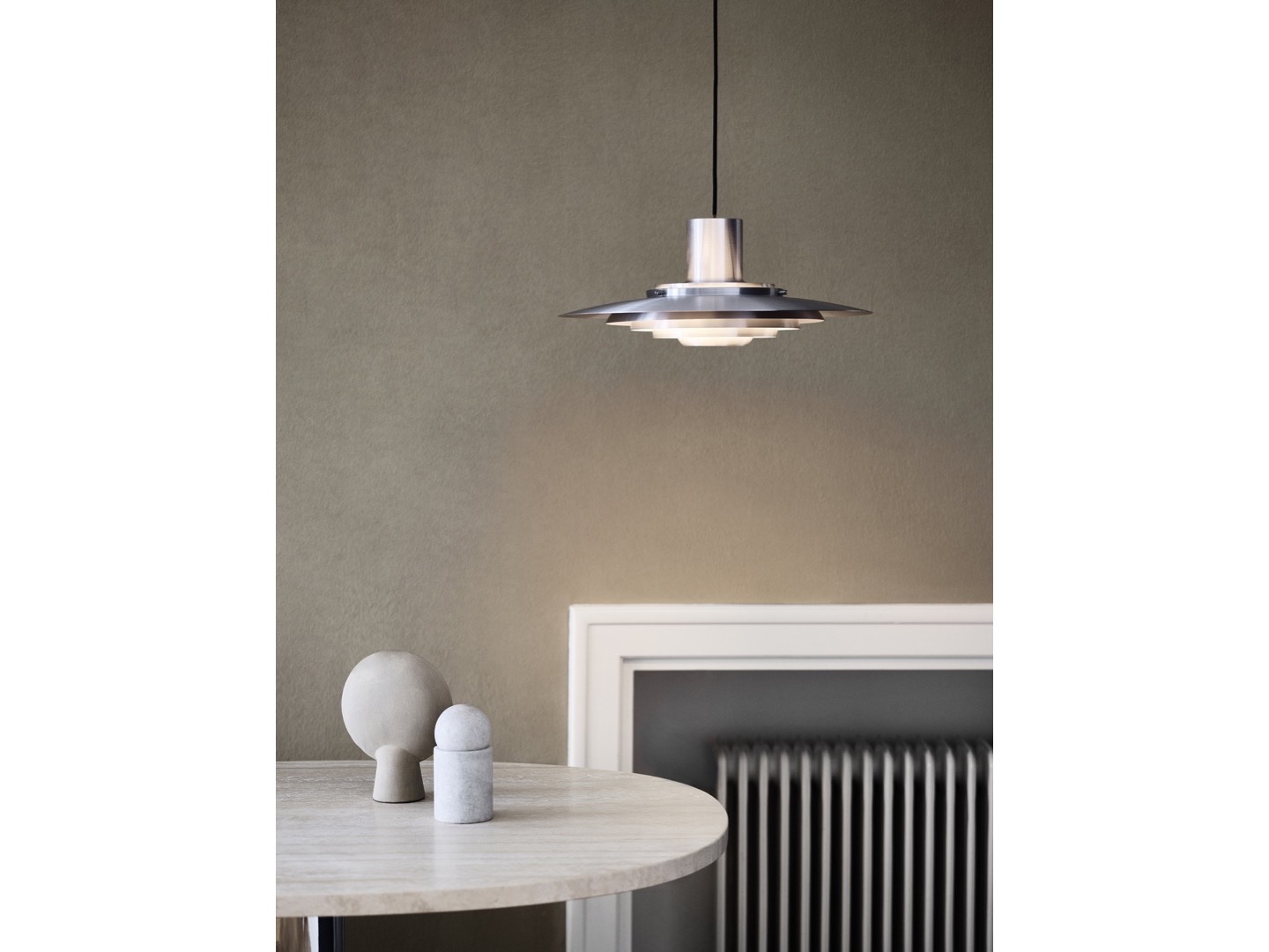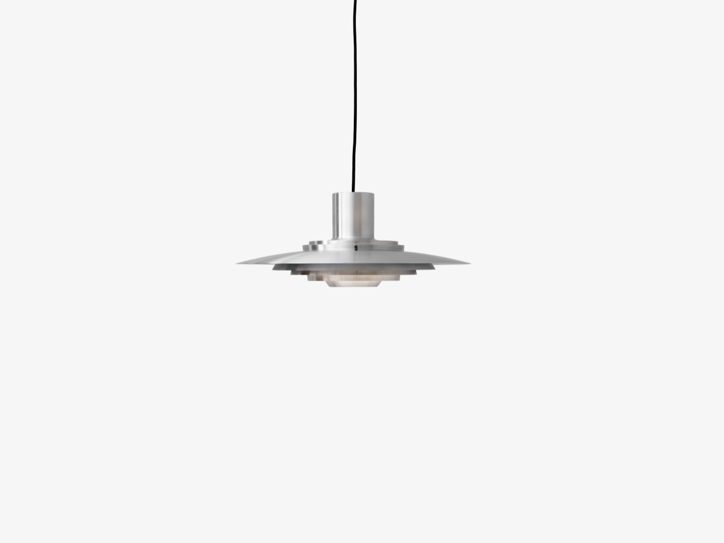 Jørgena Kastholma (1931-2007) i Prebena Juhla Fabriciusa (1931-1984) kierowała wspólna misja stworzenia czystej pochodnej funkcji. Obaj byli architektami, ukończyli Duńską Szkołę Architektury Wnętrz, gdzie studiowali u Finna Juhla, a następnie u Arne Jacobsena. Lampa wisząca P376 to doskonały przykład subtelnego architektonicznego podejścia Kastholm & Fabricius do projektu. Zaprojektowane pierwotnie w 1963 roku, pięć koncentrycznych kloszy tworzy gradację krzywizn w kierunku środka lampy, emitując miękkie, rozproszone światło. Dyskretne rozmieszczenie kloszy i jedwabiste aluminiowe wykończenie zapewniają spójną ekspresję, która jest zarówno ikoniczna, jak i fascynująca.
