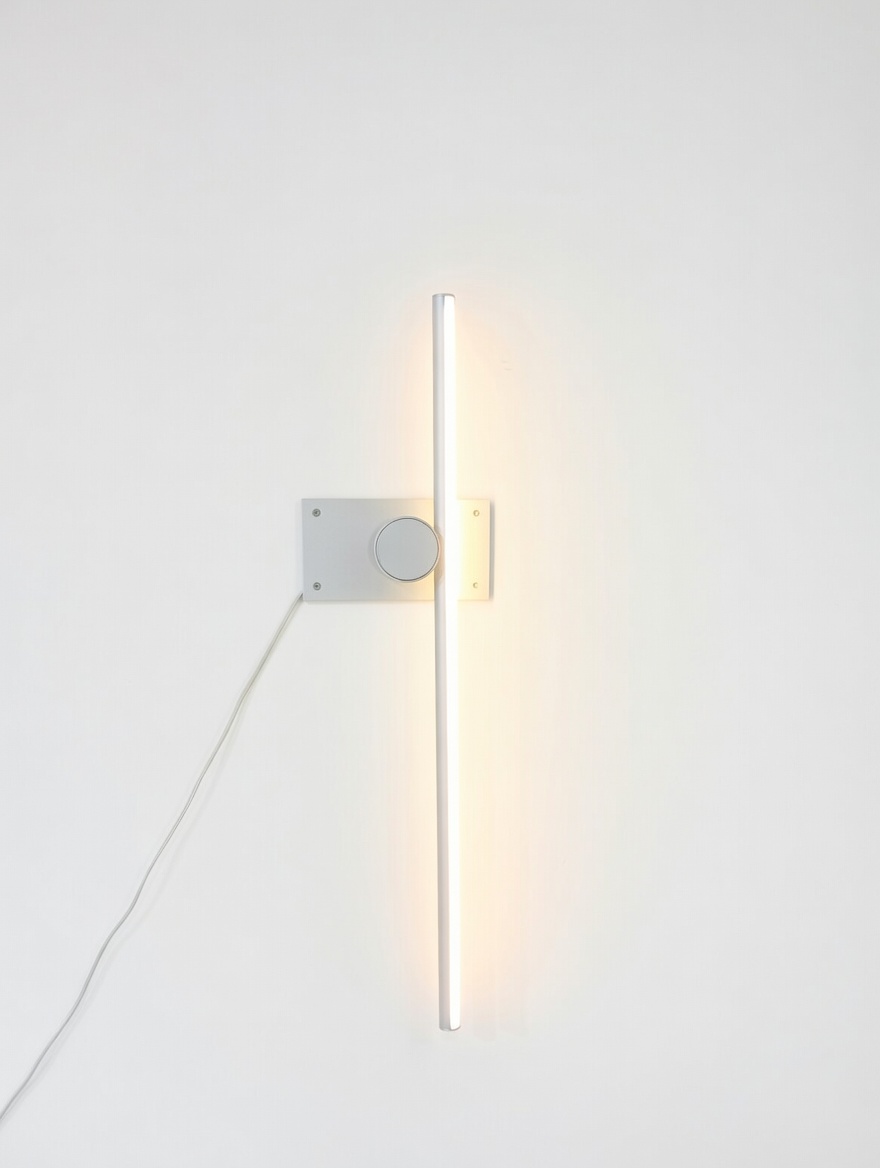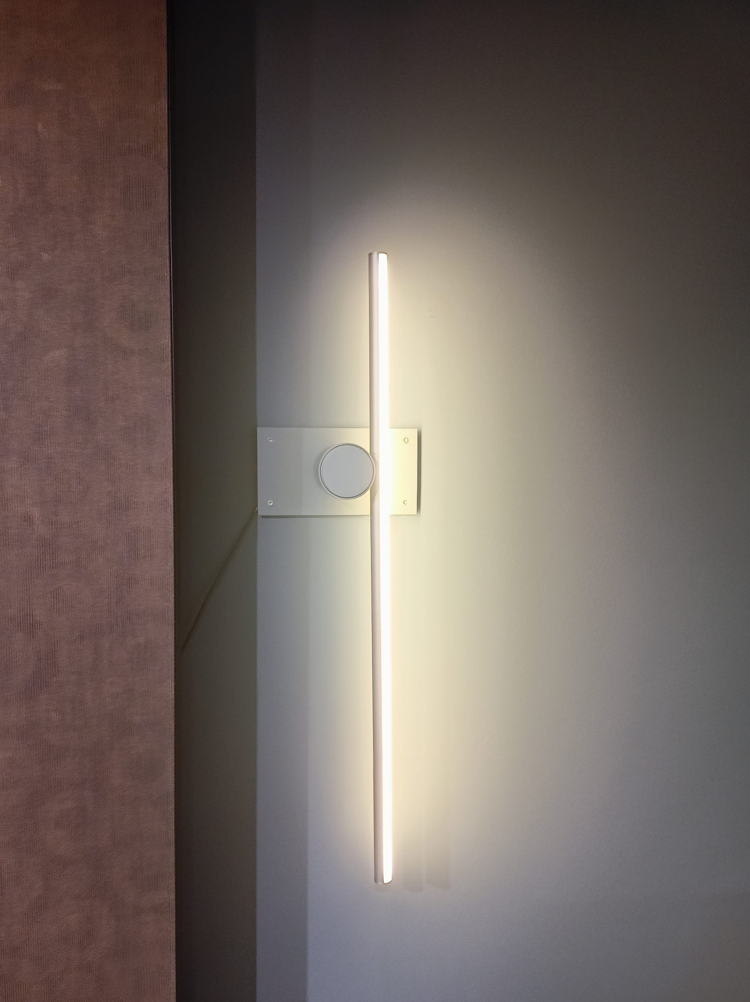Coordinates Wall. Kinkiet do oświetlenia rozproszonego składający się z poziomego drążka (model Wall 1). Każdy słupek składa się z: wytłaczanego i obrobionego aluminiowego korpusu anodowanego na kolor szampański; klosza z platynowego silikonu optycznego; zintegrowanej taśmy LED (CRI 90). Każdy model posiada własną rozetę, której zintegrowana elektronika pozwala na zastosowanie różnych systemów ściemniaczy.