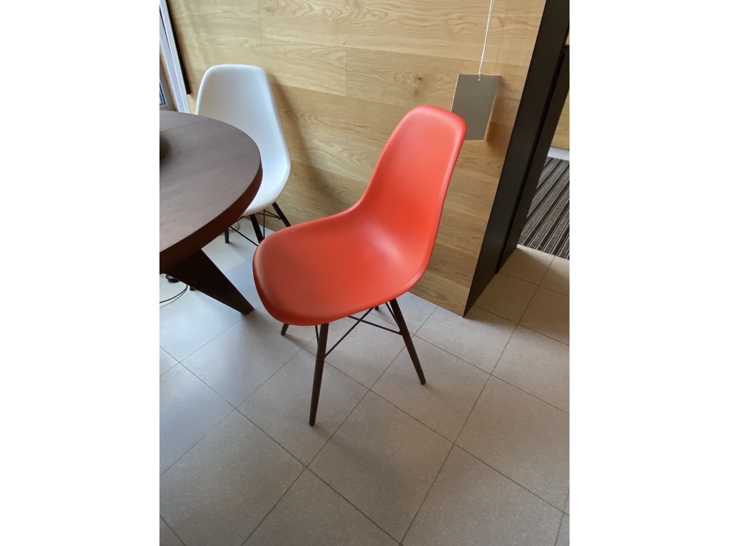 Eames Plastic Chair, czyli EPC zaprojektowane w 1950r. przez Ray & Charlesa Eamsów. Oryginalny kształt był zmieniany poprzez modyfikowanie podstawy krzesła. Wersja DSW to Dining Height Side Chair Wooden Base czyli klasyczne siedzisko na drewnianych nogach.