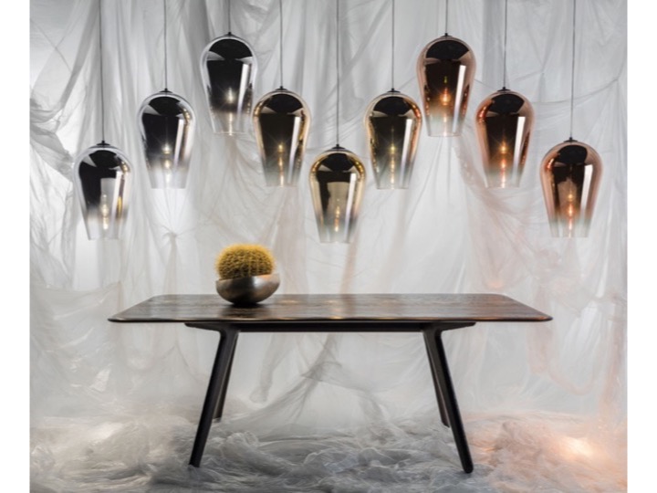 Lampa wisząca Fade Copper sprawia wrażenie, jakby spływała. Sugeruje to zarówno zwężający się ku dołowi kształt jak i zanikający w dolnej części kolor. Po włączeniu lampa daje na bokach miękkie światło, które łagodnie przechodzi w cień, a do dołu świeci światłem dość mocnym.