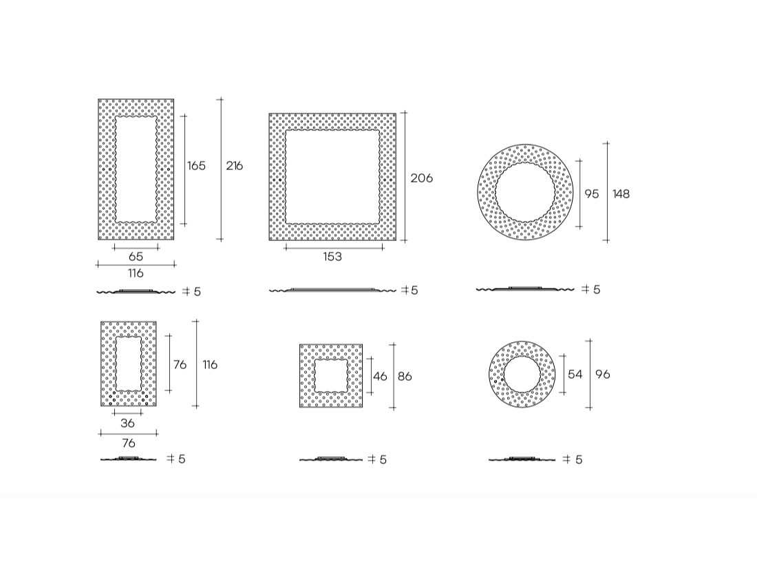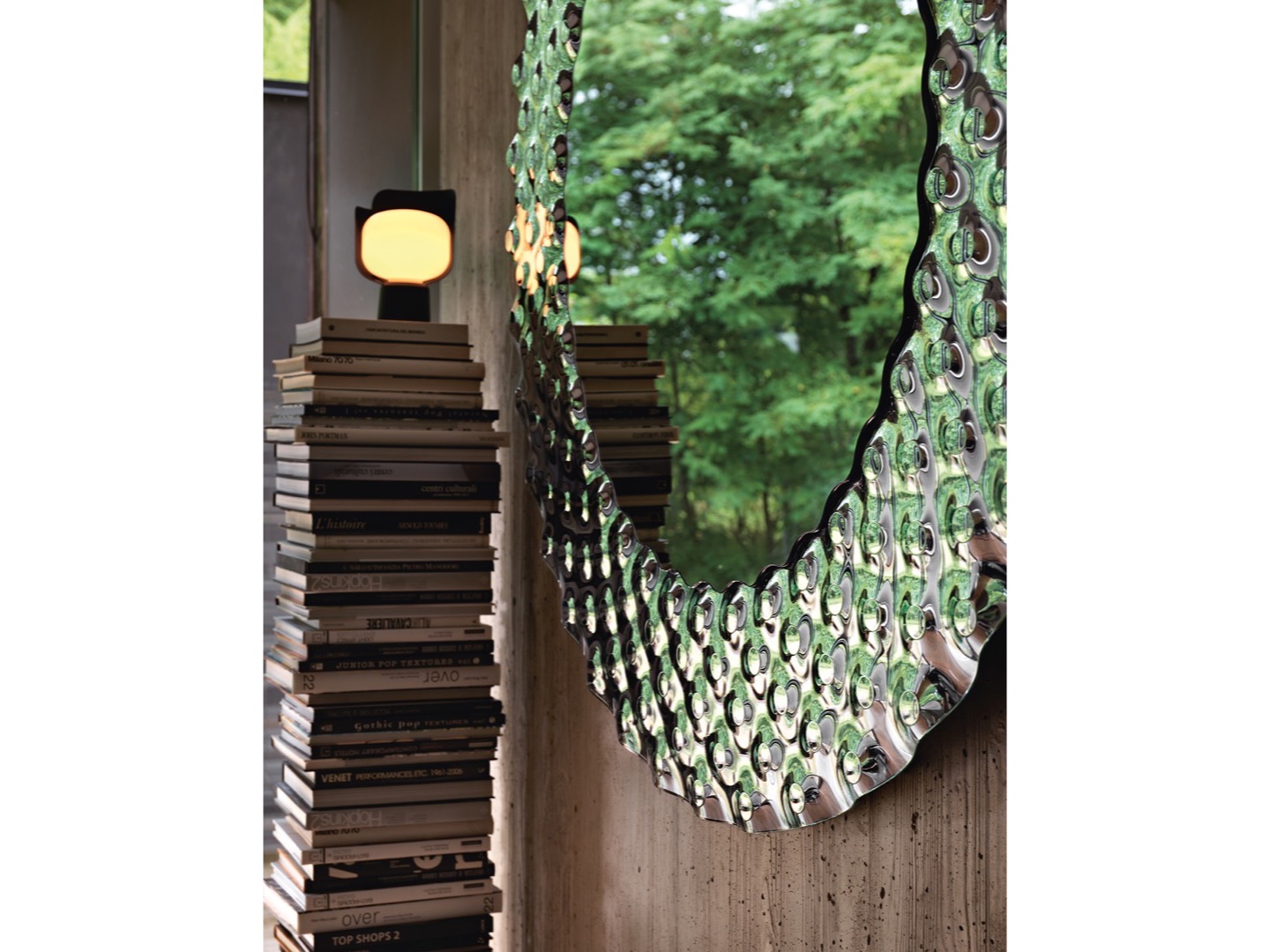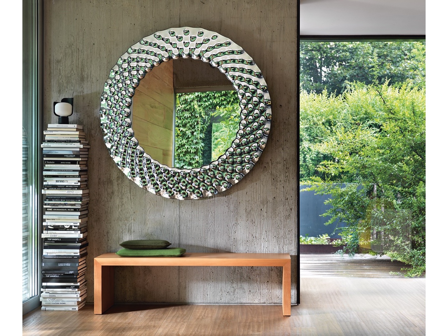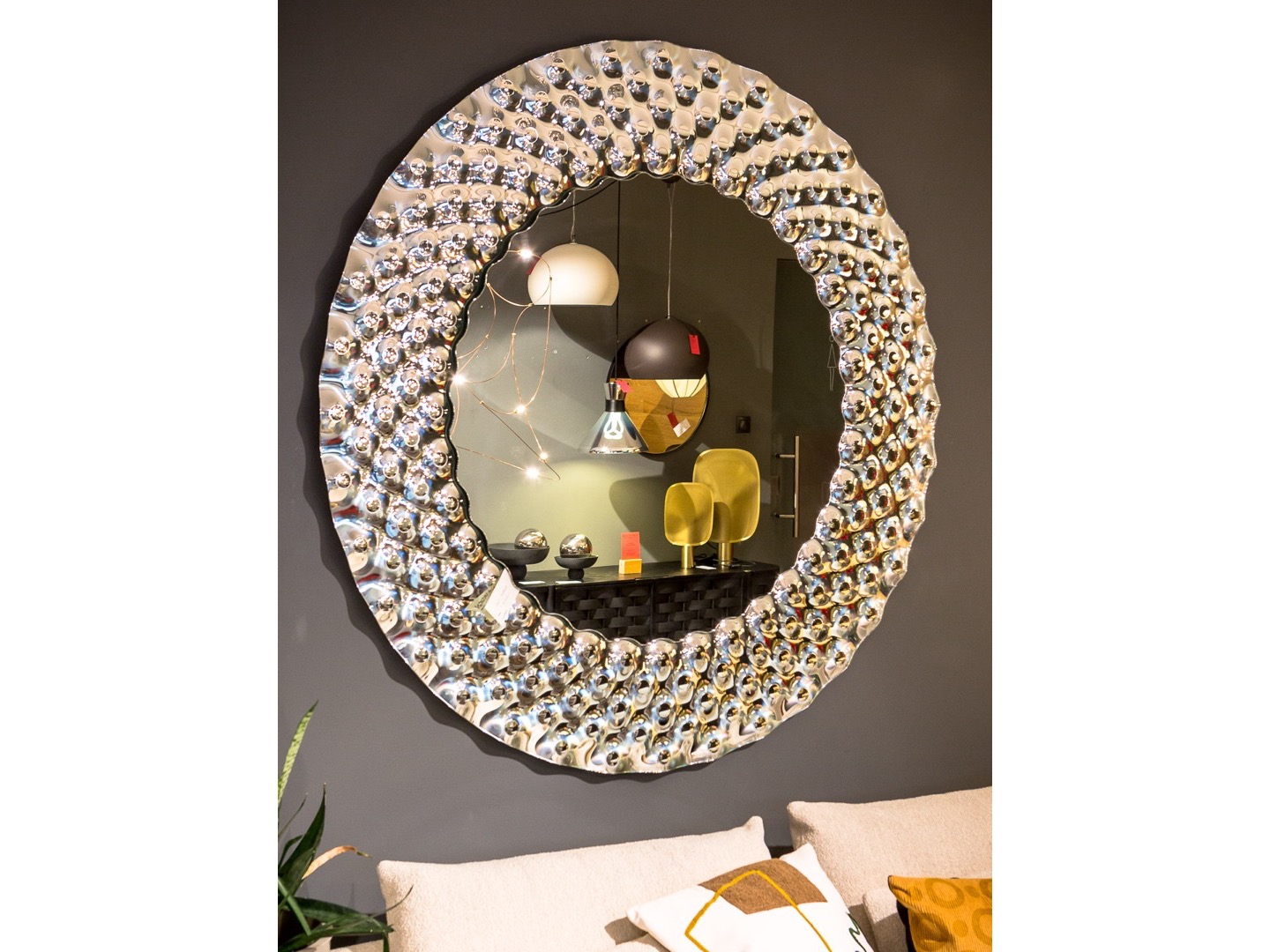 Lustro ścienne Pop wykonane jest ze szkła termotopliwego o grubości 6 mm. Rama lustra jest posrebrzana, natomiast tylna rama została zrobiona z lakierowanego metalu. Można je zawiesić poziomo lub pionowo.