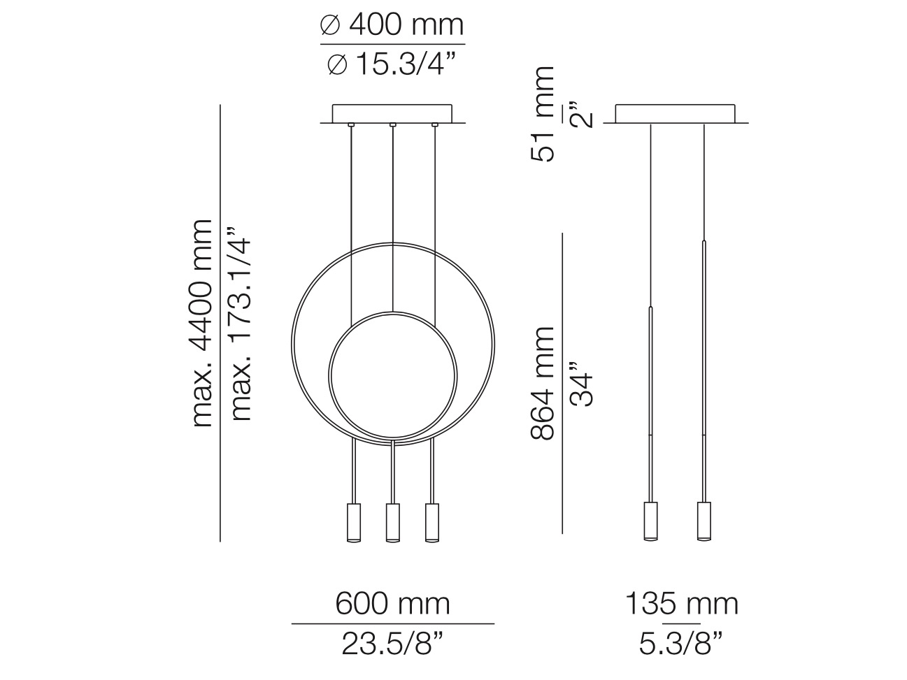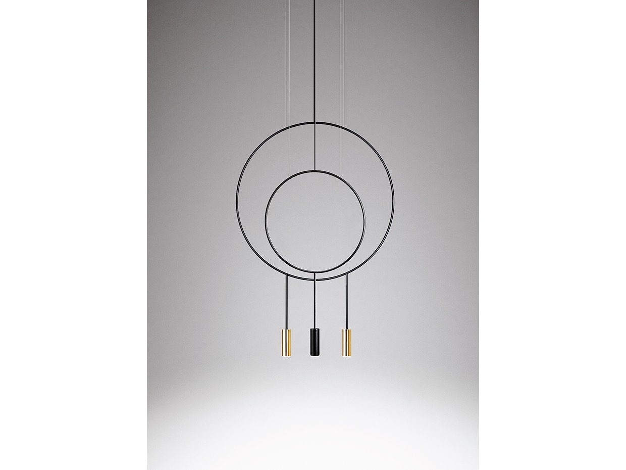 Revolta - lampa wisząca z metalowym korpusem ze zintegrowaną ściemnialną diodą LED, cylindrycznymi głowicami aluminiowymi i akrylowymi (PMMA) kloszami soczewkowymi. Regulowana wysokość i indywidualny baldachim, odpowiedni do tworzenia kompozycji.