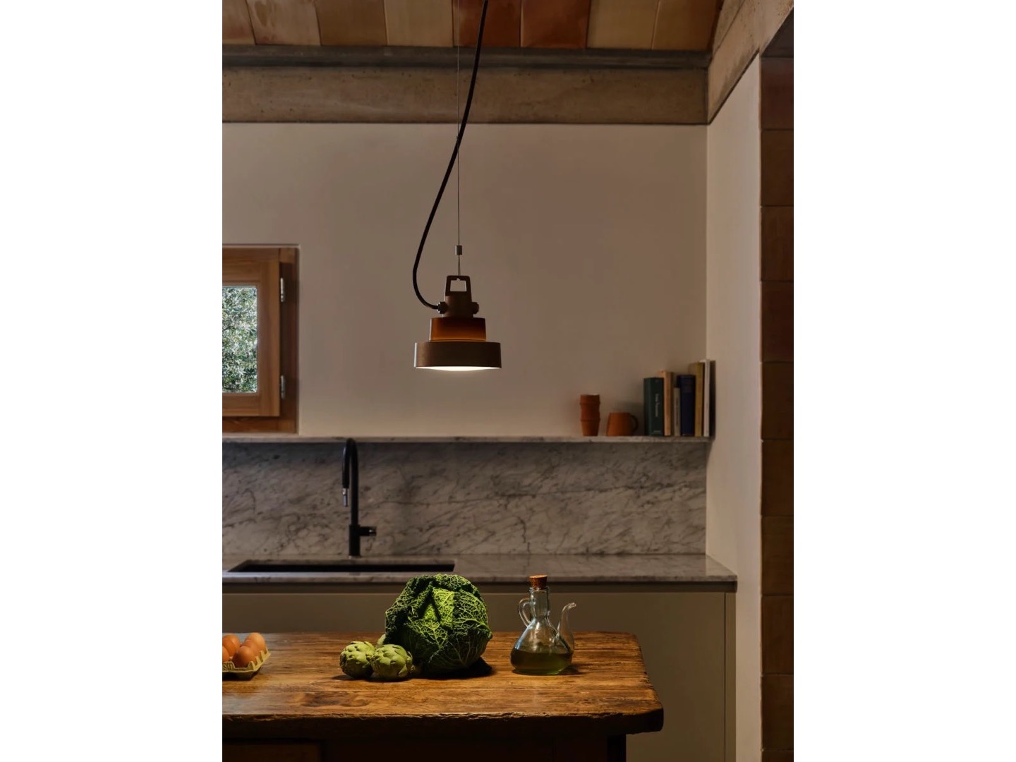 Jakość projektu produktu zależy od tego, czy wytrzyma on próbę czasu. Plaff-on! od ponad dekady oświetla sufity i ściany wewnętrzne i zewnętrzne, a od niedawna, dzięki wersji słupkowej, także ogrody. Kolekcja, obecnie poszerza się o nową wersję lampy wiszącej w całkowicie industrialnym klimacie. Solidna i kompaktowa konstrukcja o szerokości 16 cm, w kolorze czarnym lub rdzawo-brązowym, otacza szklany dyfuzor.