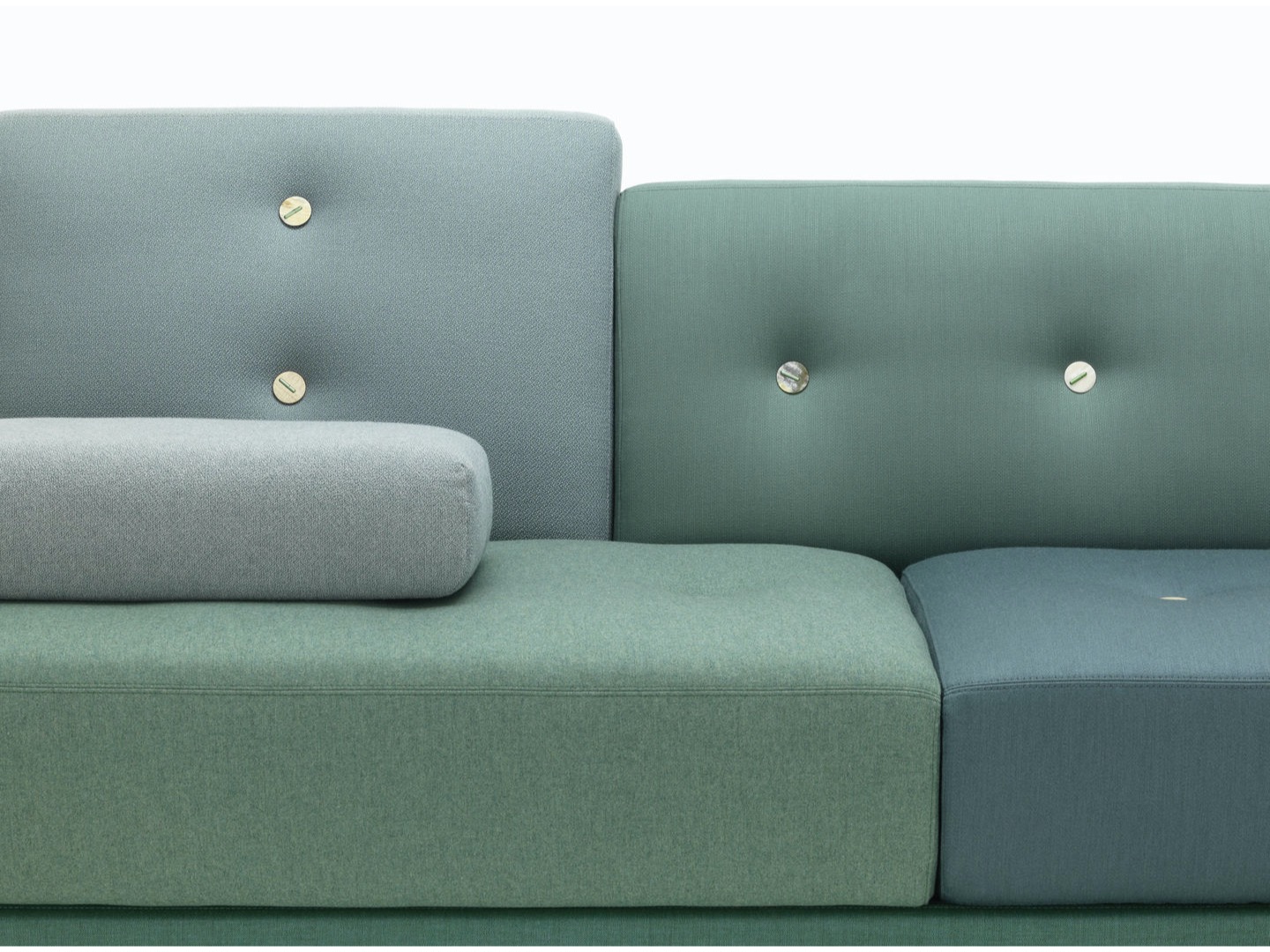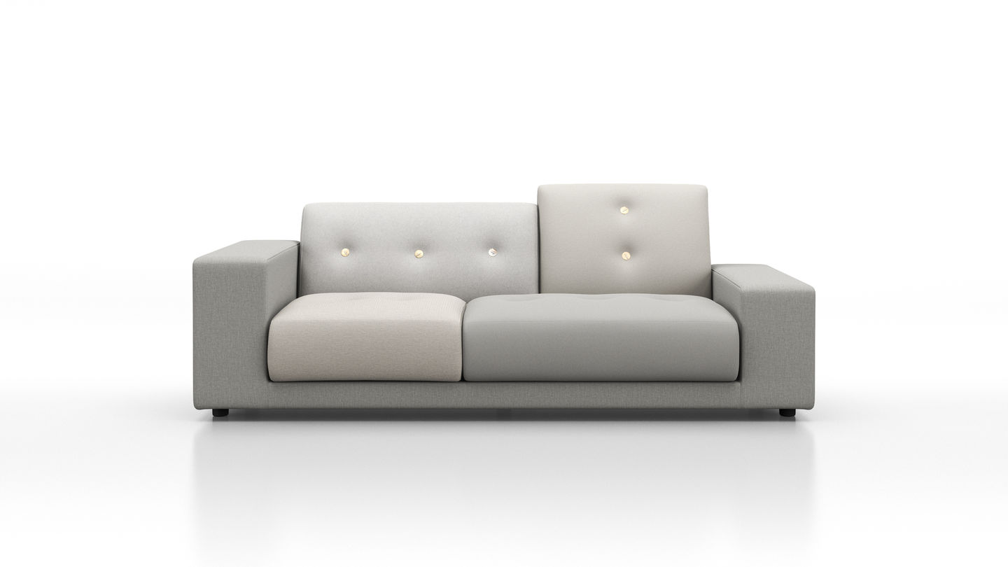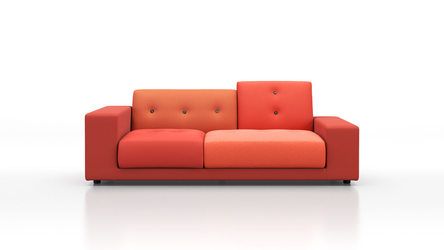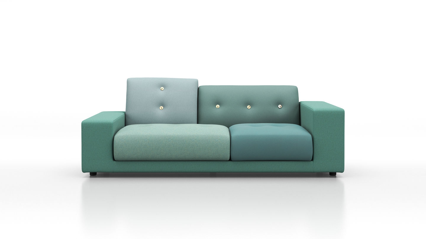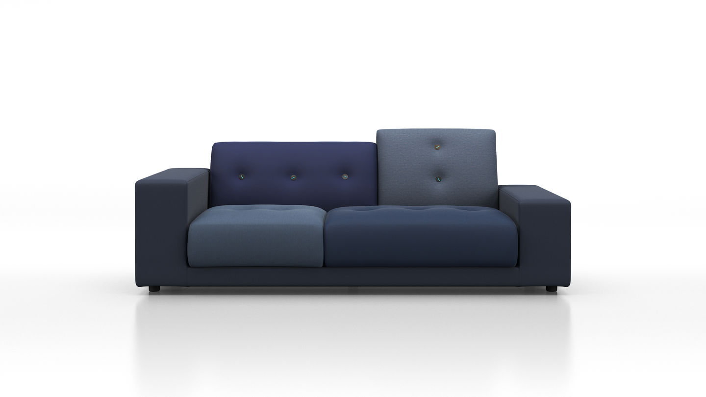 Sofa Polder ma rozłożysty kształt, horyzontalnie rozciągający się w przestrzeni. Hella Jongerius uważnie wybrała pięć kombinacji kolorystycznych i tkanin, udekorowała je guzikami wykonanymi z naturalnych materiałów.
