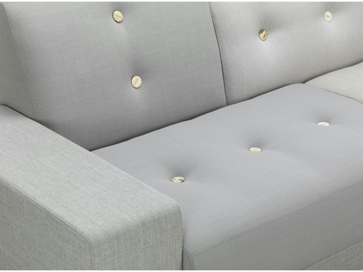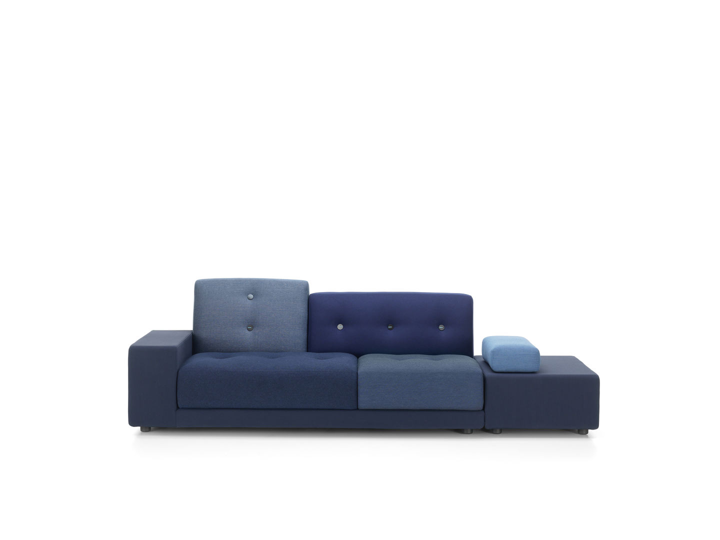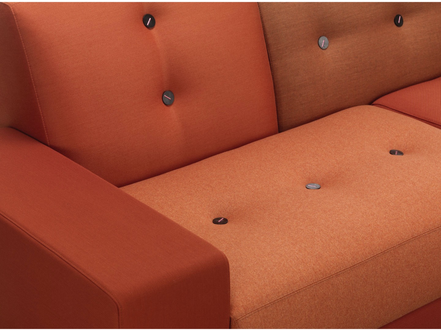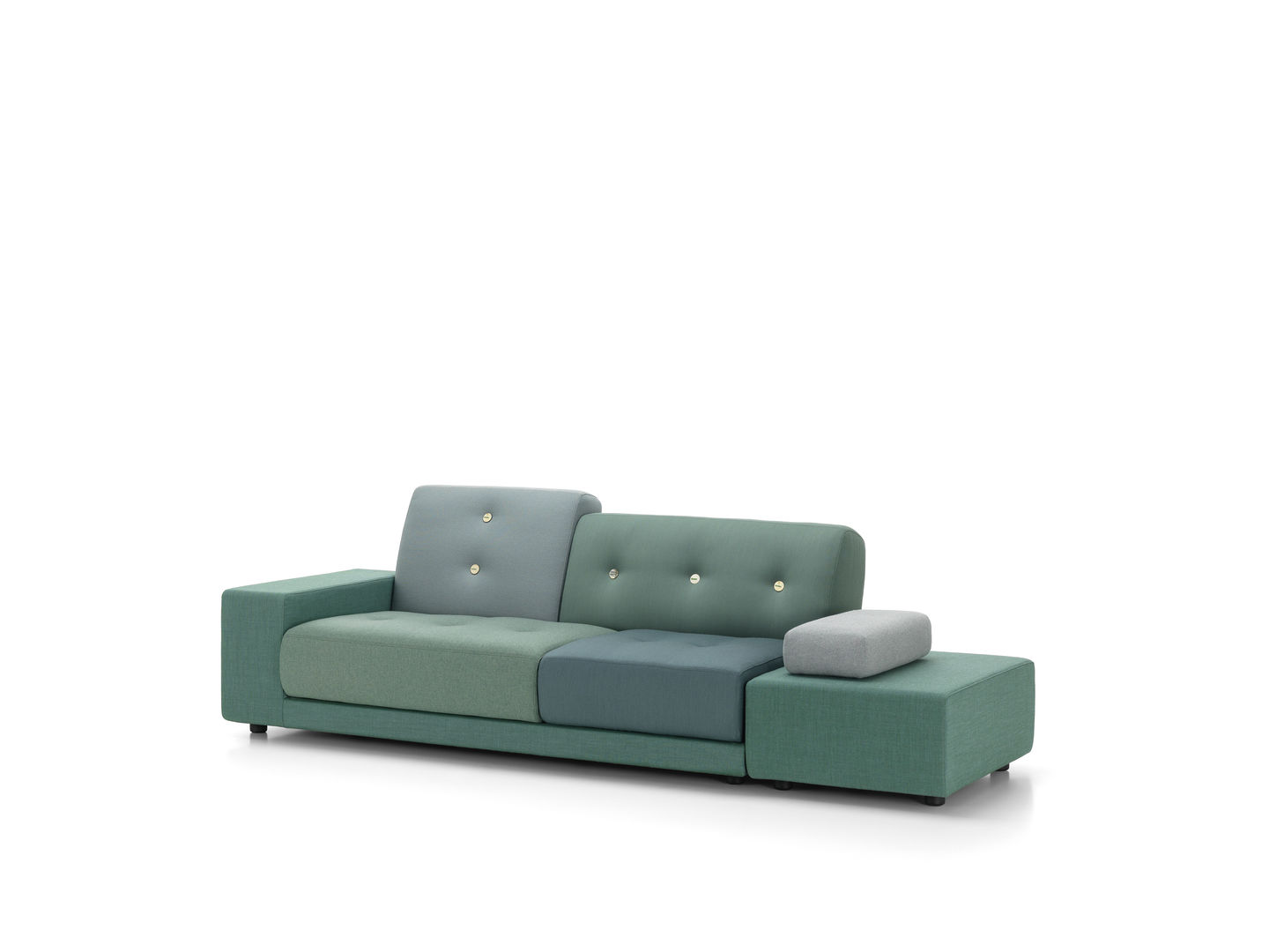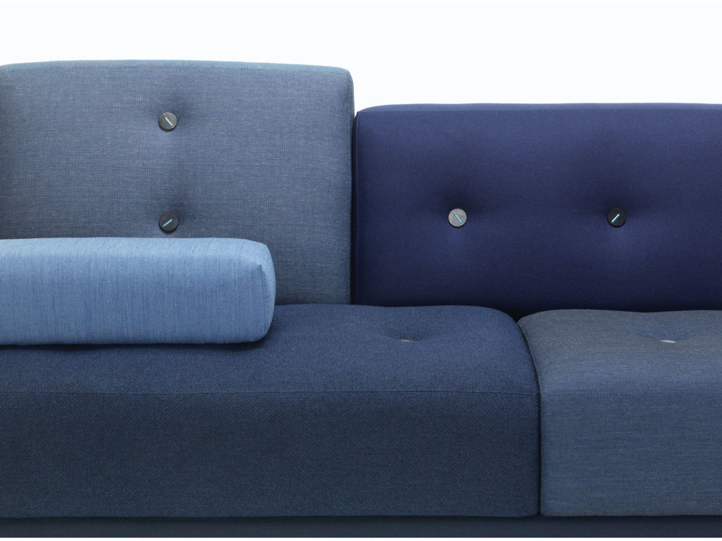 Sofa Polder ma rozłożysty kształt, horyzontalnie rozciągający się w przestrzeni. Hella Jongerius uważnie wybrała pięć kombinacji kolorystycznych i tkanin, udekorowała je guzikami wykonanymi z naturalnych materiałów.