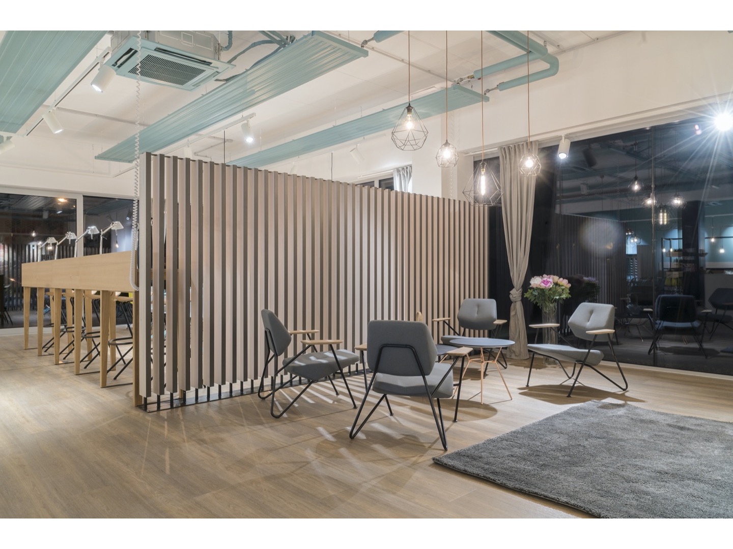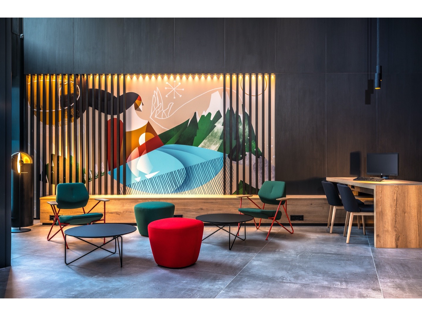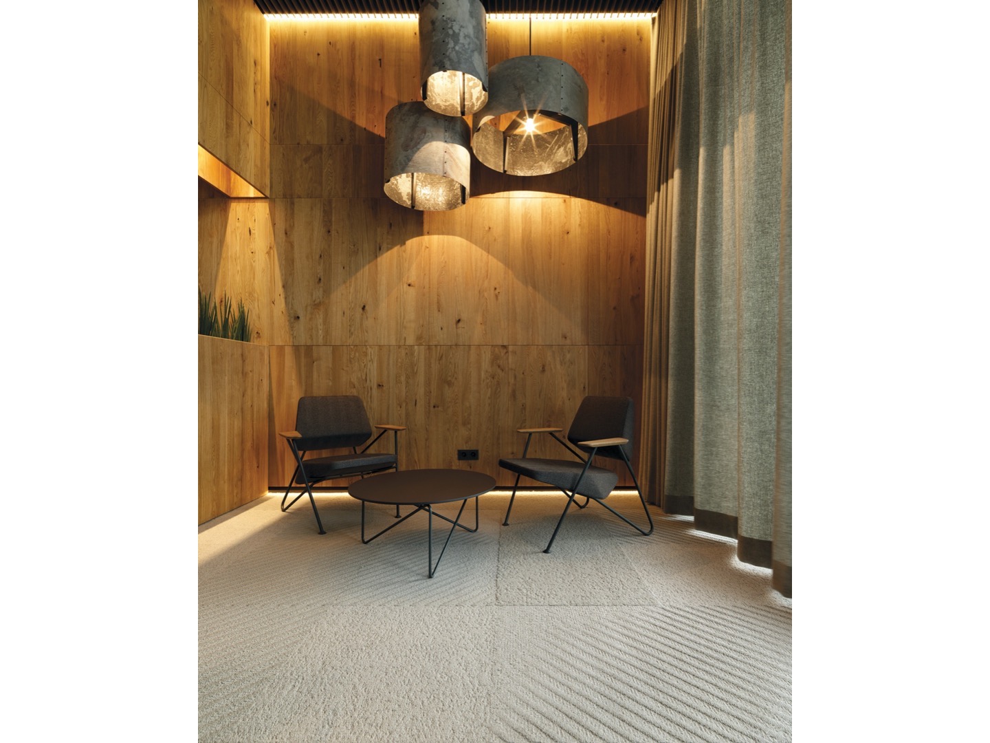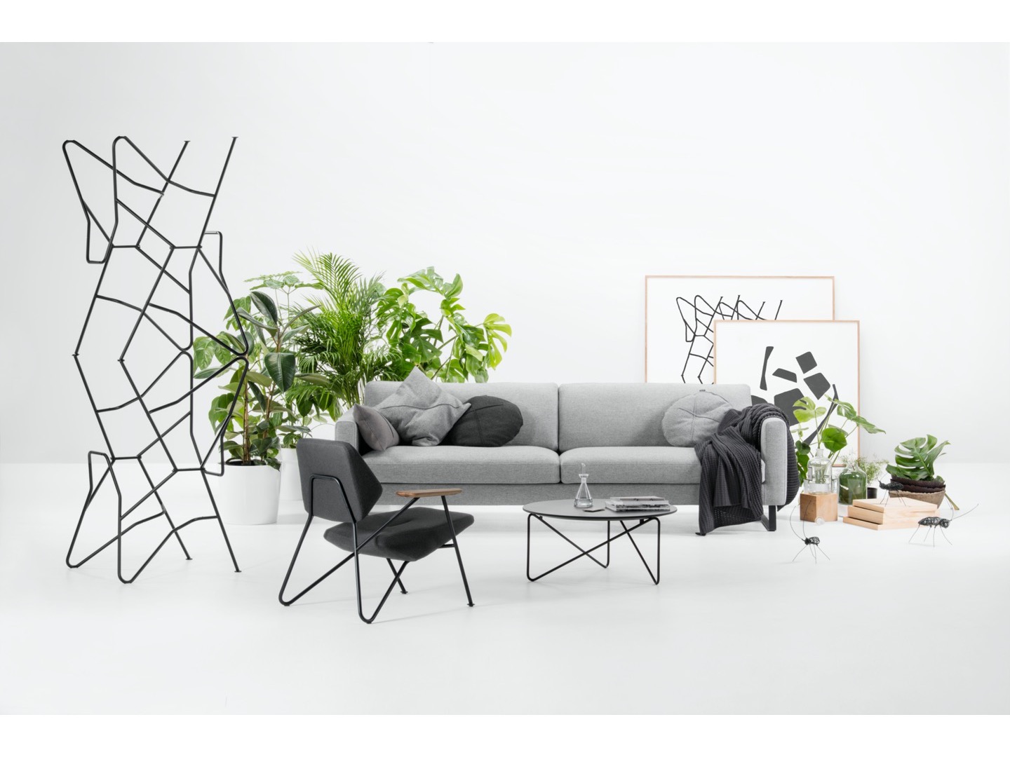 Dominująca trójkątna forma jest zaakcentowana z boku, ale gdy obserwator zaczyna się poruszać, trzy trójkąty podstawy nakładają się na złożone trójwymiarowe rysunki. Kontrapunktowanie wysokości i powierzchni blatów stołów powoduje radykalną różnicę nachylenia linii ukośnych stalowych prętów.