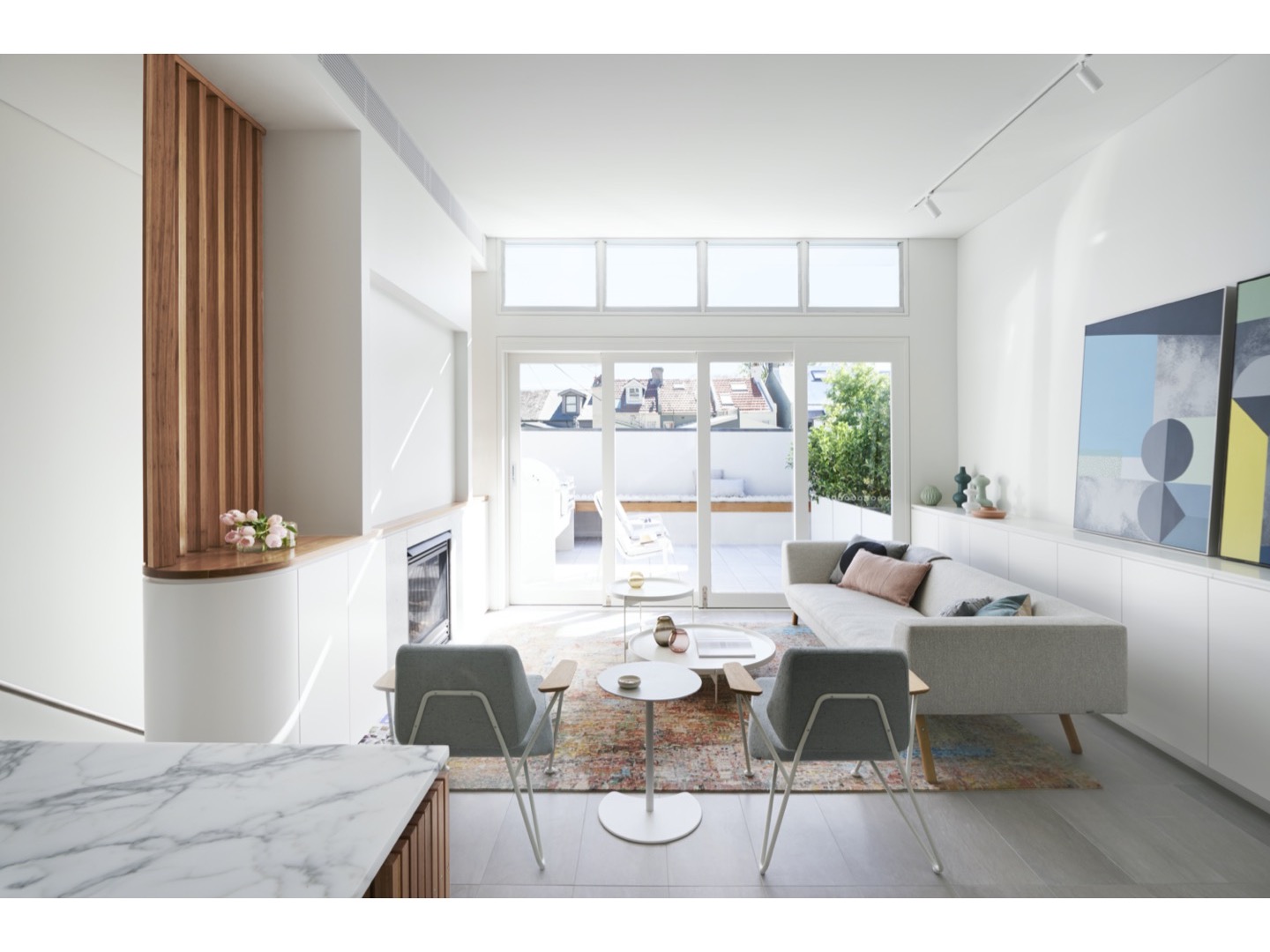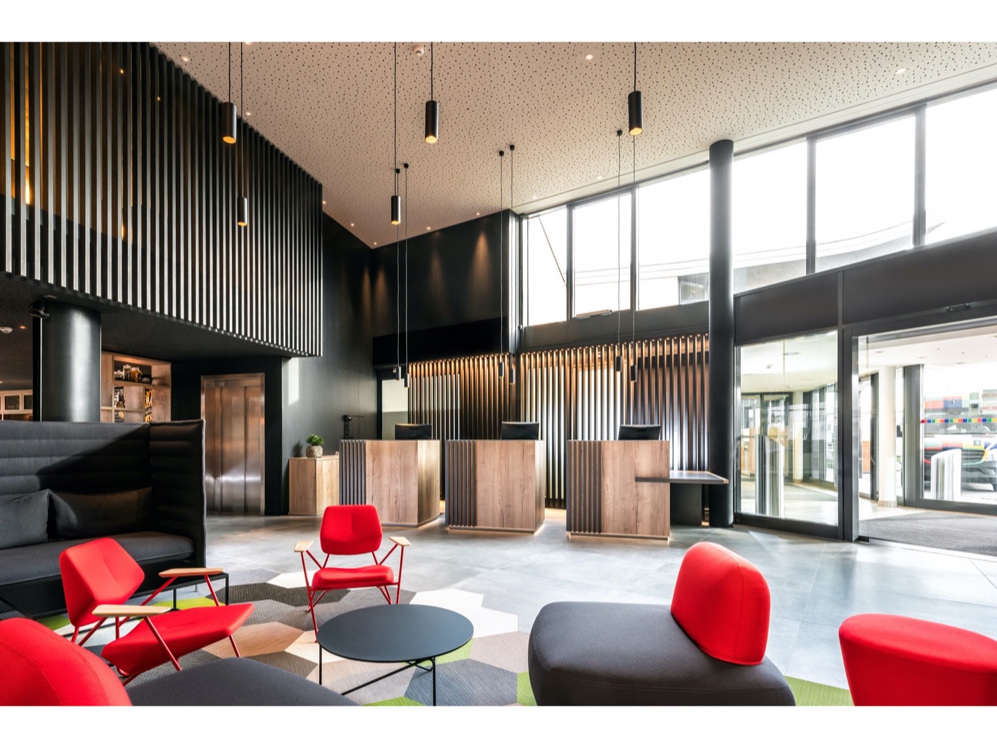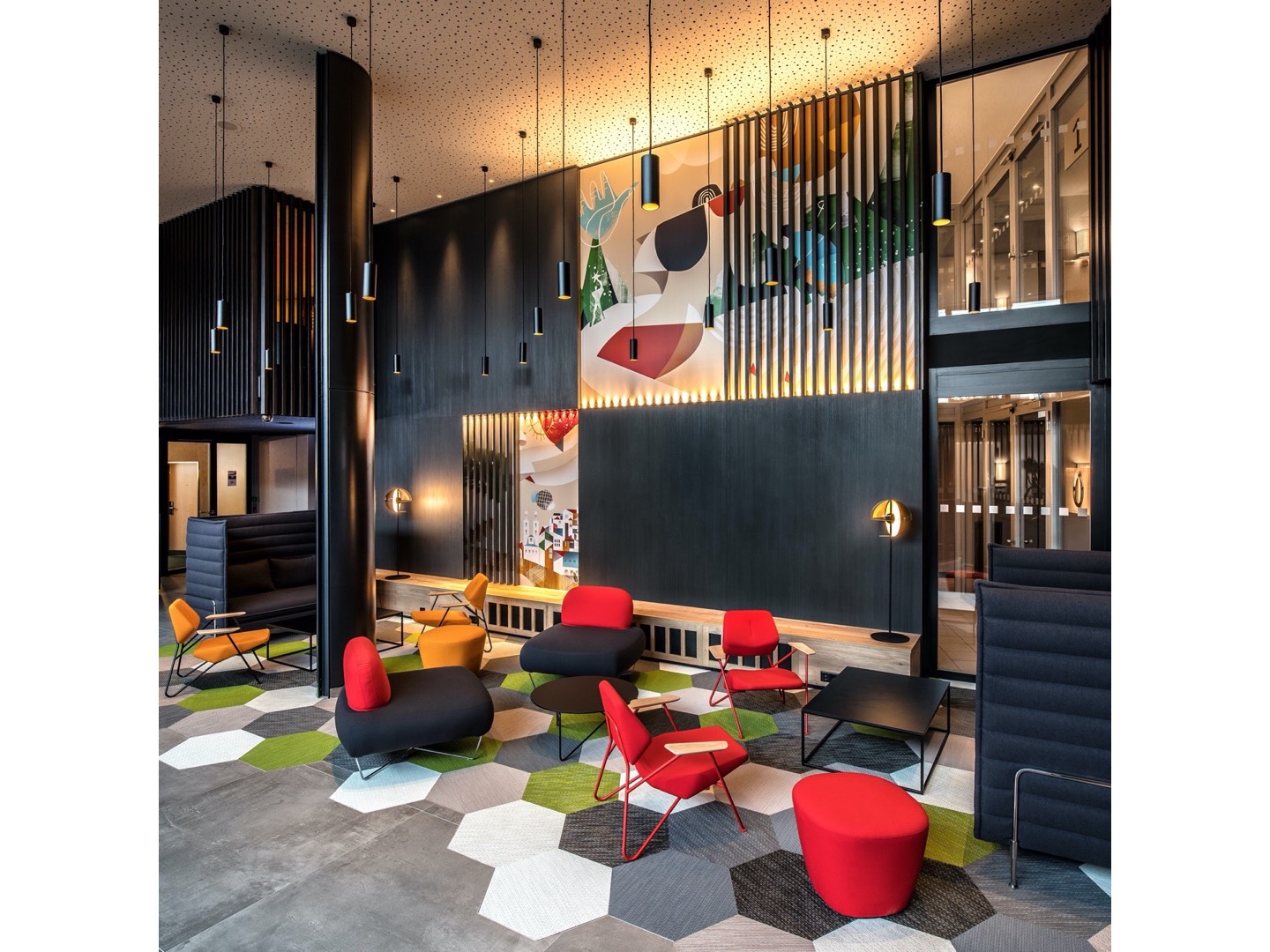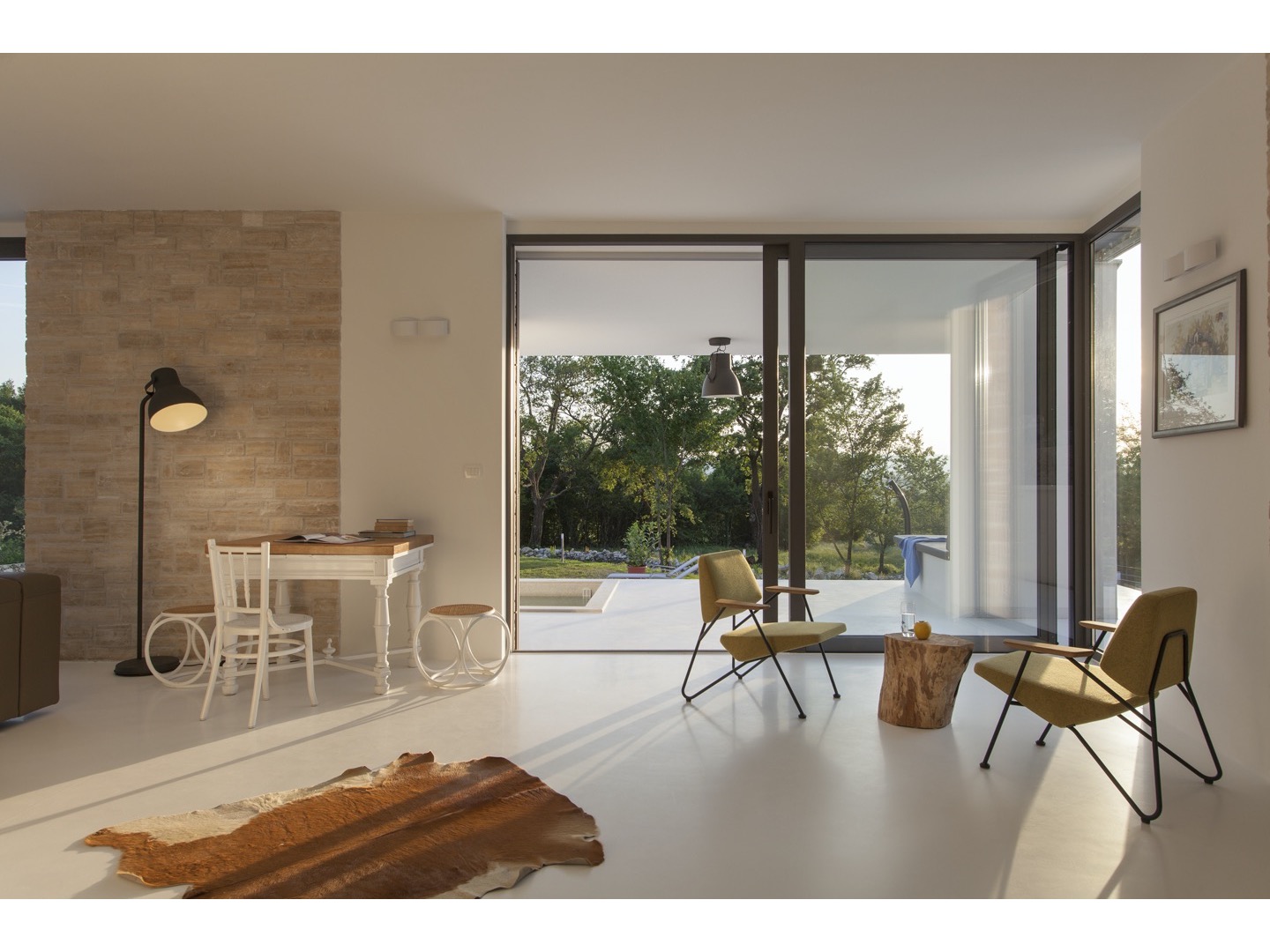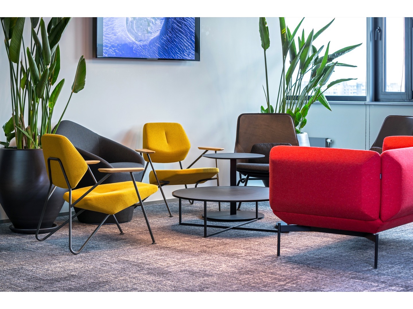 Dominująca trójkątna forma jest zaakcentowana z boku, ale gdy obserwator zaczyna się poruszać, trzy trójkąty podstawy nakładają się na złożone trójwymiarowe rysunki. Kontrapunktowanie wysokości i powierzchni blatów stołów powoduje radykalną różnicę nachylenia linii ukośnych stalowych prętów.