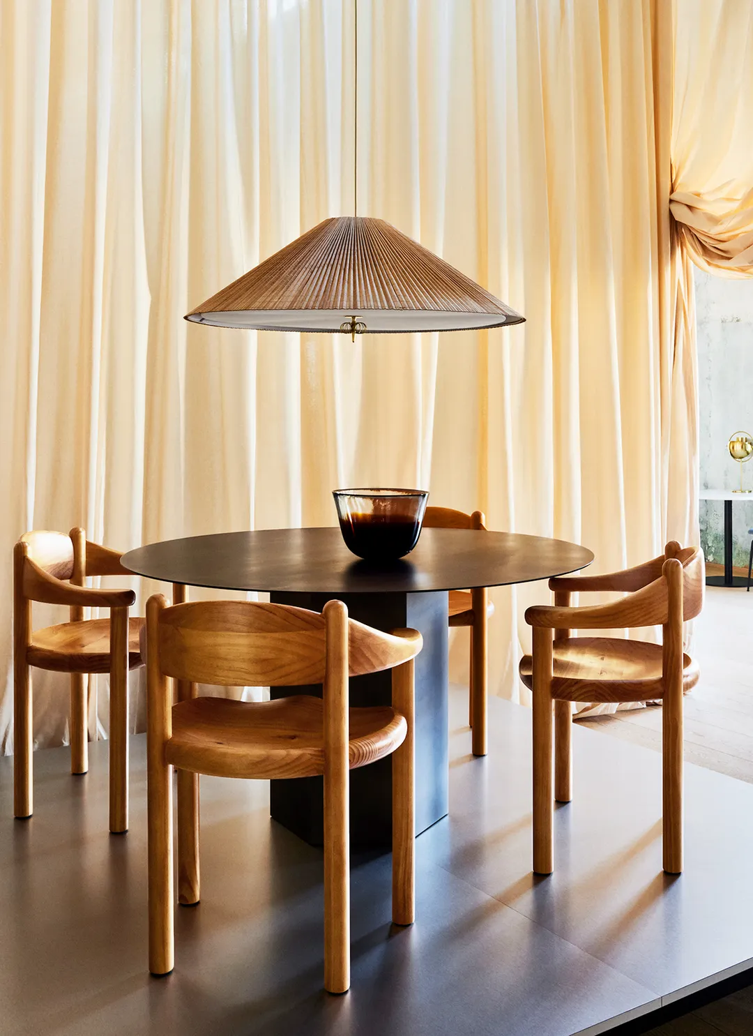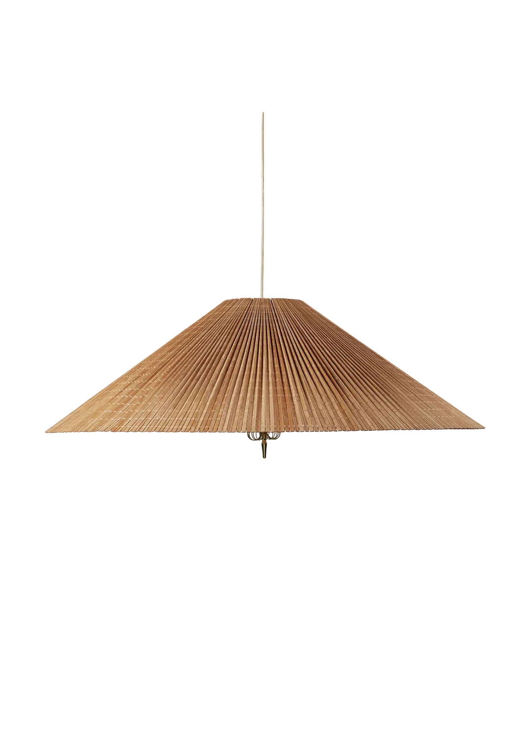 Zaprojektowana przez legendarnego Paavo Tynella lampa wisząca z 1972 roku ma stożkowy klosz z bambusa, wykonany przez mistrzów rzemiosła. Listwy bambusowe są ręcznie zszywane w plisowaną matę i mocowane ręcznie do drucianej ramy, z lnianą podszewką pomiędzy nimi. Kieruje to światło w dół w stronę podstawy i tworzy rozproszoną poświatę wokół klosza i w górę, gdy listwy bambusowe są przebijane przez światło. Charakterystyczne mosiężne detale Tynella są również obecne, dodając powiewu ponadczasowości i doskonale uzupełniając ciepły ton drewna i światła. Pod żarówką materiałowy dyfuzor moduluje światło, a pod nim dekoracyjny mosiężny detal nadaje każdej lampie odrobinę charakteru i subtelnie wpływa na grę światła, którą generuje.