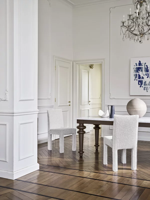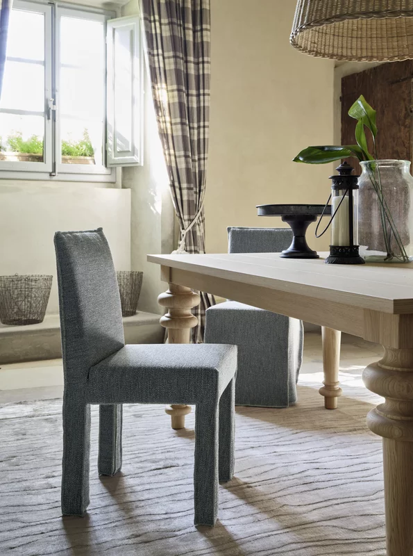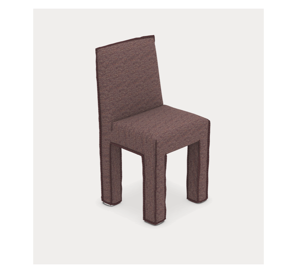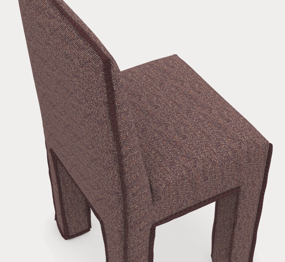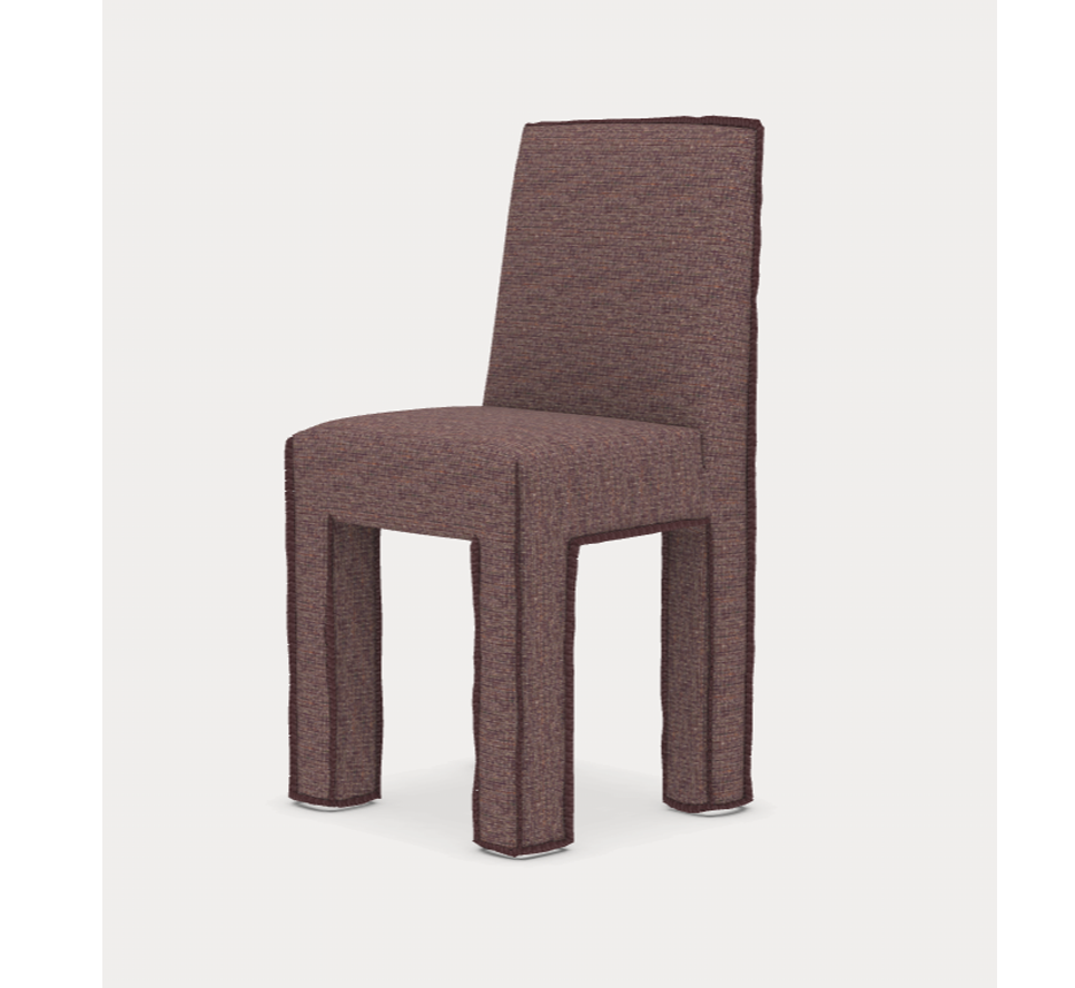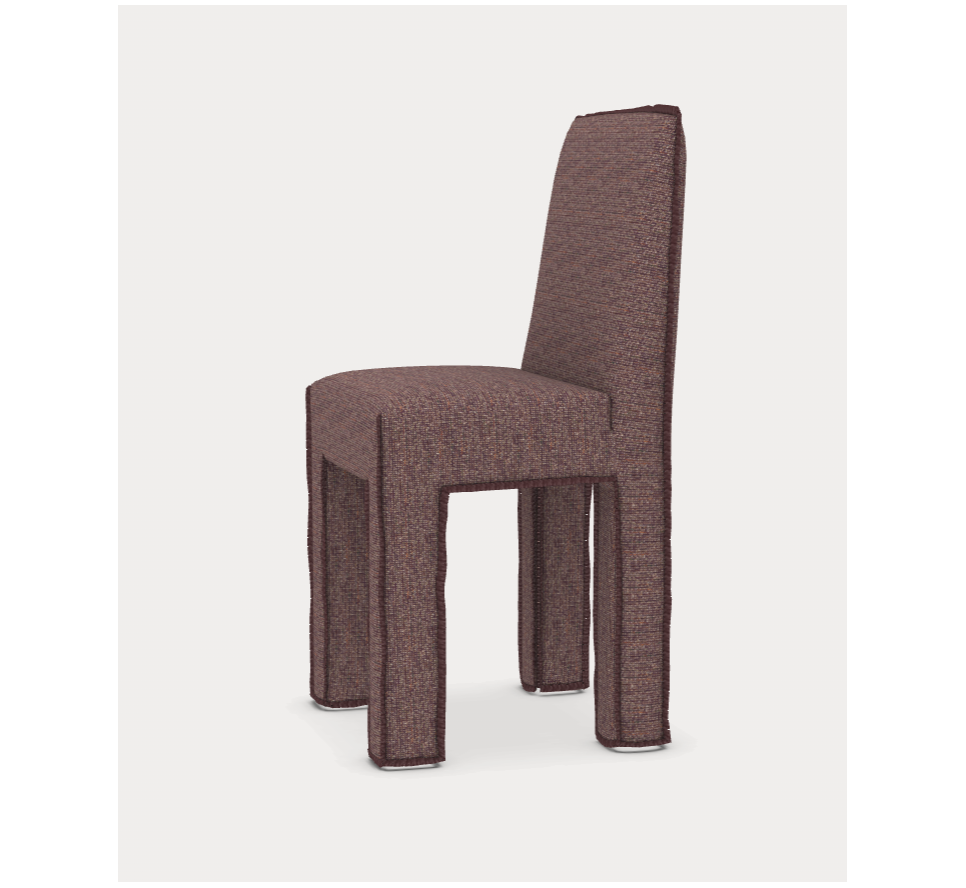 Krzesło do jadalni charakteryzujące się kwadratowym oparciem i nogami o zaokrąglonych kształtach, całkowicie pokryte tapicerką, która biegnie wzdłuż całego siedziska i podkreśla jego profil oraz minimalistyczną konstrukcję, charakteryzującą się czystymi, wyraźnymi liniami geometrycznymi.