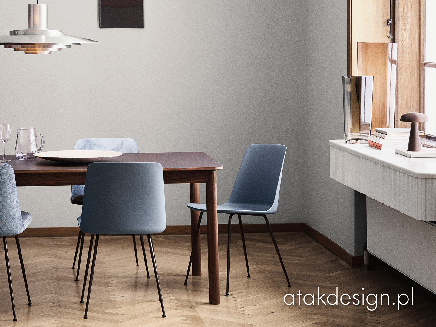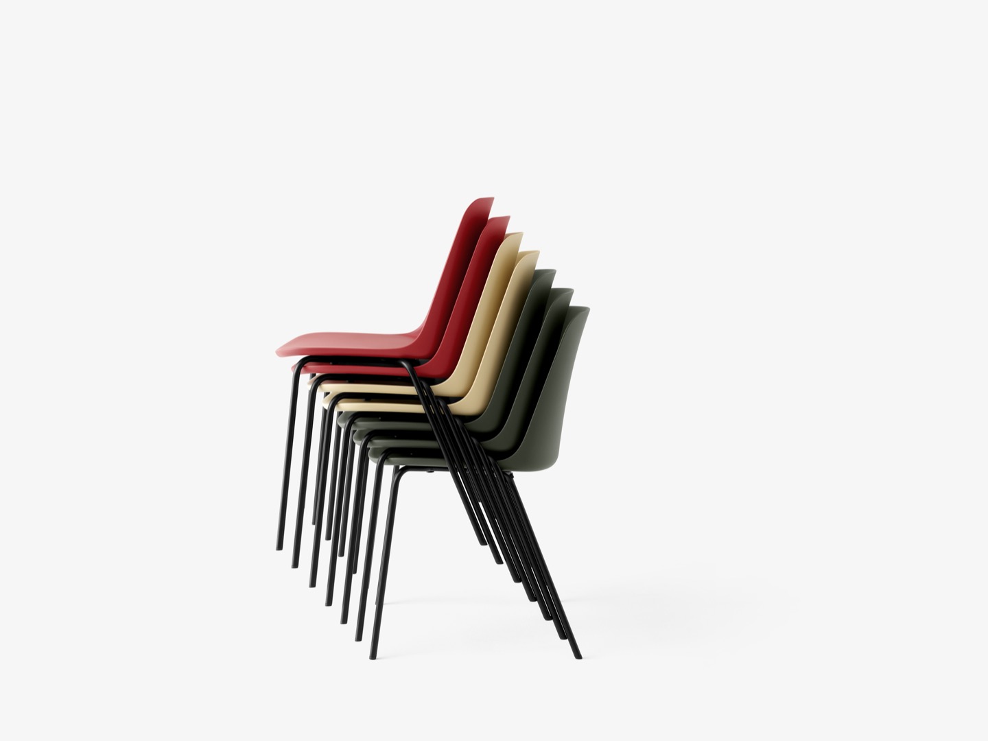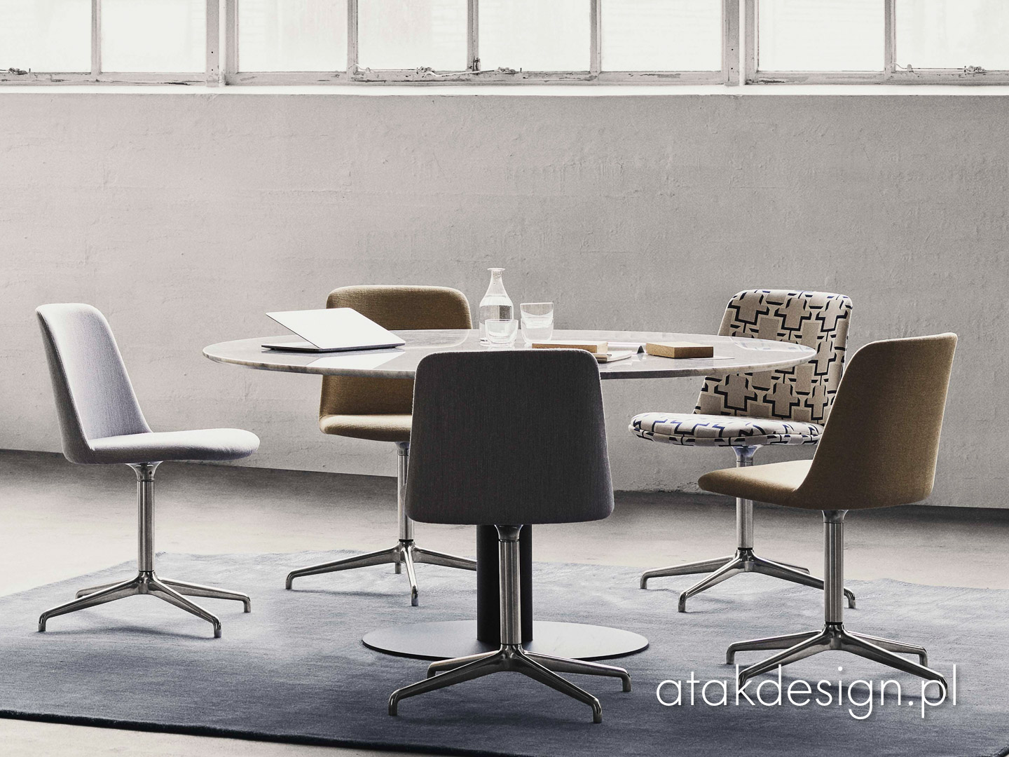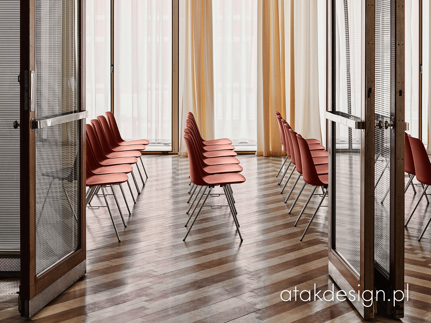 W kolekcji znajdują się między innymi krzesła tapicerowane, z bazą na kółkach, sztaplowane i dające możliwość łączenia w rzędy.