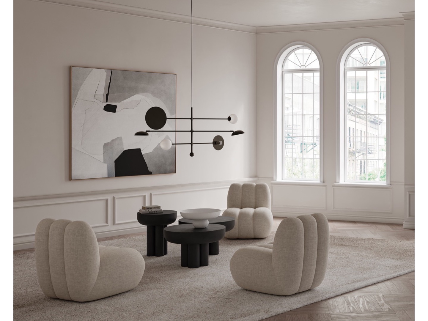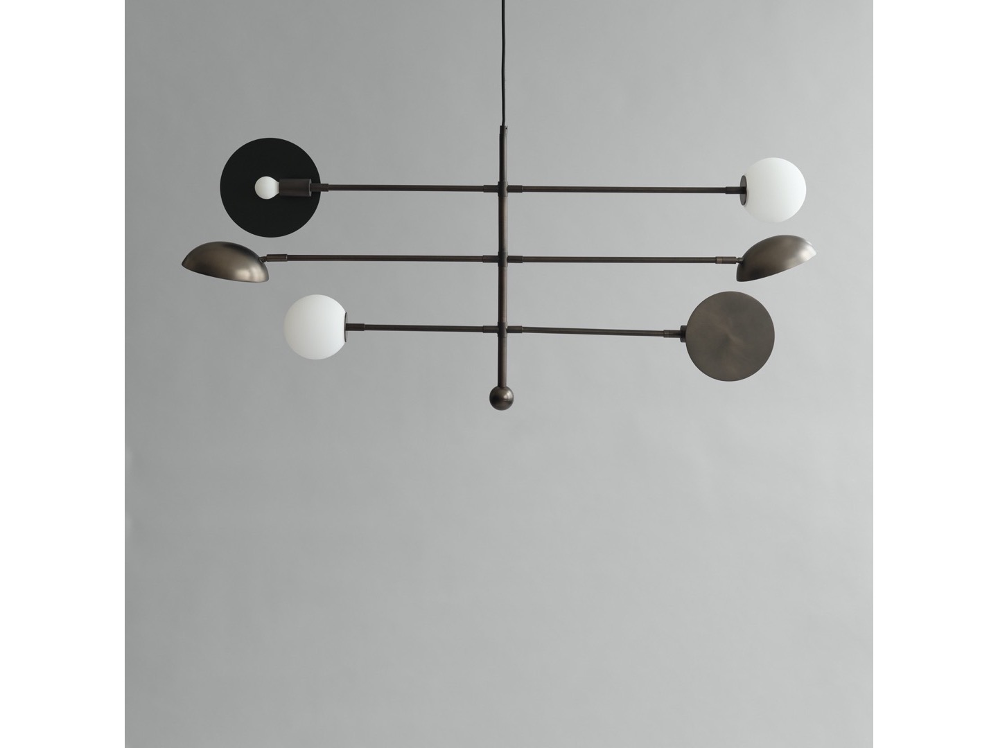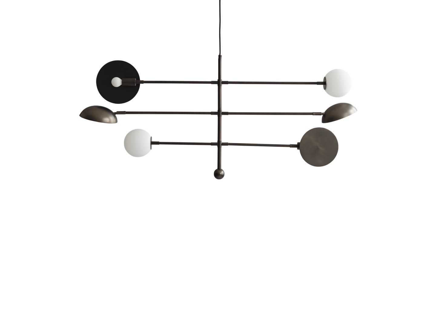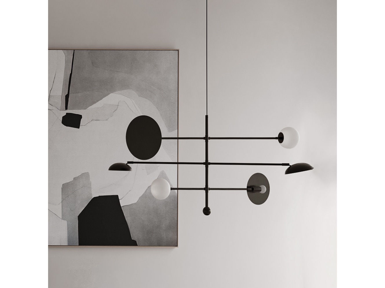 Zainspirowany futurystycznym designem lat 70. i epoką kosmosu, żyrandol Sahn to przede wszystkim ruch i elastyczność. Ramiona lampy i klosz mogą się obracać i skręcać w różnych kierunkach, podkreślając niepowtarzalne i rzeźbiarskie oświetlenie pomieszczenia.