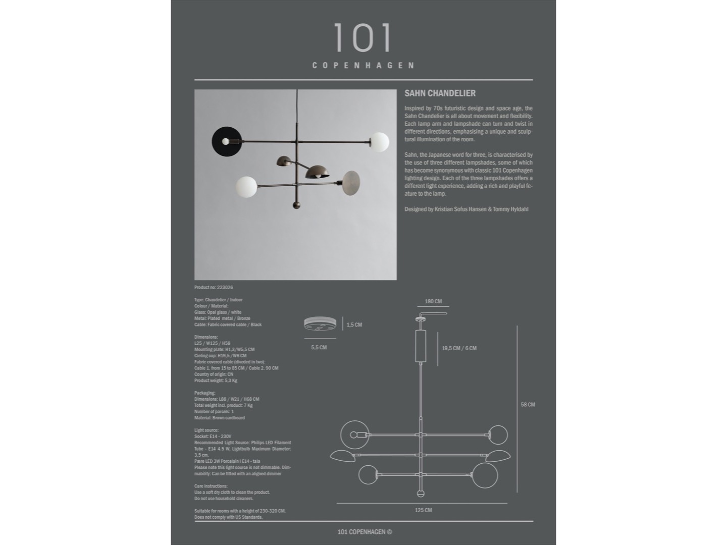 Sahn, japońskie słowo oznaczające trzy, charakteryzuje się zastosowaniem trzech różnych kloszy, z których niektóre stały się synonimem klasycznego projektu oświetlenia 101 Copenhagen. Każdy z trzech kloszy oferuje inne wrażenia świetlne.
