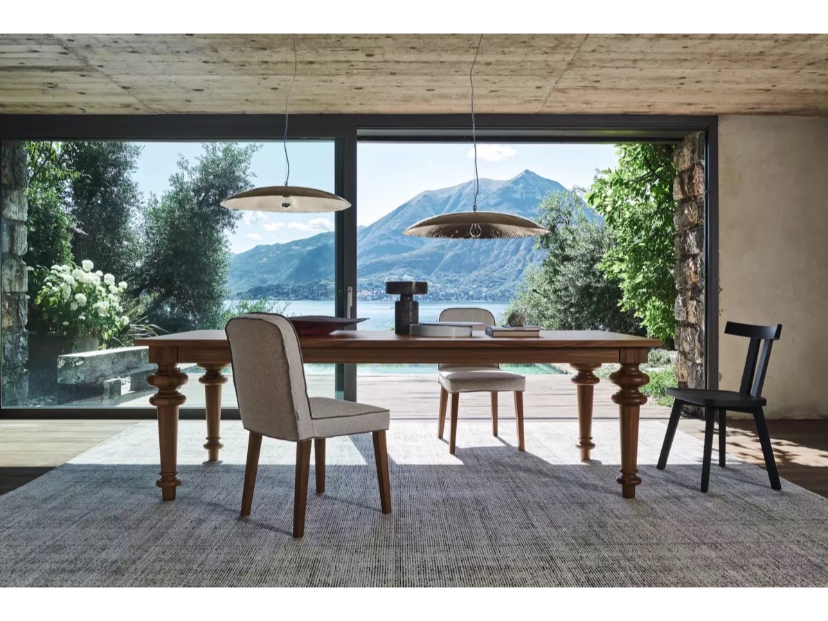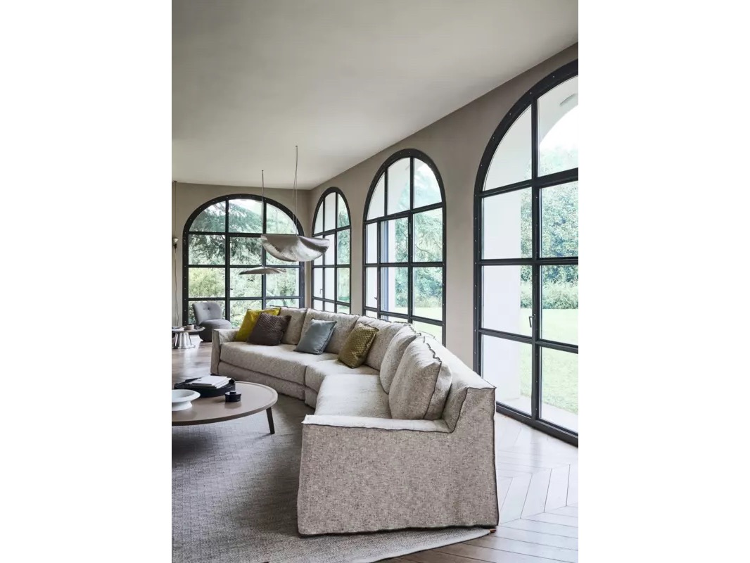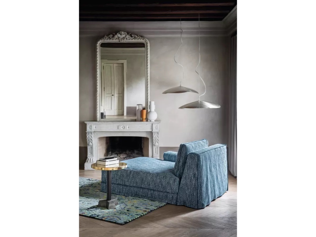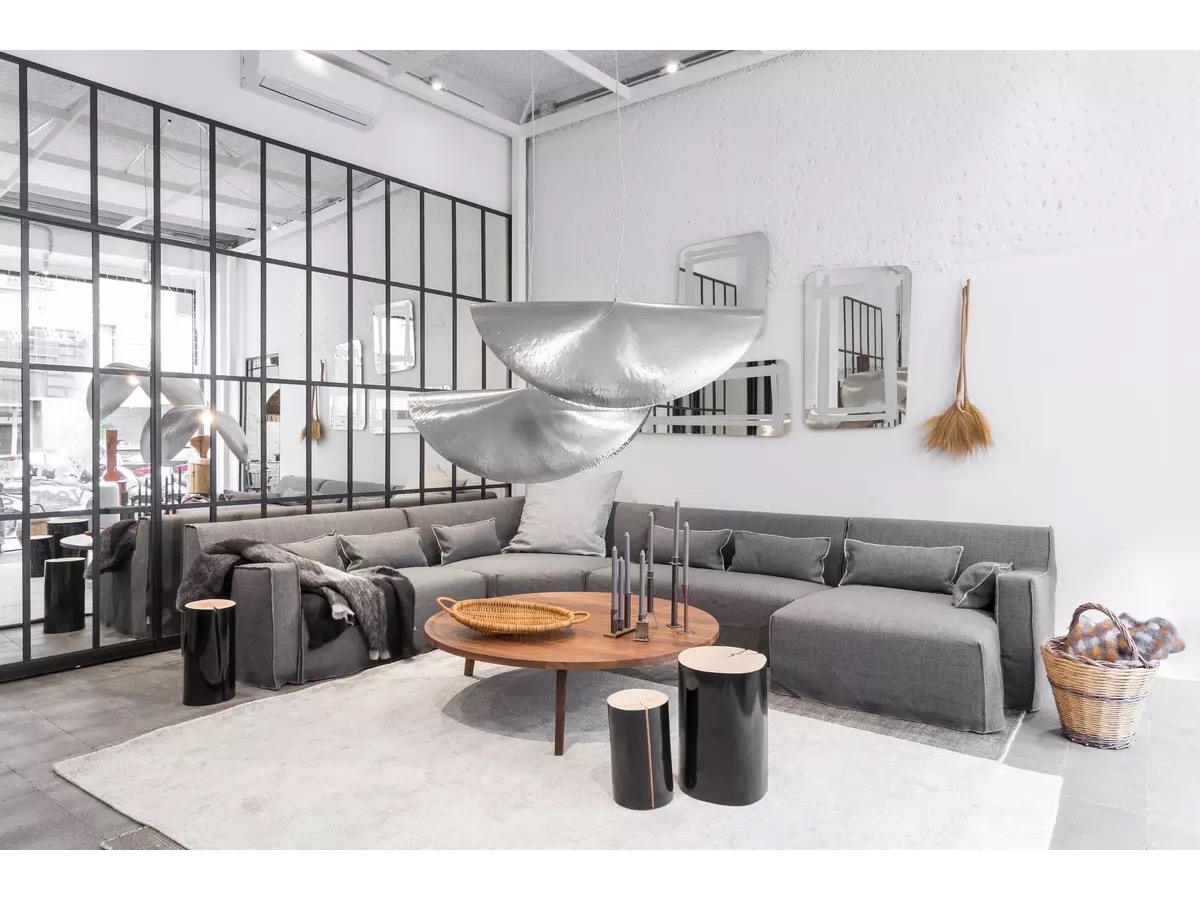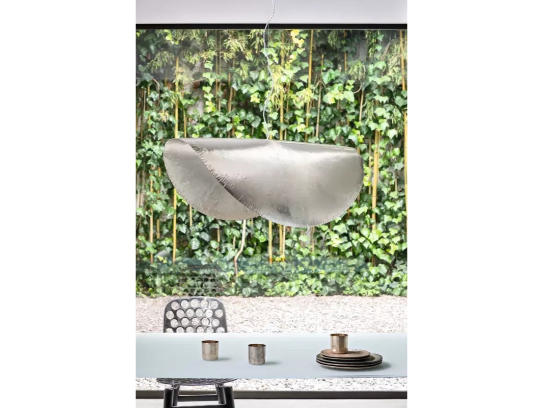 Kolekcja lamp wiszących o wyrafinowanym i współczesnym stylu, wykonanych z cienkiej płyty z niklowanego mosiądzu z księżycowymi refleksami, dostępna z delikatną krzywizną w mniejszej wersji lub mocno zaakcentowaną w większej. Można powiesić je pojedynczo lub łączyć ze sobą, aby uzyskać jeszcze bardziej filmowy efekt.