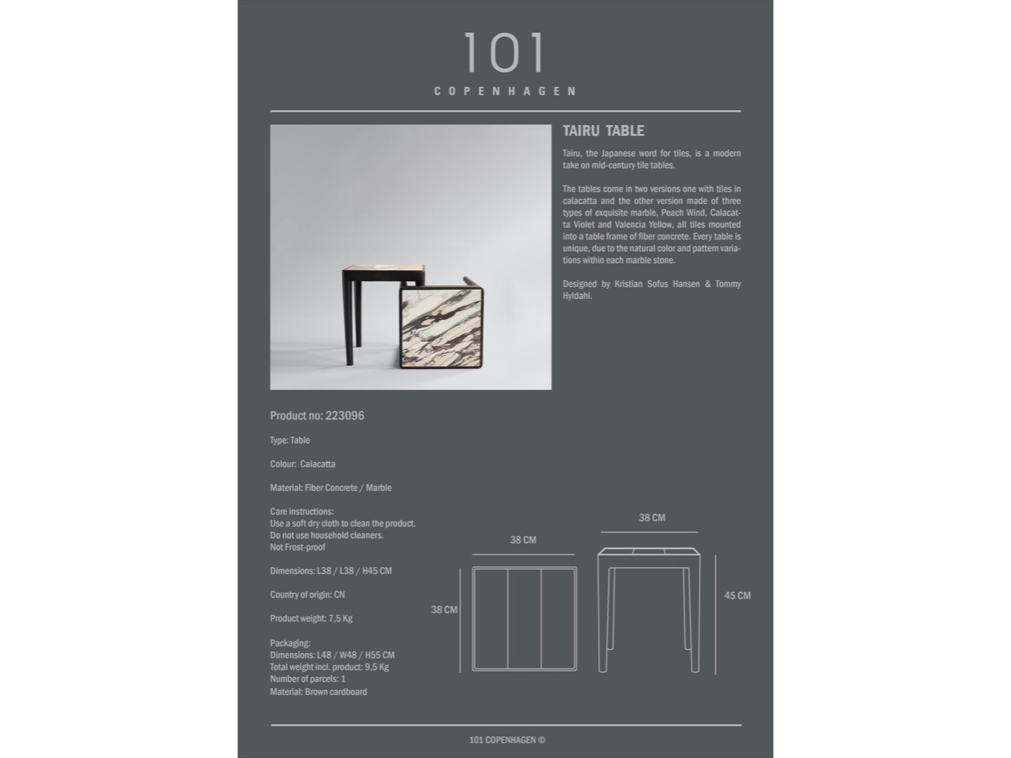 Tairu, japońskie słowo oznaczające płytki, które były inspiracją do stworzenia tego projektu. Stoły są dostępne w dwóch wersjach: Calacatta oraz wersja wykonana z trzech rodzajów marmuru, Peach Wind, Calacat ta Violet i Valencia Yellow, wszystkie płytki są zamontowane w ramie stołu z betonu włóknistego. Każdy stół jest wyjątkowy, ze względu na naturalne różnice kolorystyczne i wzory w marmurze.