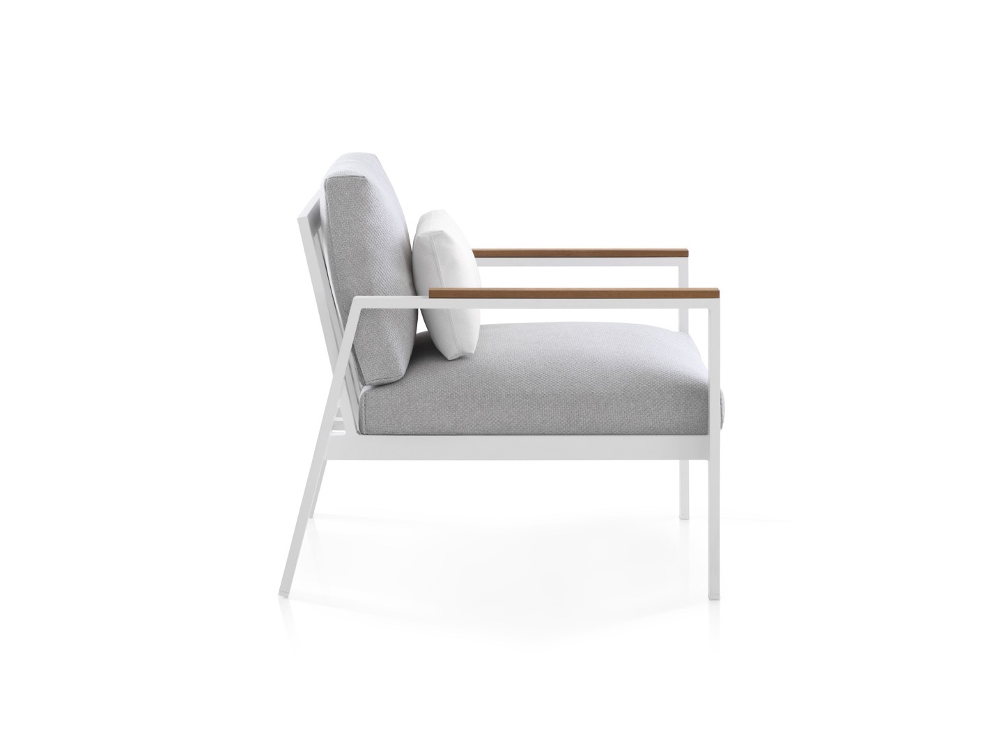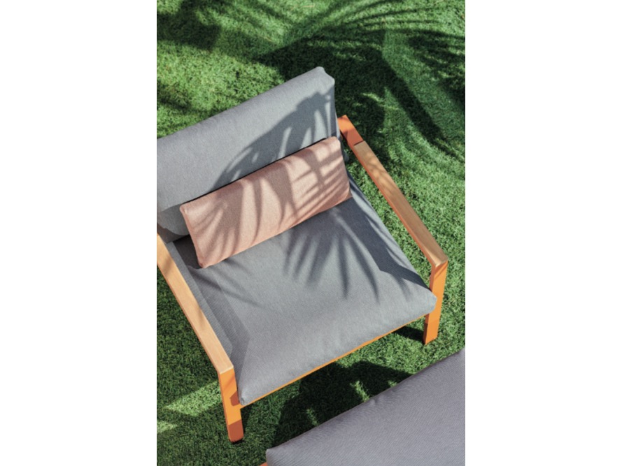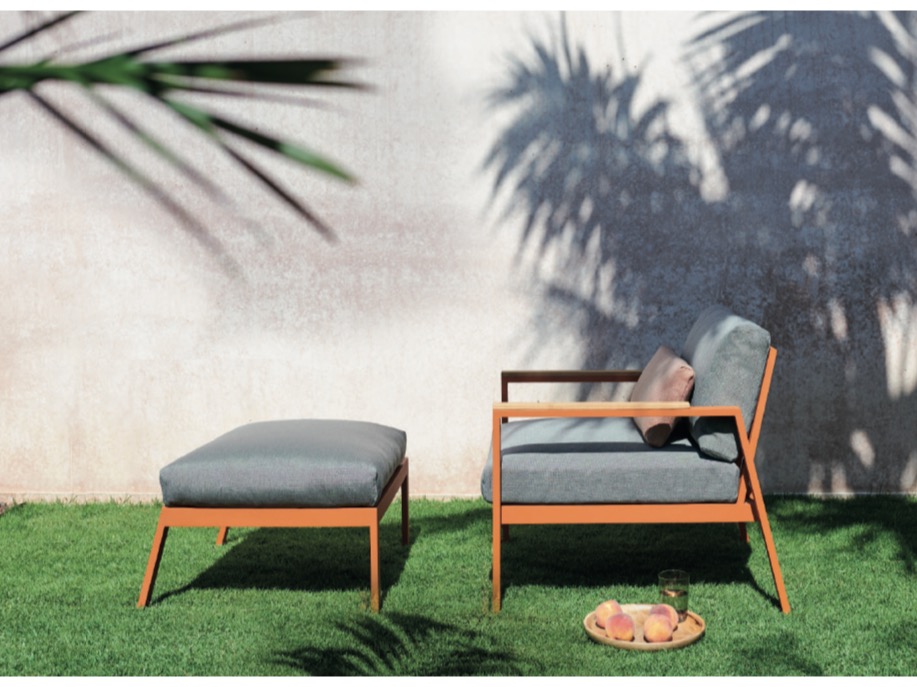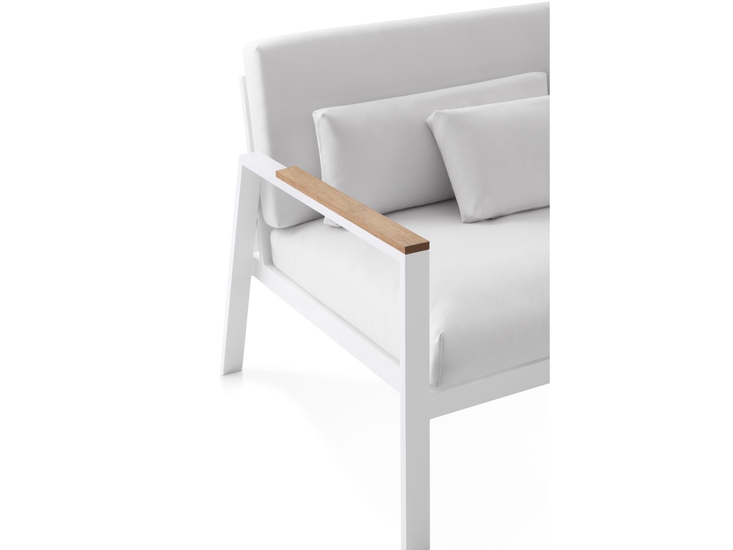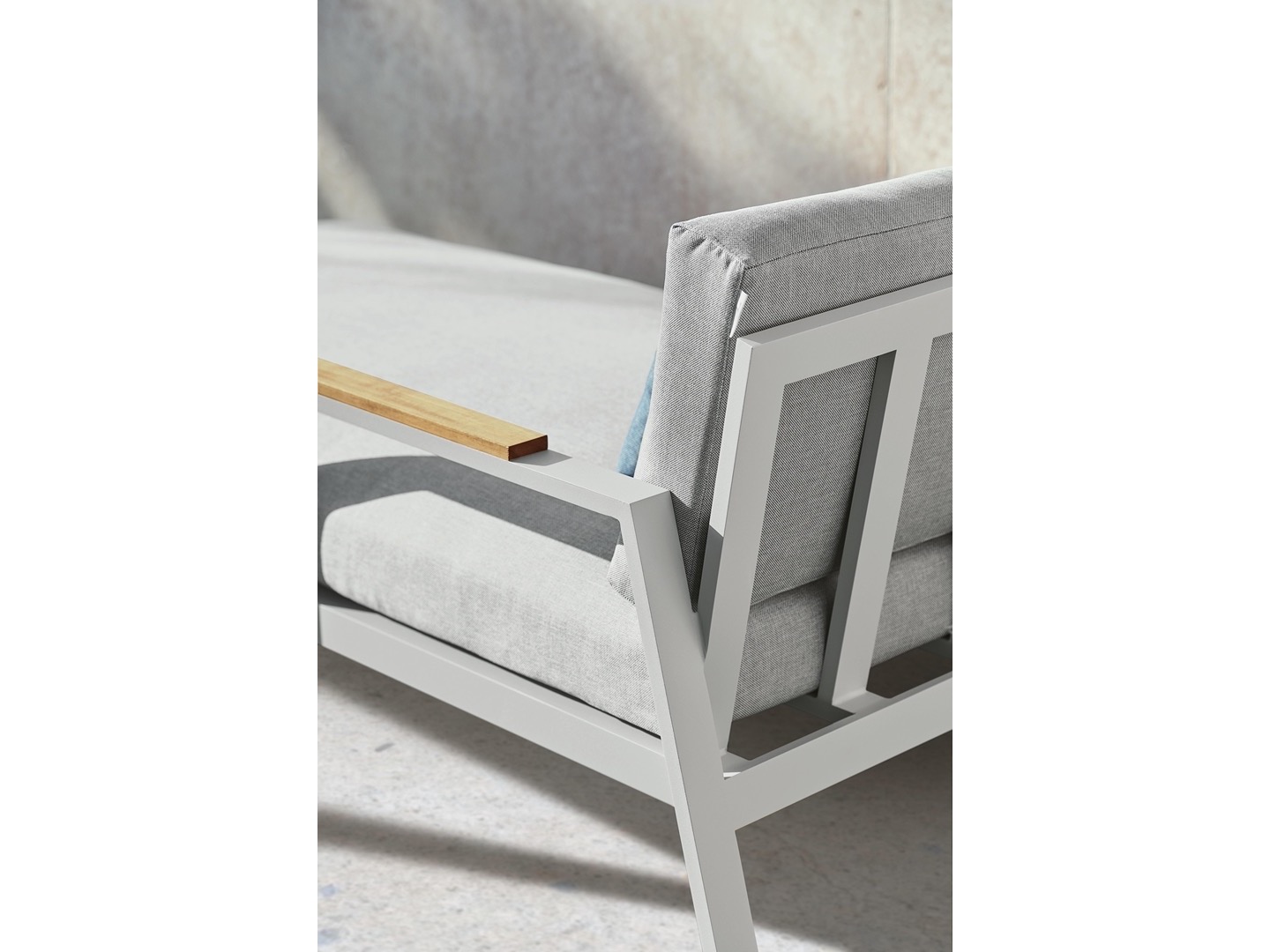 Wykonana w całości z malowanego proszkowo aluminium, drewna tekowego oraz tapicerowanych poduszek.