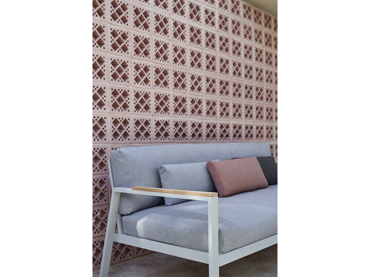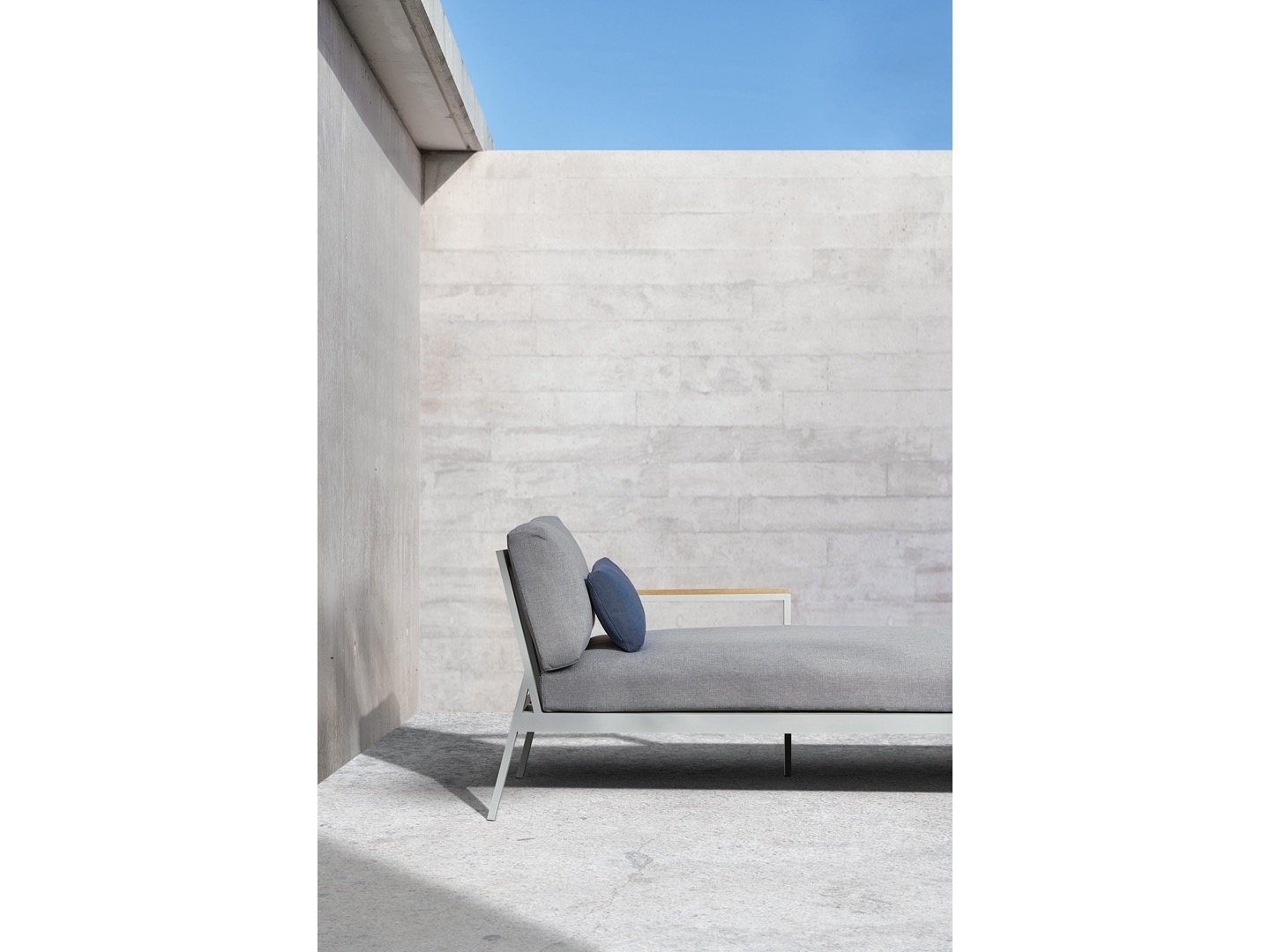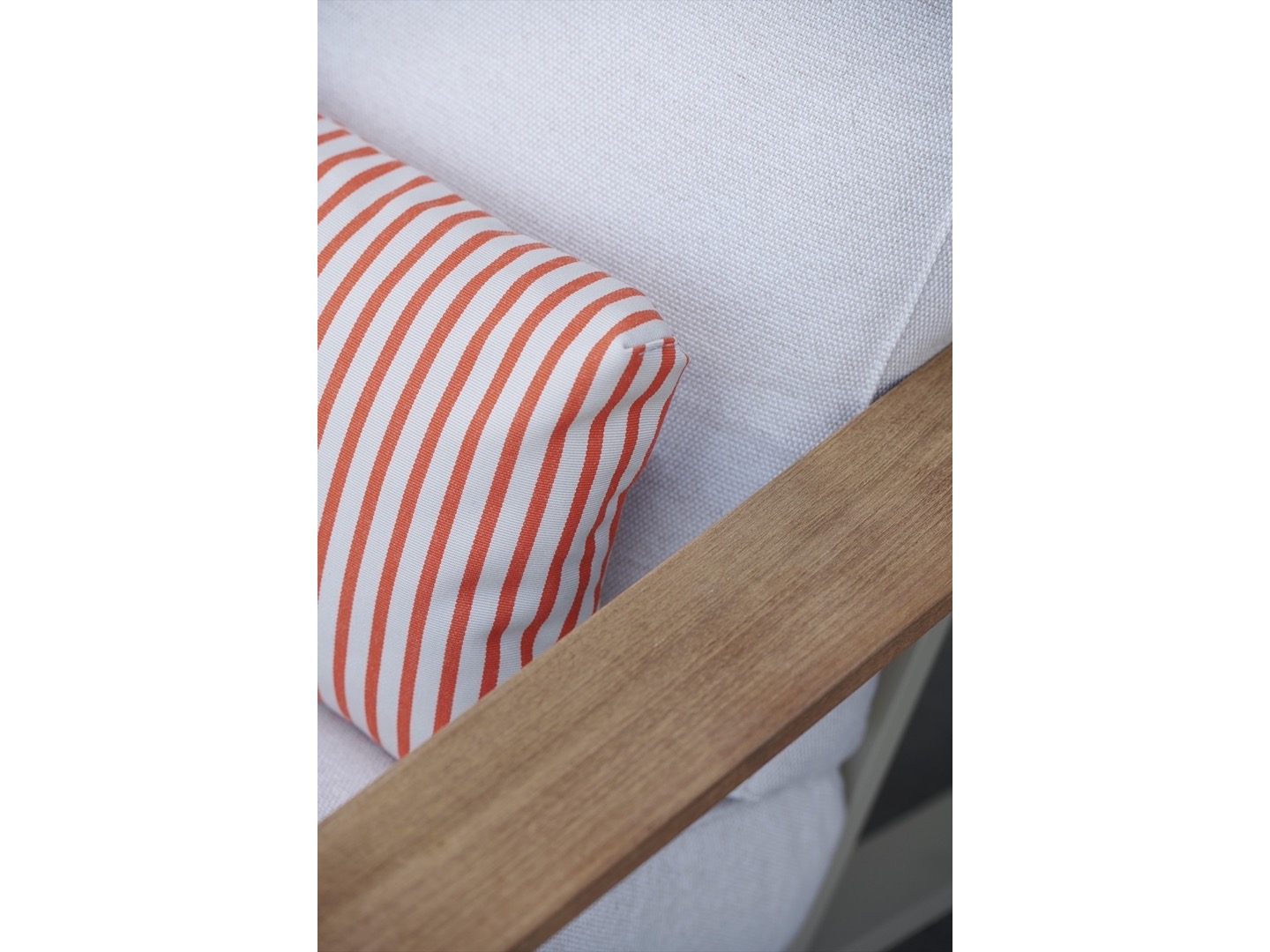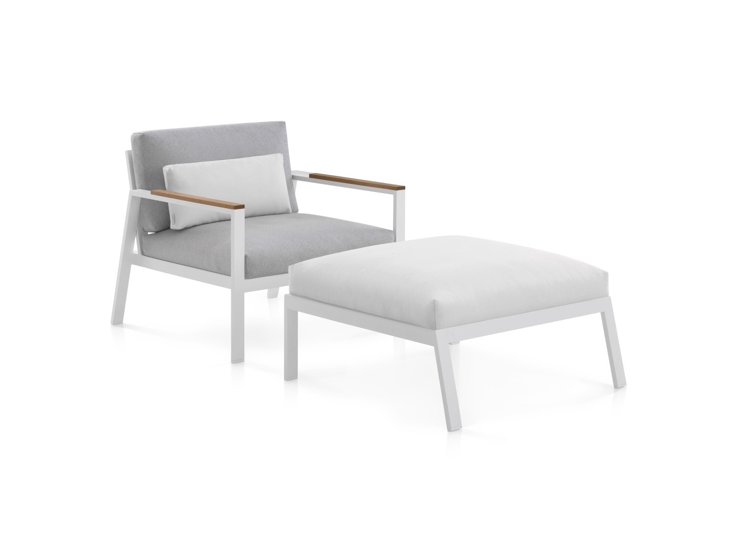 Wykonana w całości z malowanego proszkowo aluminium, drewna tekowego oraz tapicerowanych poduszek.