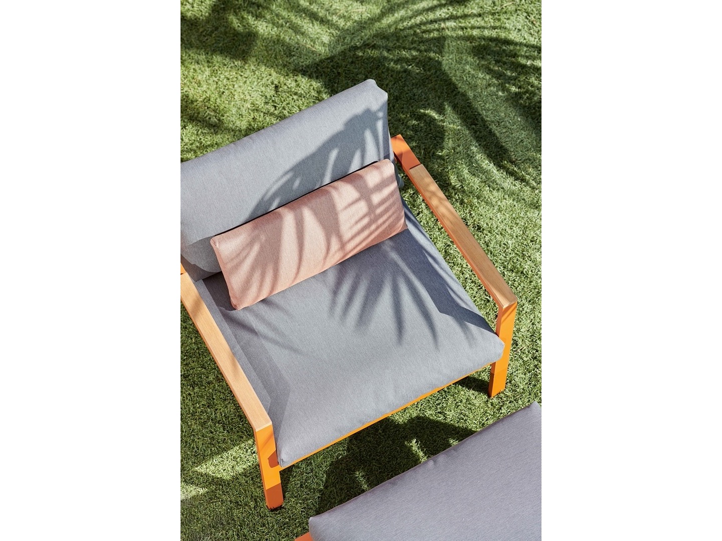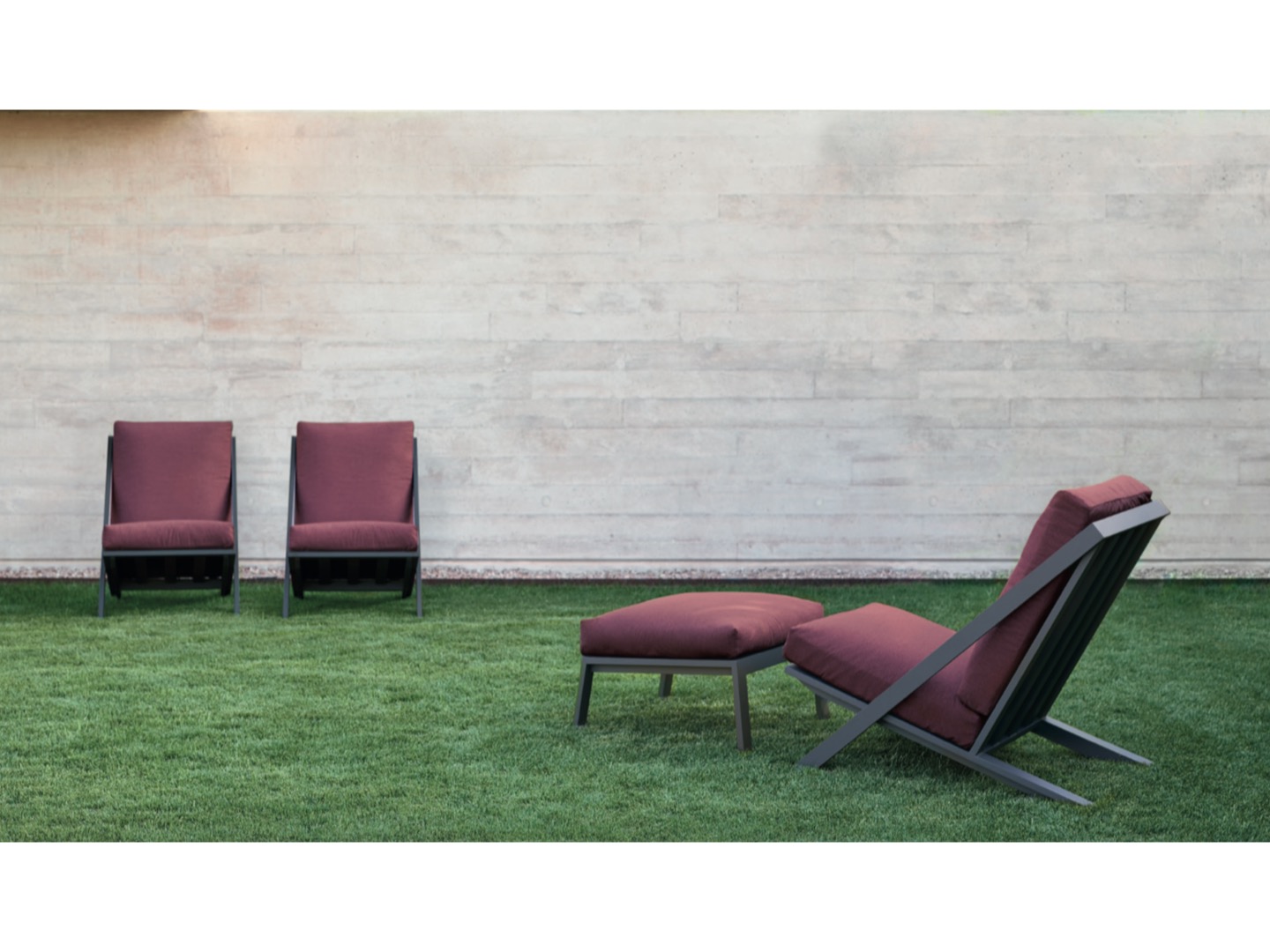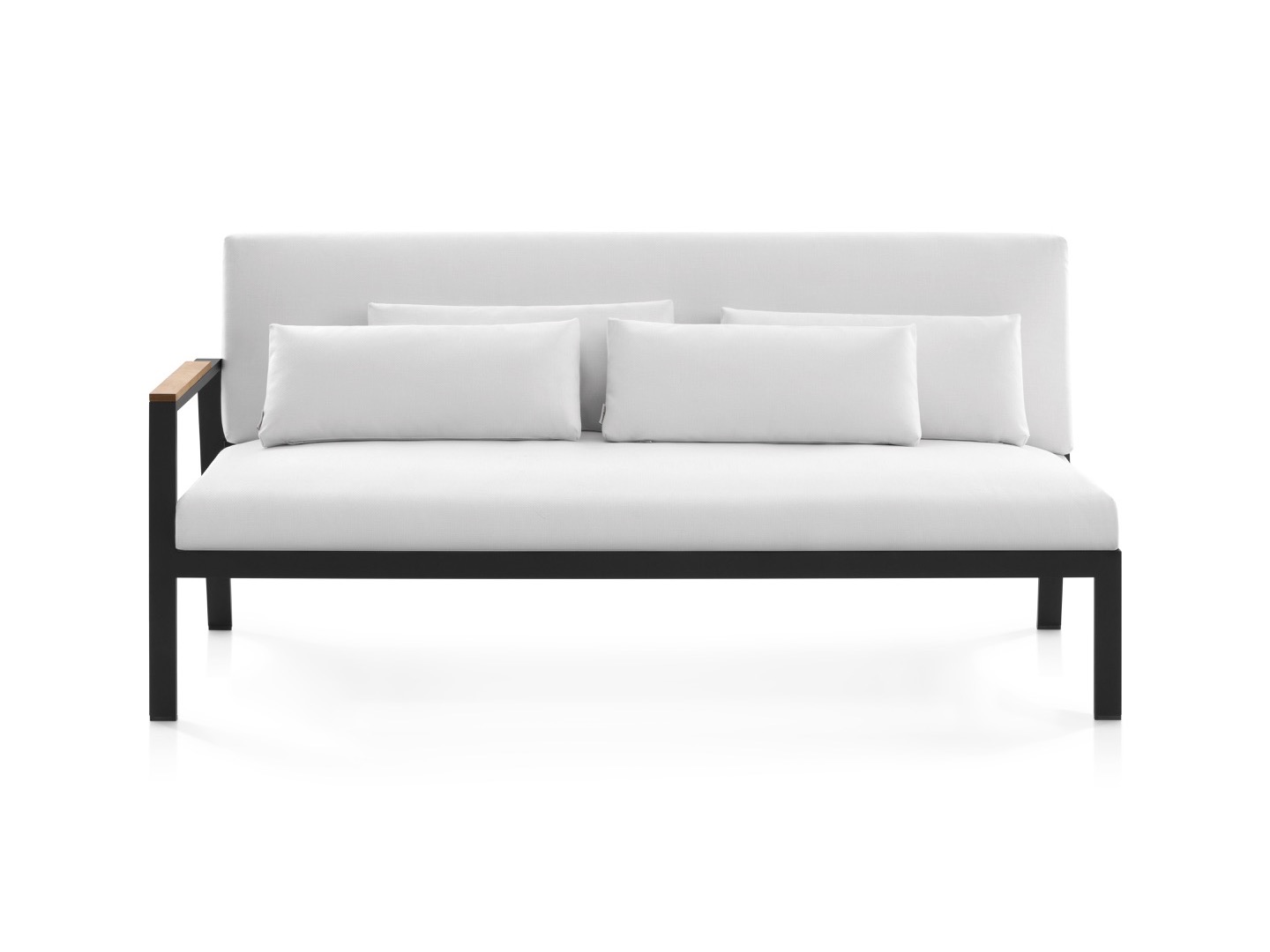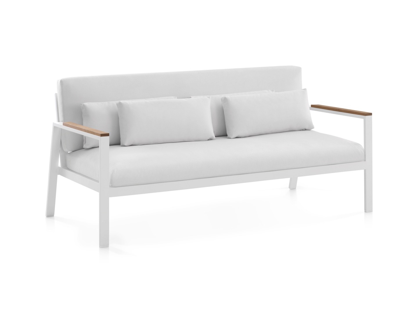 Wykonana w całości z malowanego proszkowo aluminium, drewna tekowego oraz tapicerowanych poduszek.