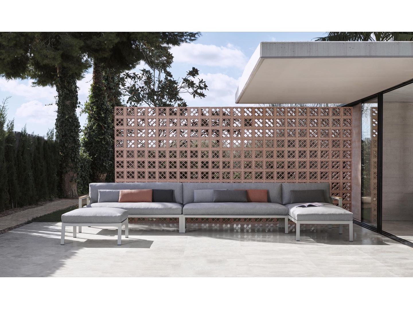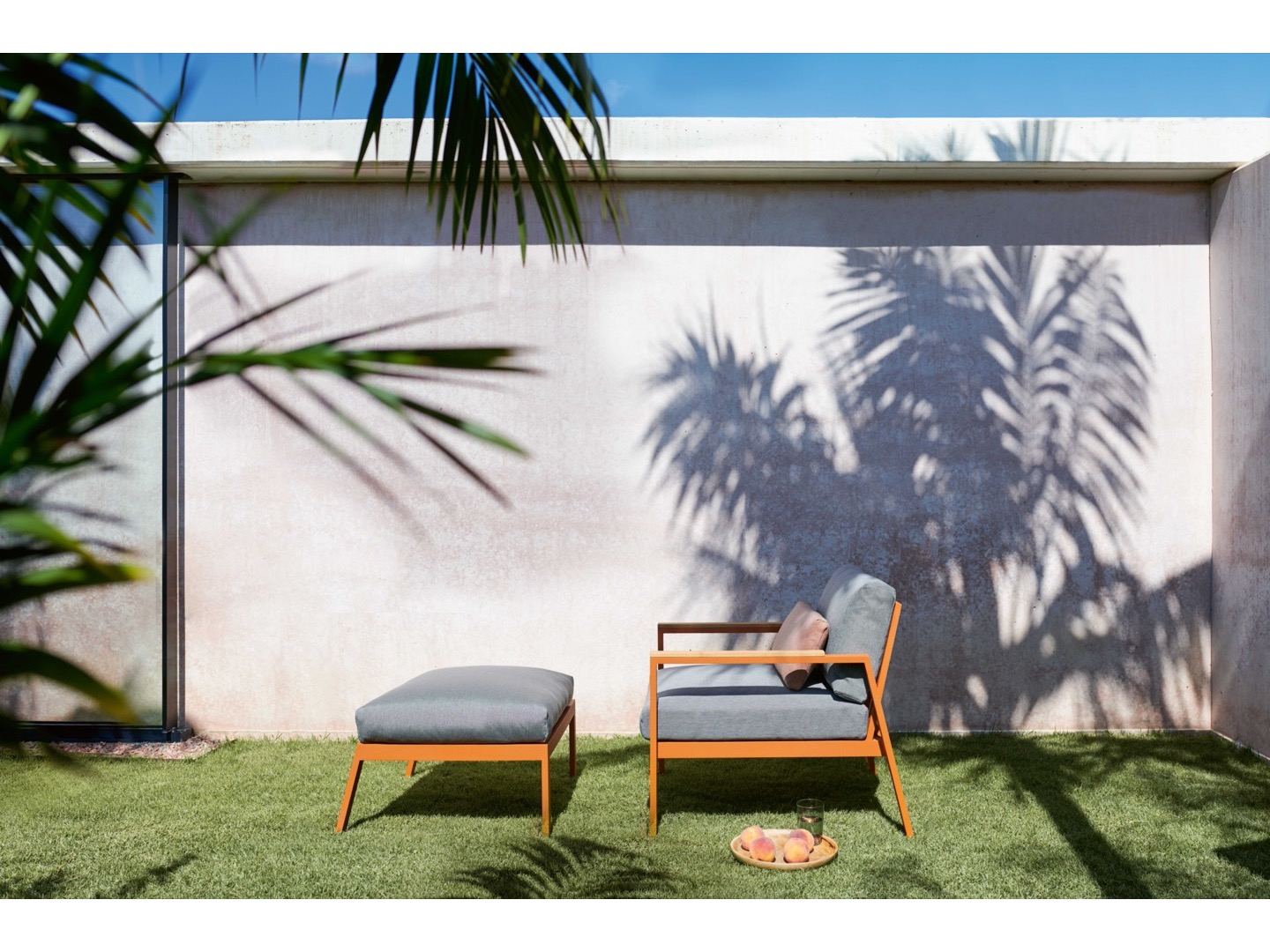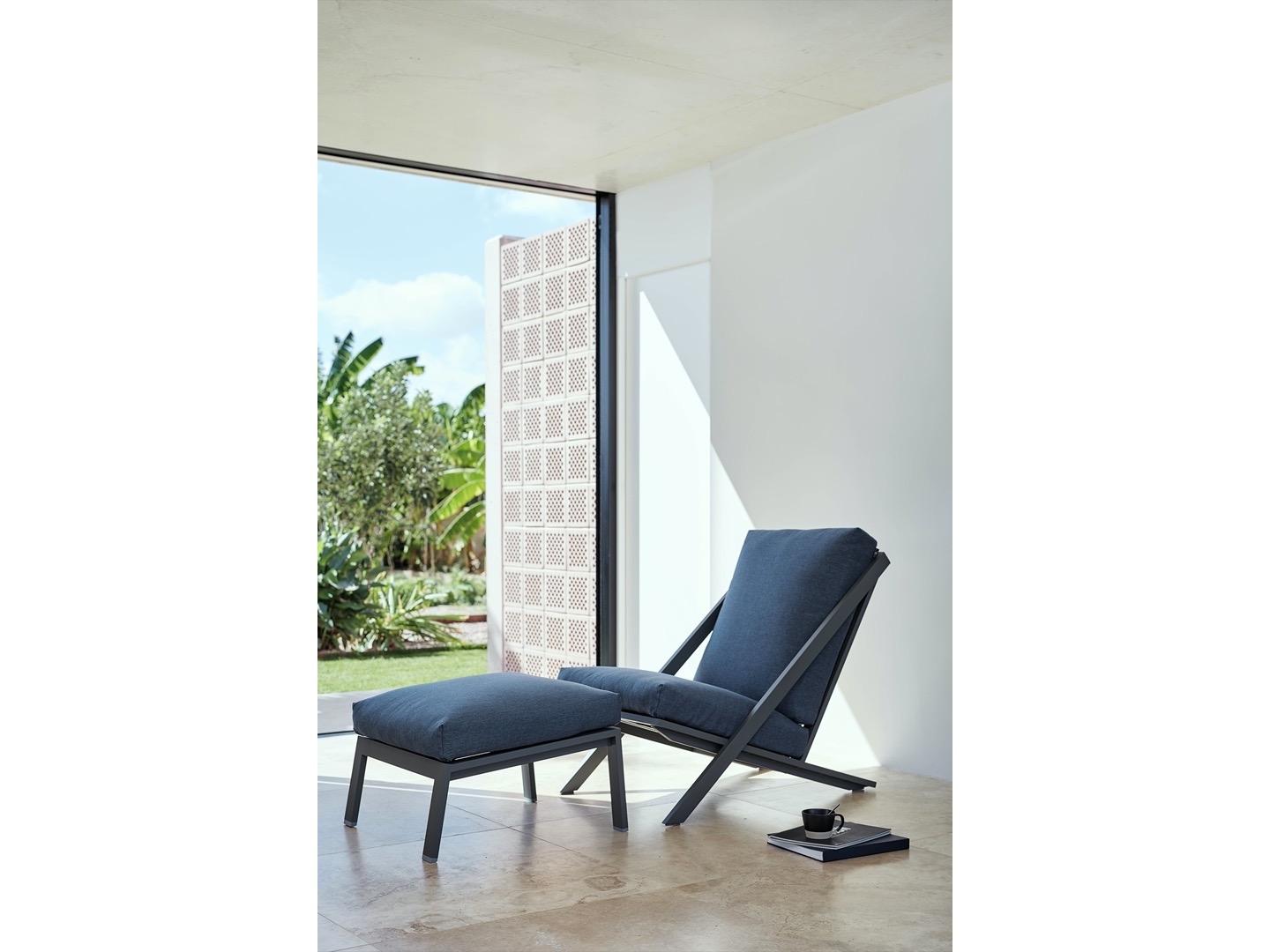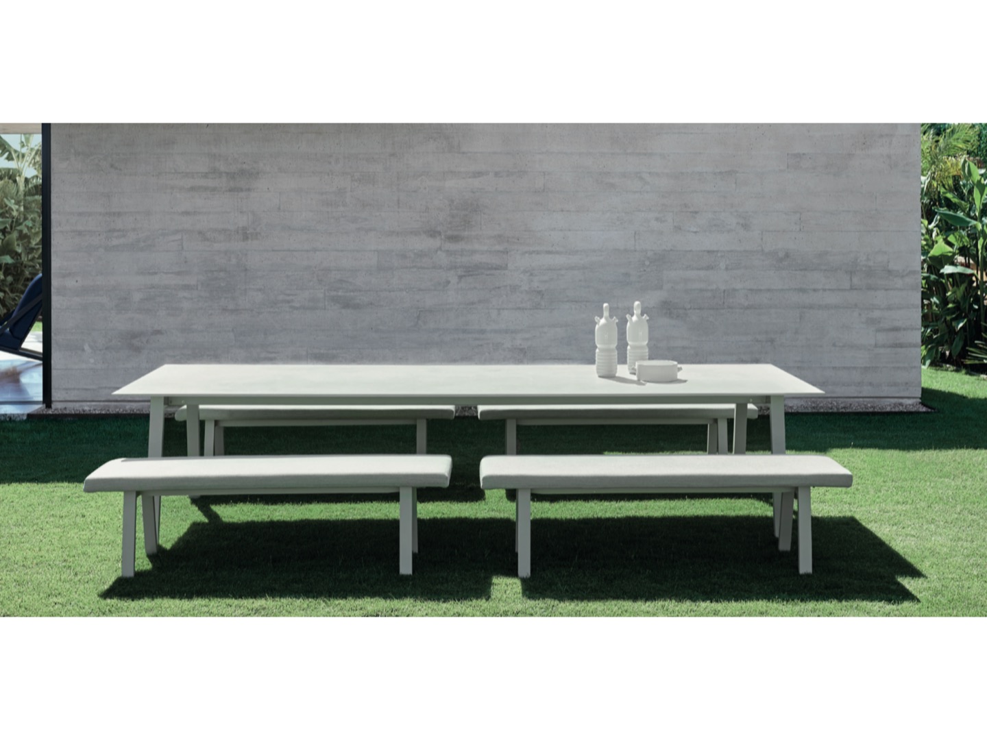 Wykonana w całości z malowanego proszkowo aluminium, drewna tekowego oraz tapicerowanych poduszek.