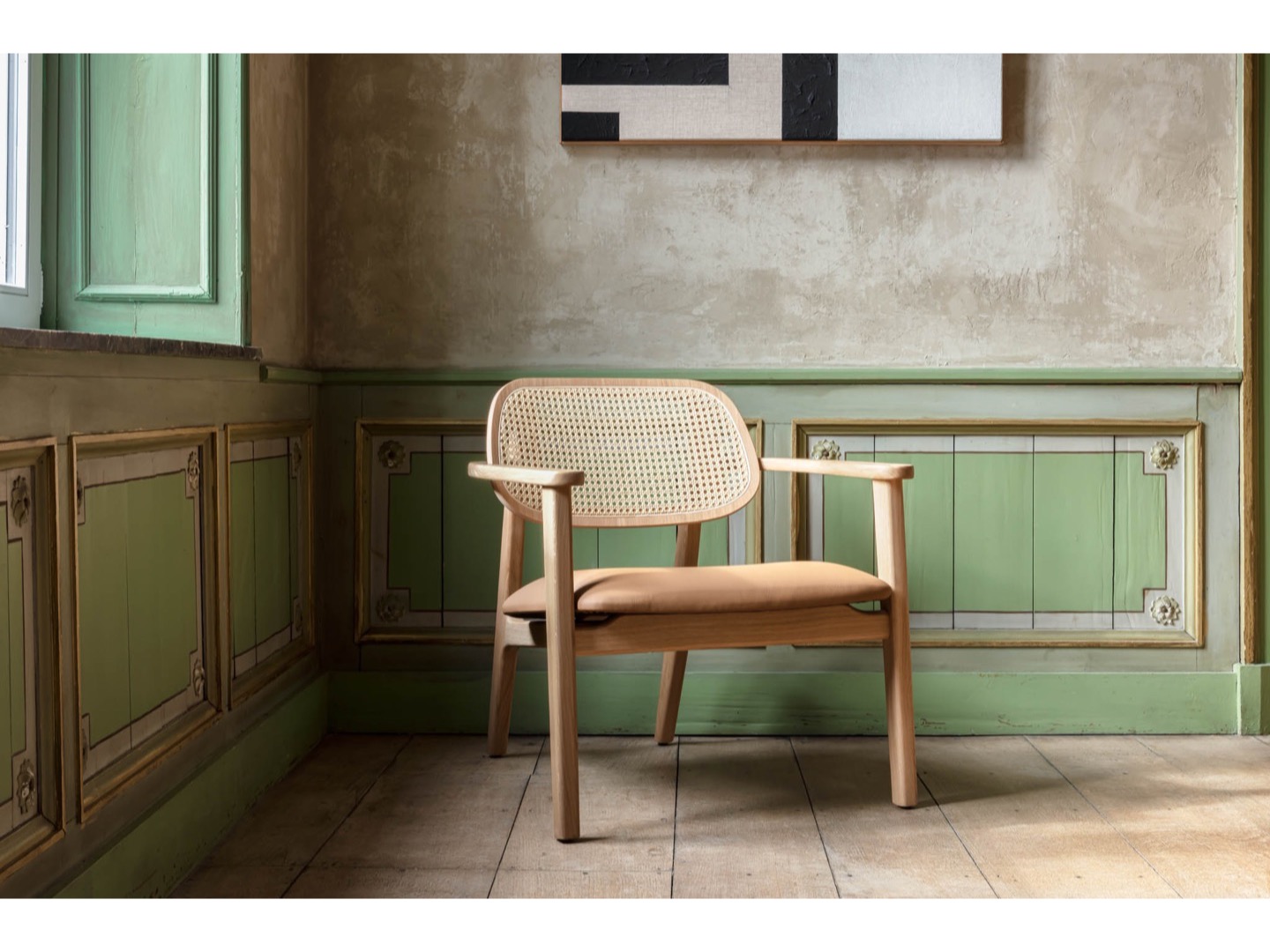 Fotel Titus ma głębokie, wygodne siedzisko i plecione oparcie z rattanu. Światło i powietrze mogą przepływać przez trzcinową powierzchnię, rzucając delikatny cień na pomieszczenie. Dostępne z ramą z czarnego dębu lub z ramą z naturalnego dębu.